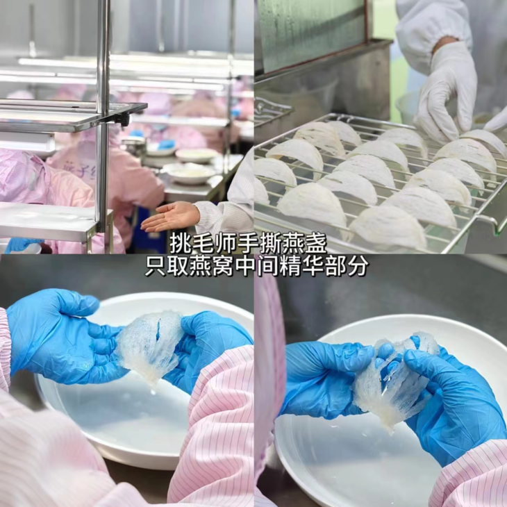 我们是有态度的燕窝 对杂质0容忍? 每一盏燕窝都要经过12道挑毛工序,才能达到用肉眼看不到杂质的标准。 我家的燕窝全部采用半干挑,保留燕窝原始的形态,泡发、味道和口感都特别好。 无菌工作间手工挑毛👇👇