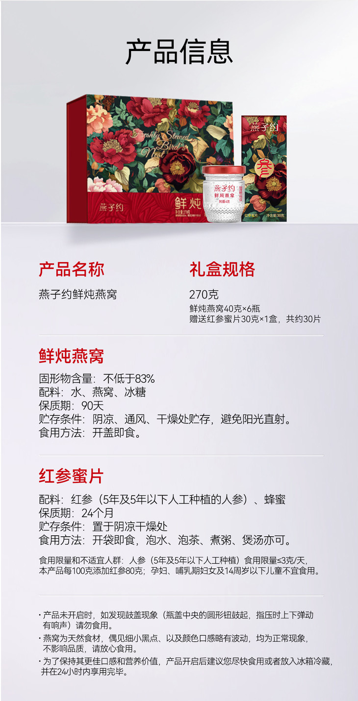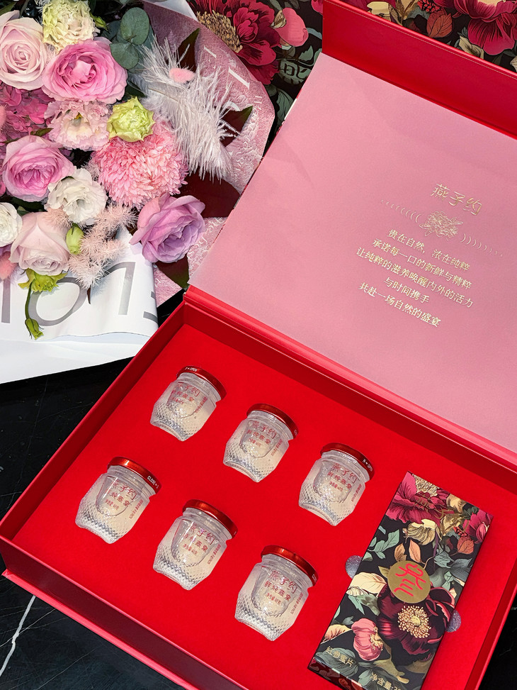 需要长期滋补、孕妈、产后恢复、精致白领、养娃、皮肤差气色不好、(长期抽烟、有呼吸道问题)需要提升肺功能、需要释压提高精力人群都可以喝! 浓浓爱意![国色芳华]限定礼盒,双重滋养力,鲜炖燕窝x红参蜜片,也是送礼的不二之选! 送爱人、送闺蜜、送长辈、送孕妇、是给爱的人最好礼物!