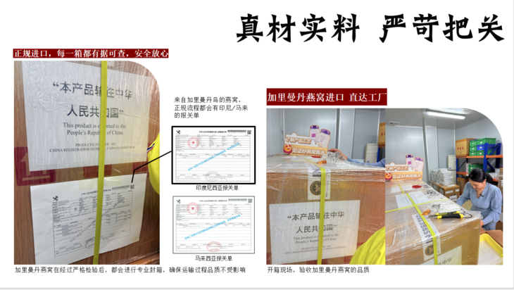 每一瓶的瓶盖上都有一个溯源码 可以追溯到燕窝原产地和整个生产流程,来自加里曼丹岛的燕窝,每一箱都有据可查,安全放心