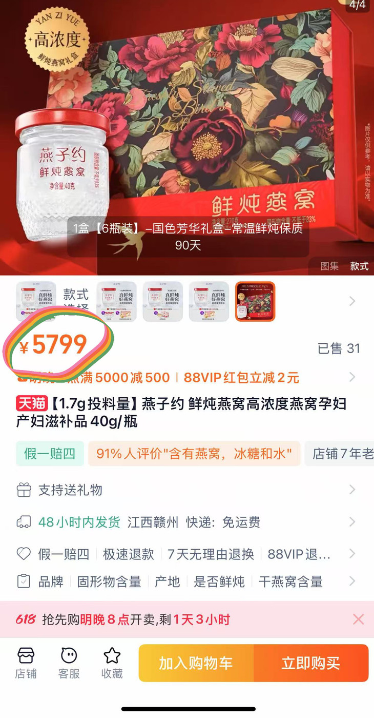 🌈燕子约~鲜炖燕窝的引领品牌!🌸行业首家CPIC百万保险燕窝品牌~ ❤️【燕子约鲜炖燕窝礼盒】某宝5799/盒! 618大促❗️❗️ 🔴燕窝固体含量高达83%以上❗