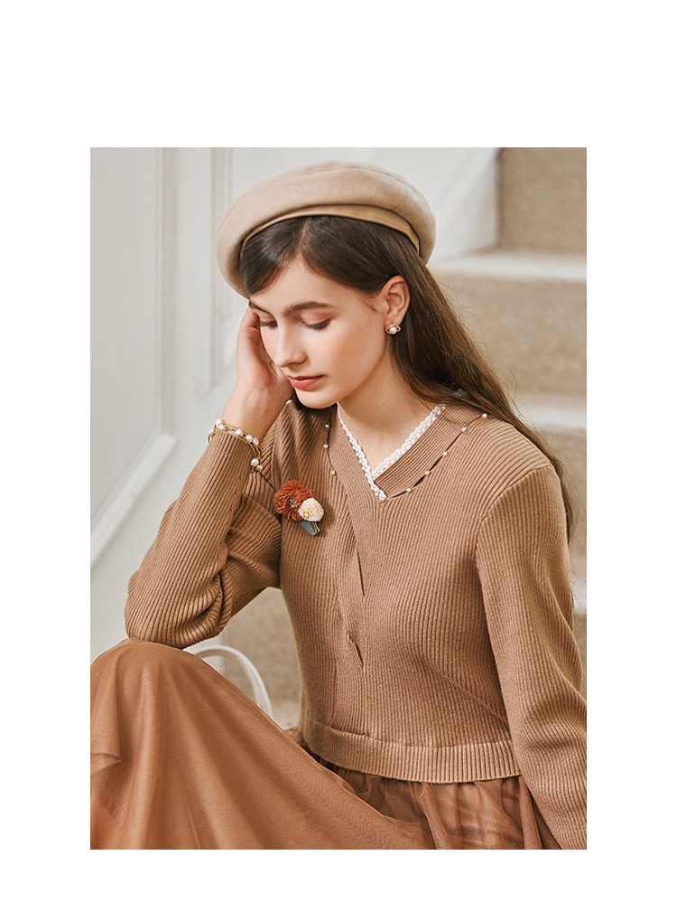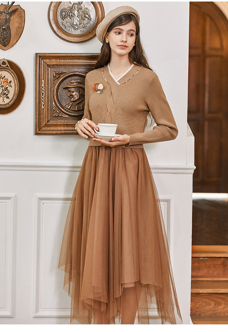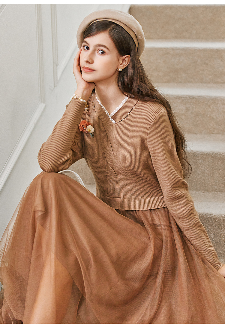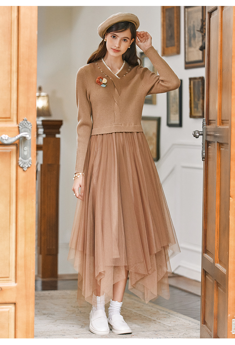 Famecoco范可儿千金感钉珠针织网纱连衣裙FAB8FA033