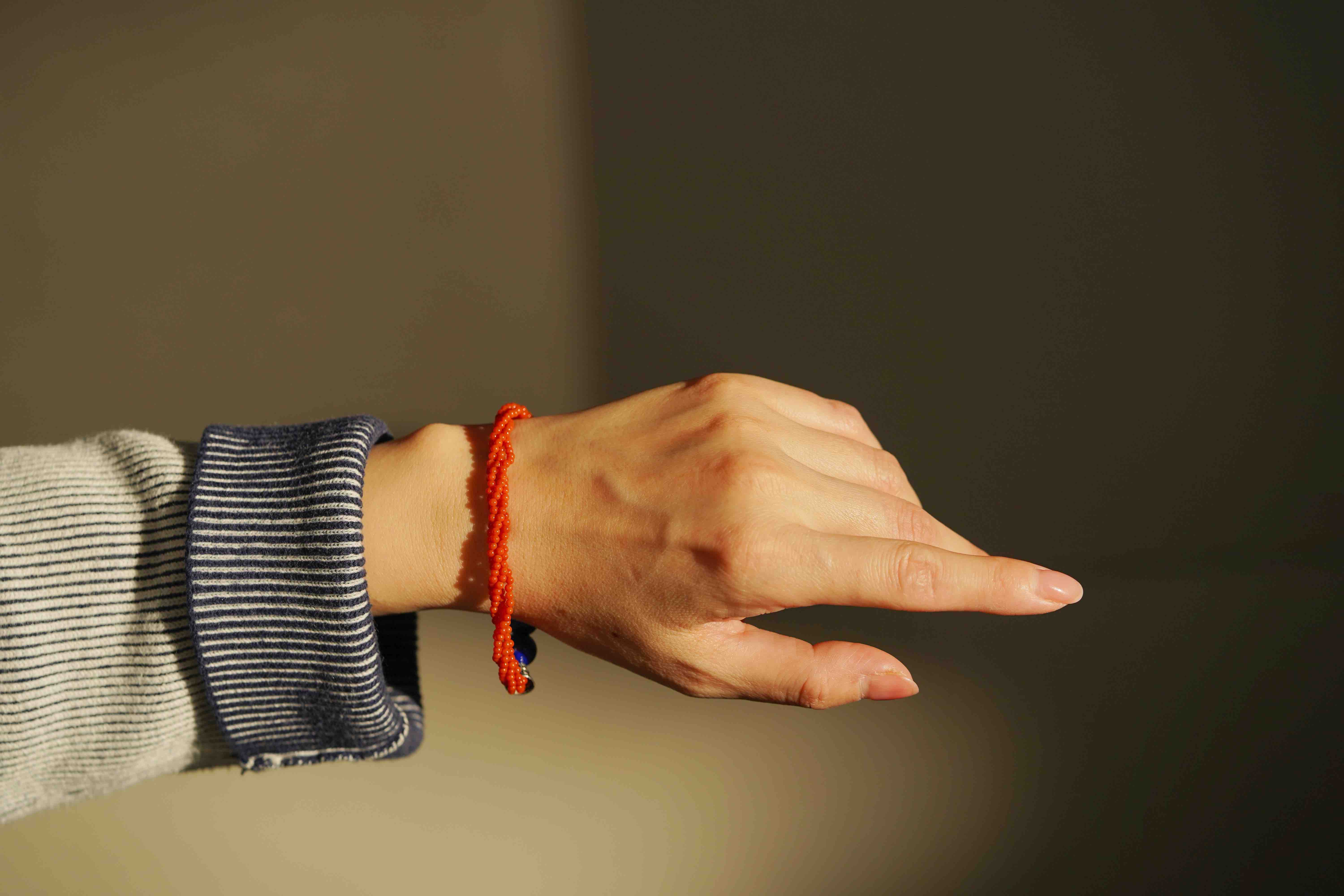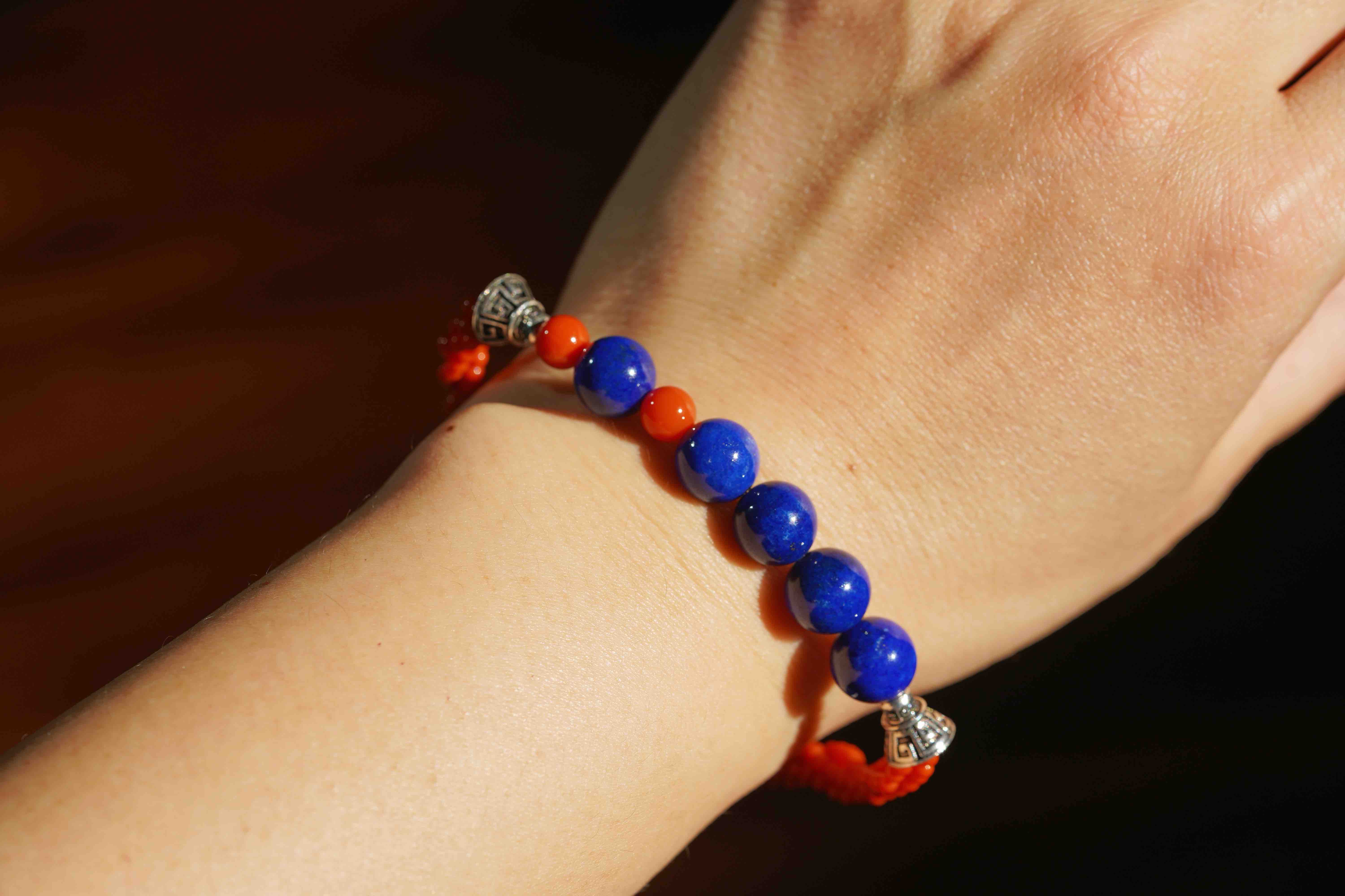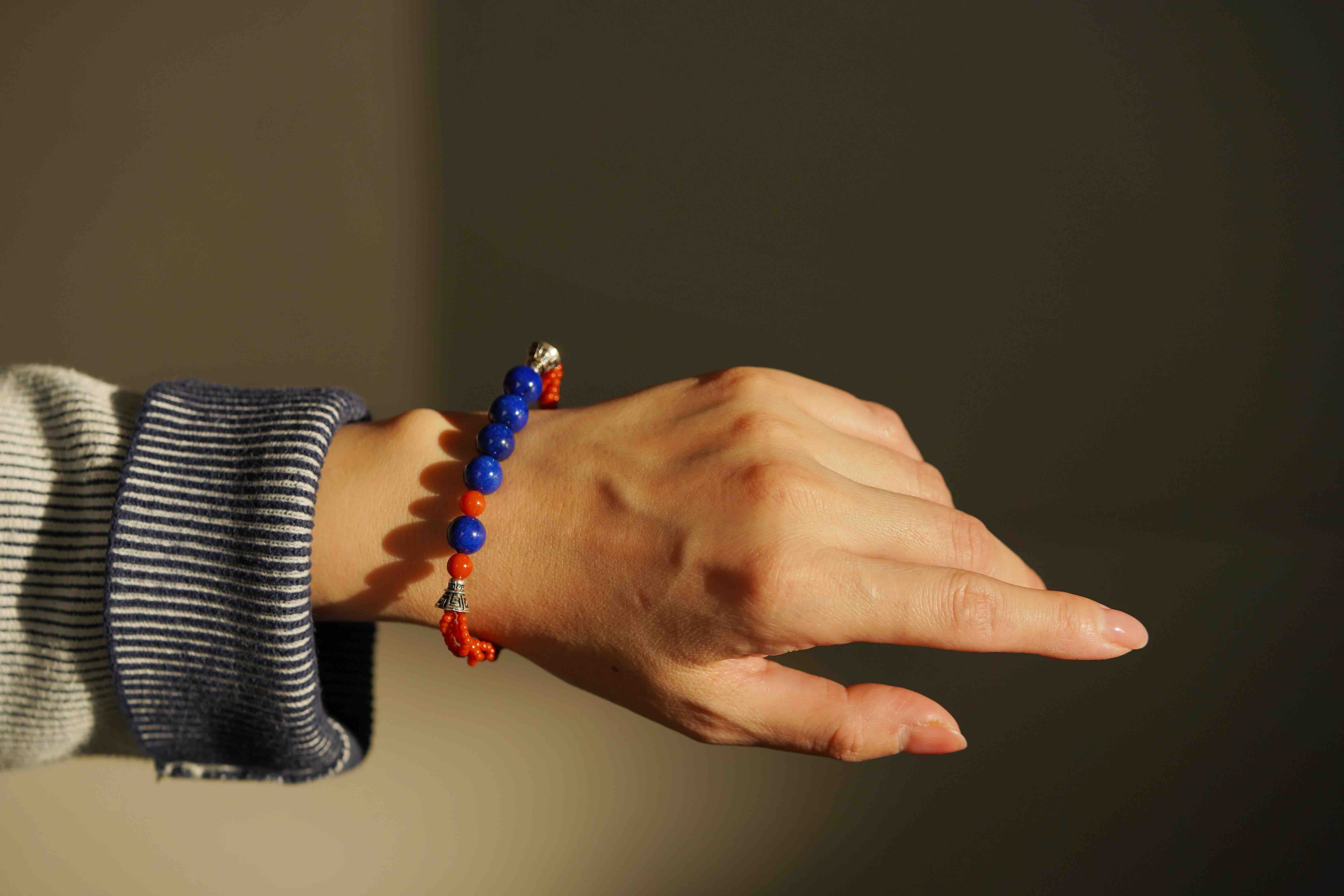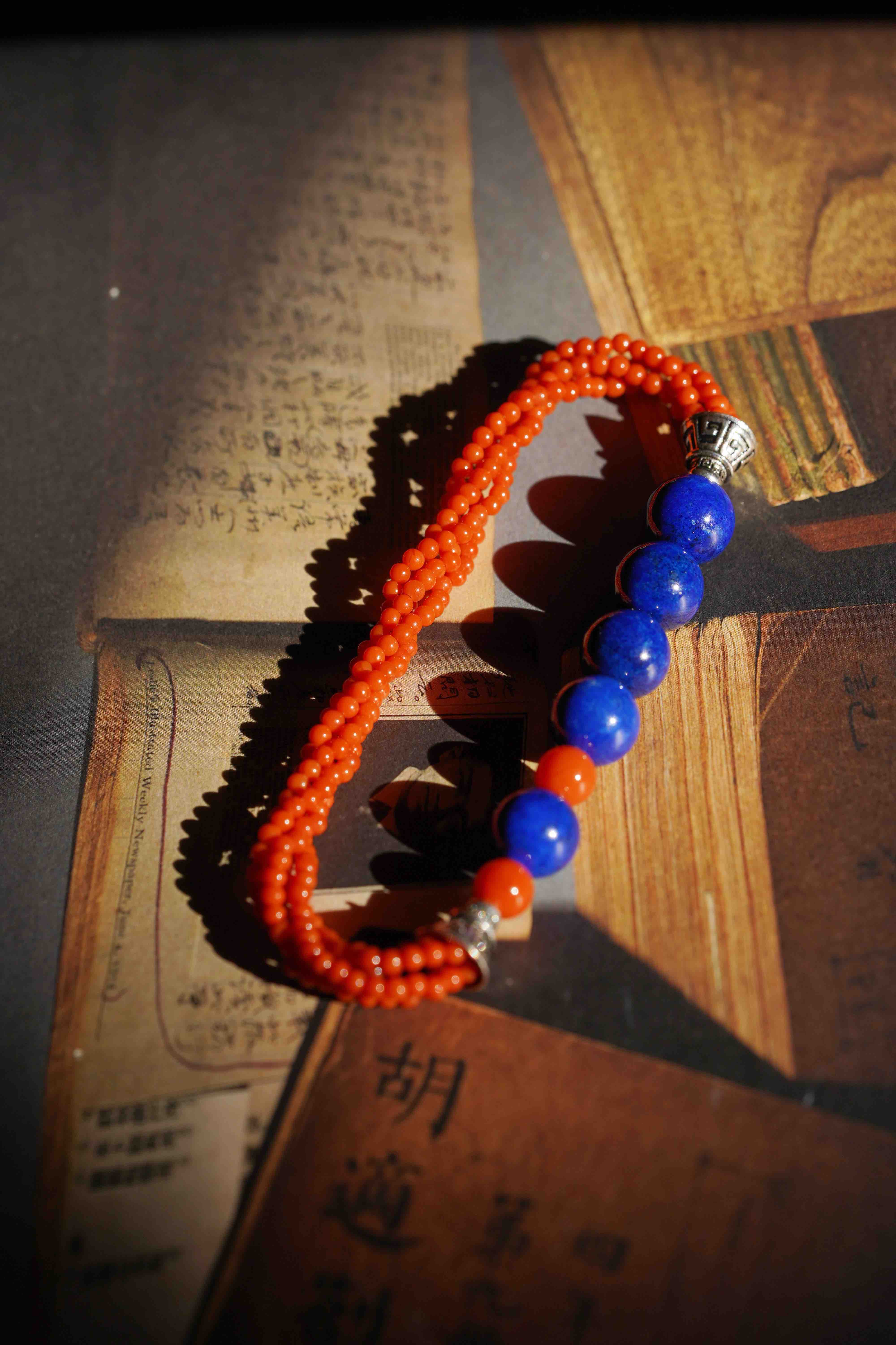 这一条南红,突破传统,用小珠子做的麻花的形态,青金点缀,天坛配色。