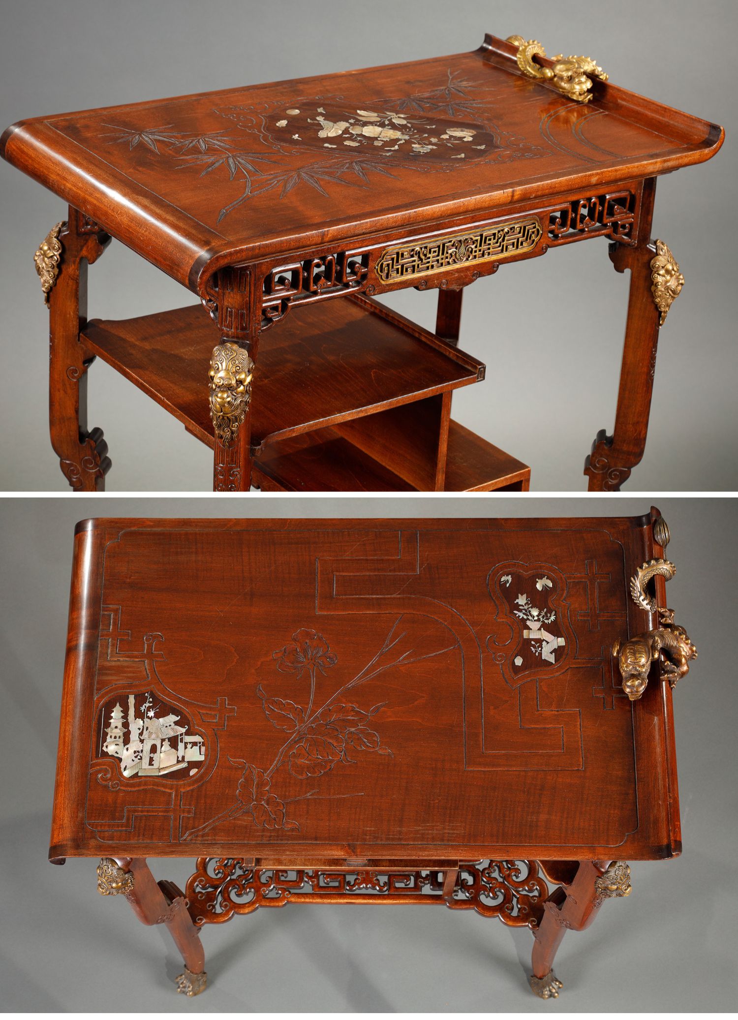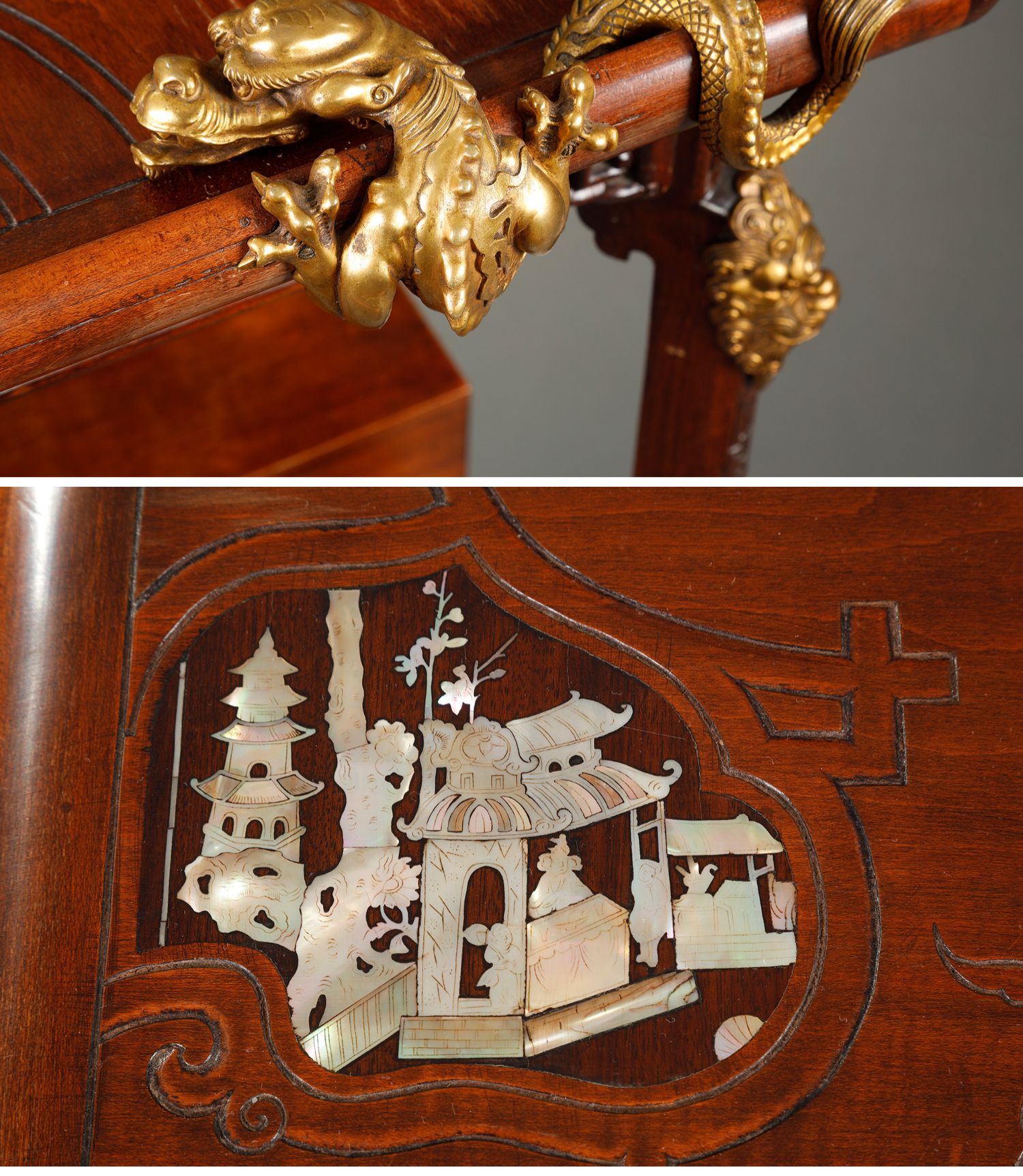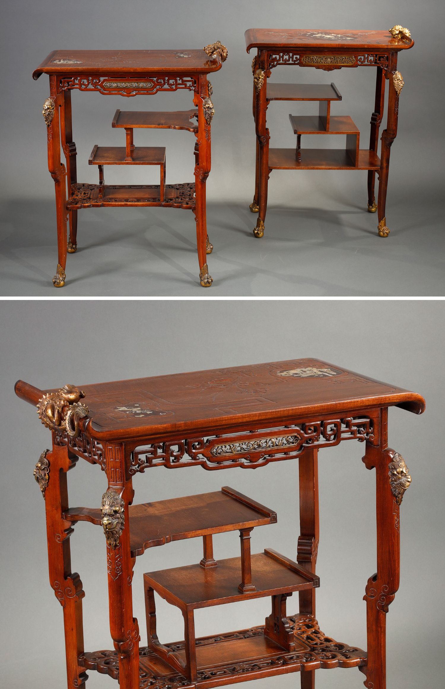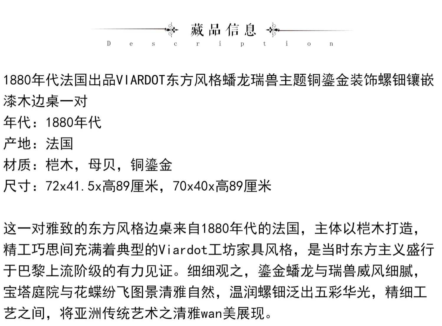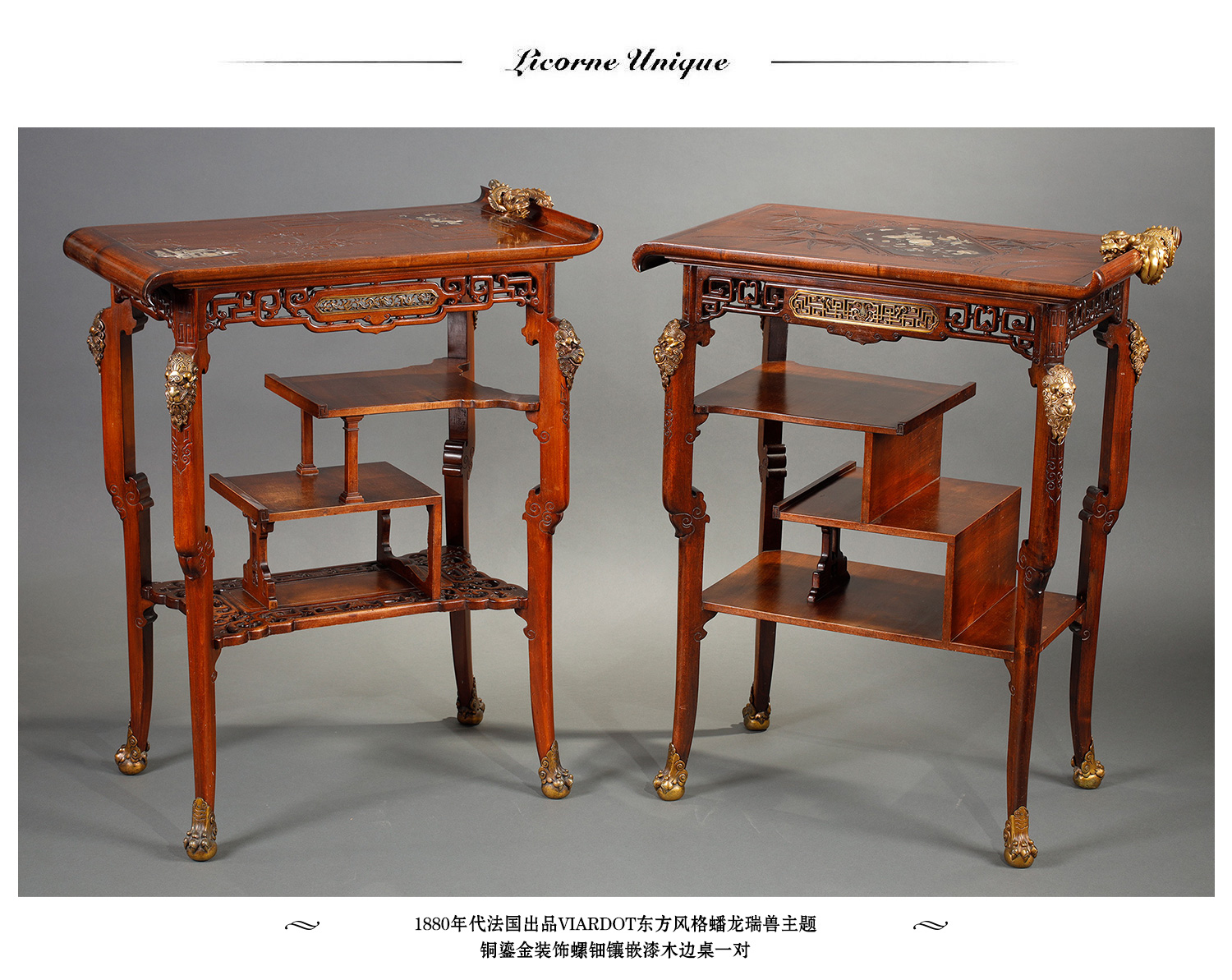 独角鹿西洋古董家具VIARDOT蟠龙瑞兽铜鎏金螺钿镶嵌漆木边桌一对