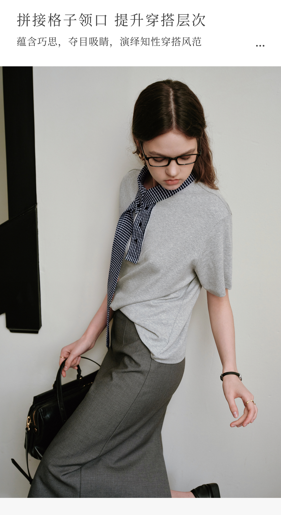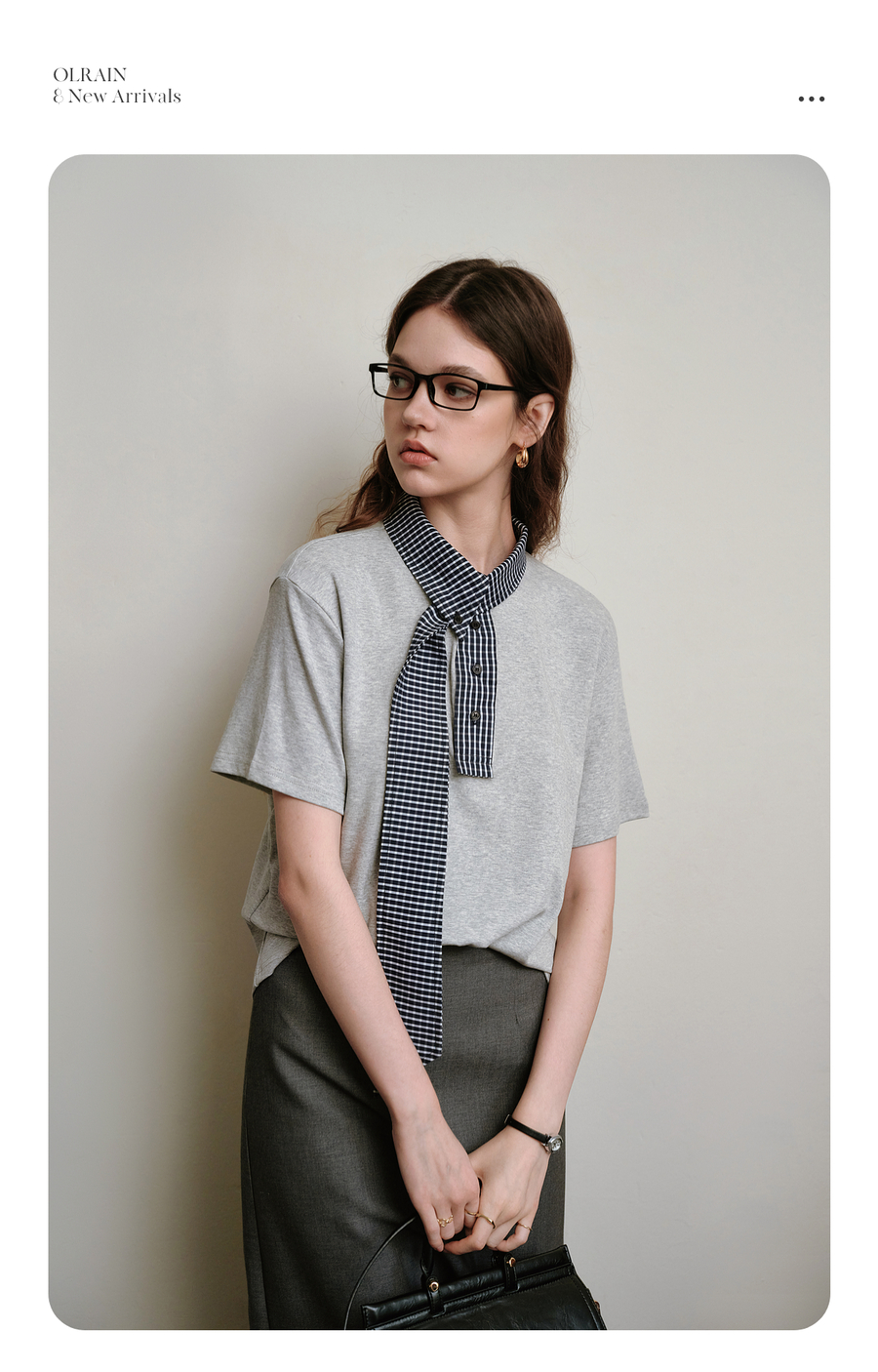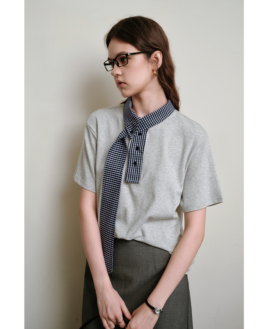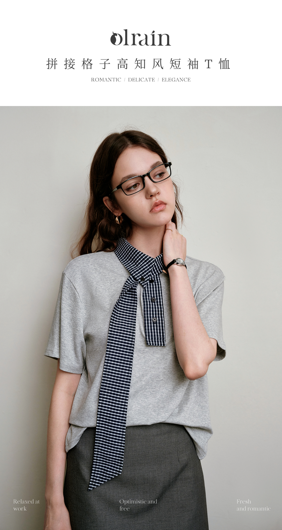 OLrain欧芮儿拼接格子高知风短袖T恤夏季2025新款通勤风灰色上衣
