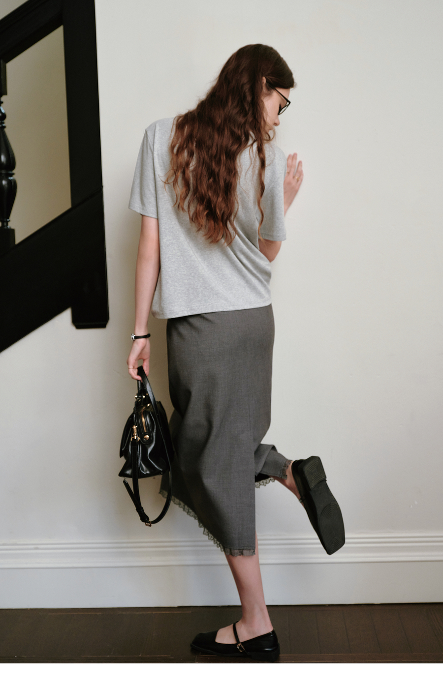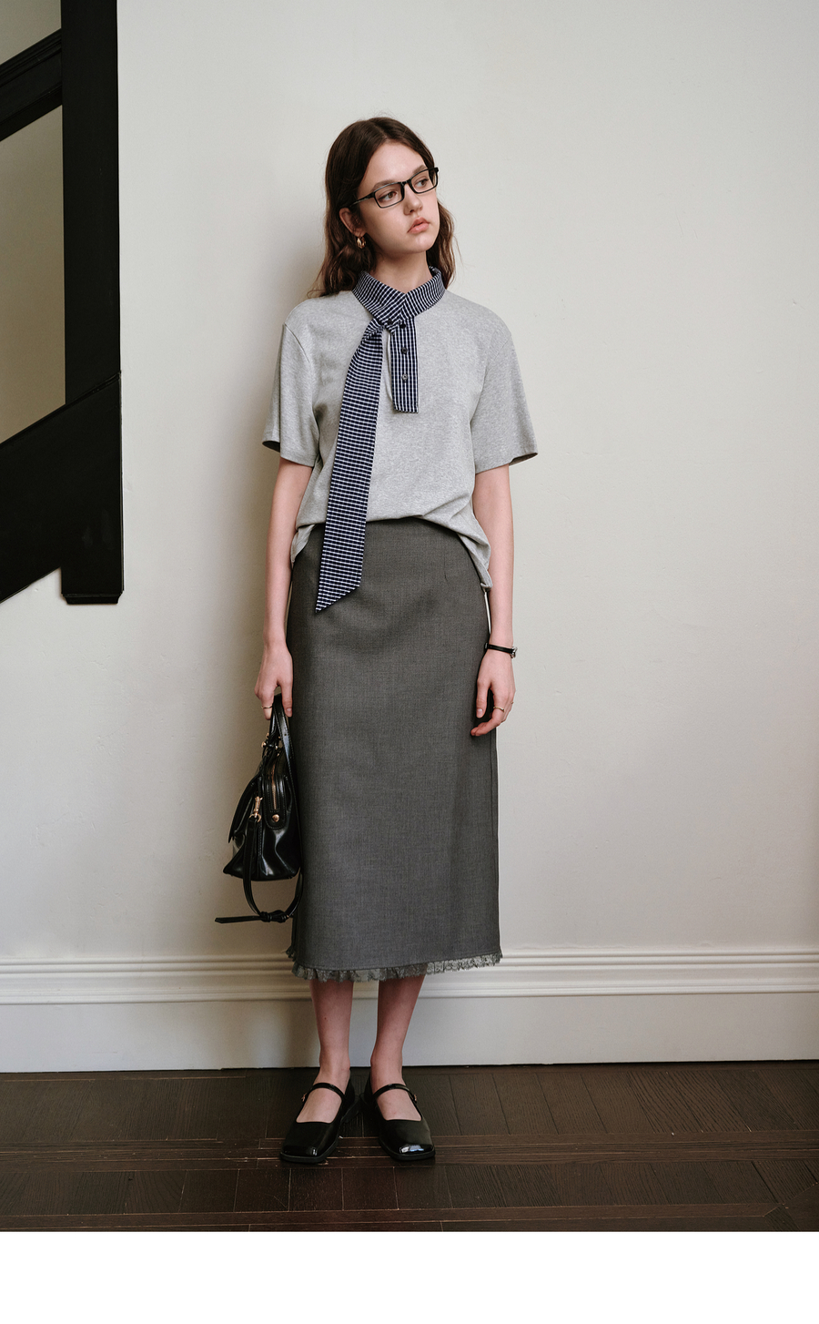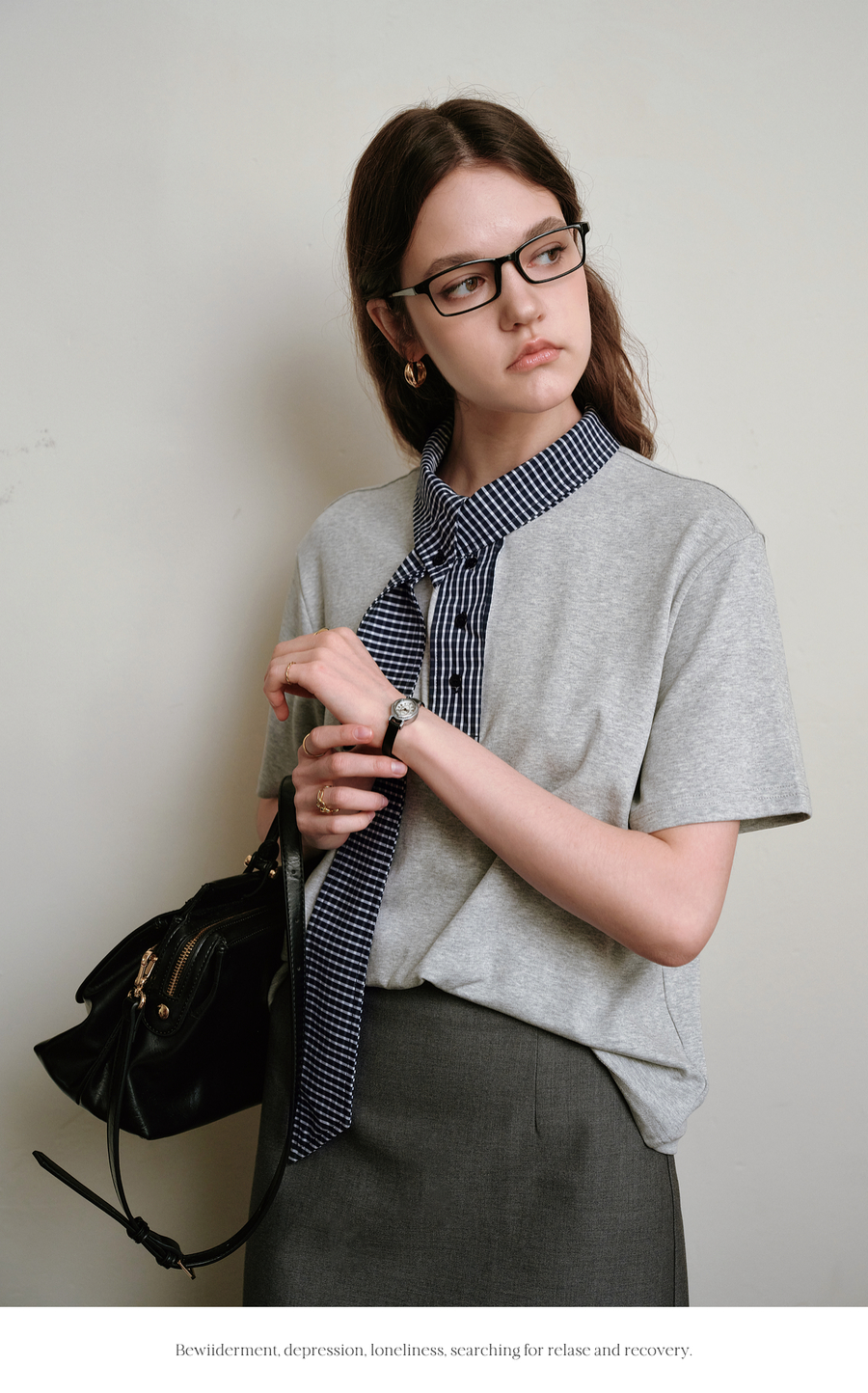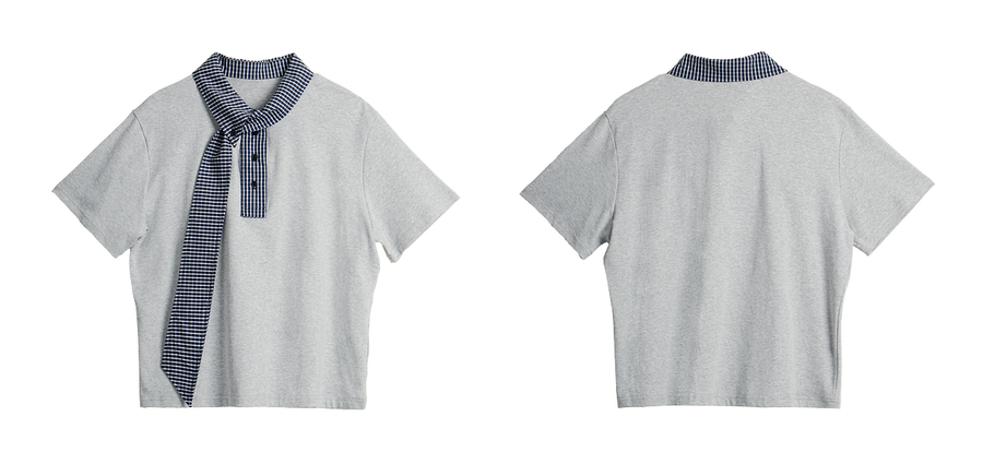 OLrain欧芮儿拼接格子高知风短袖T恤夏季2025新款通勤风灰色上衣