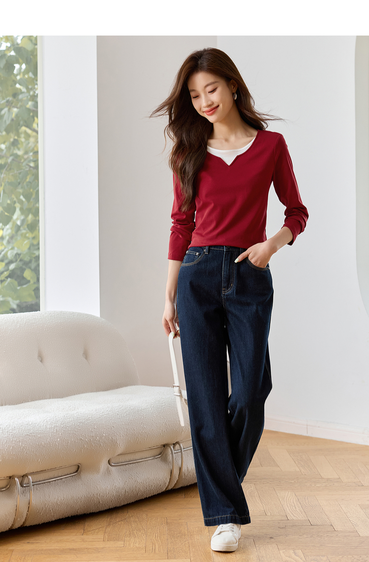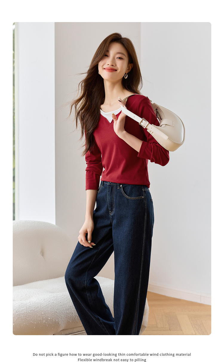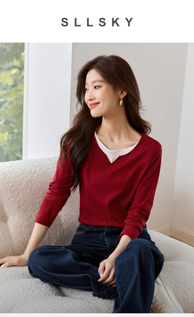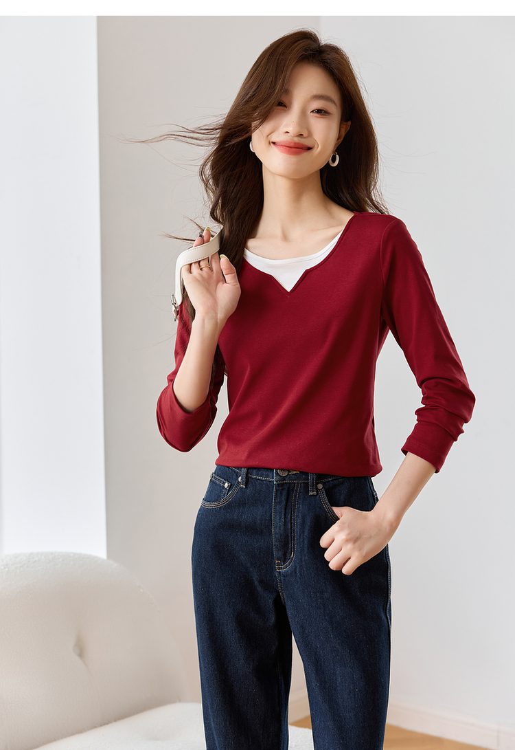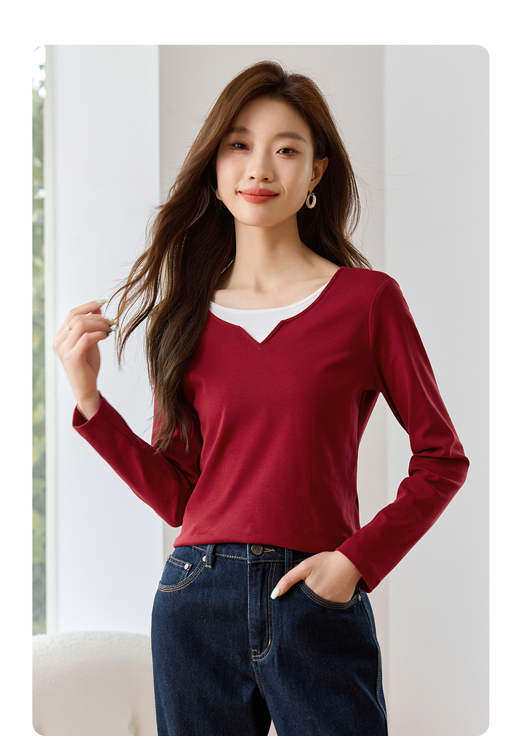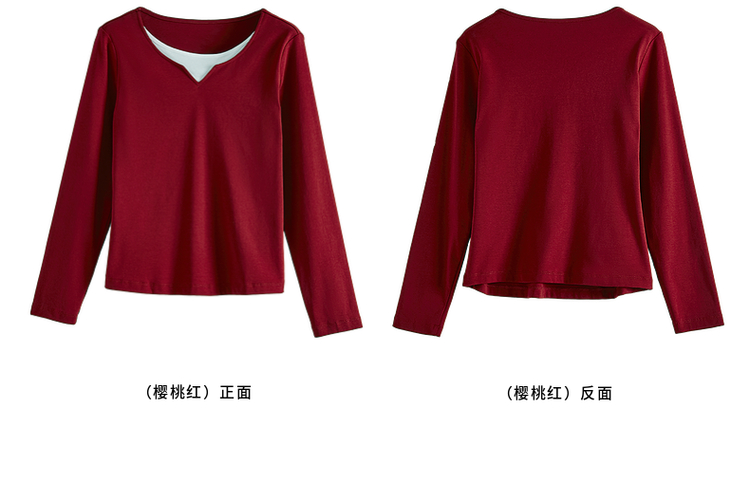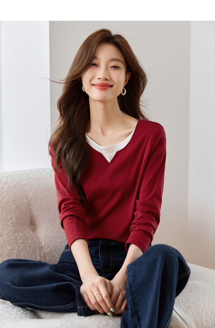 【专属特价】熙世界时尚假两件红色t恤2025秋季新款显瘦长袖内搭打底衫上衣
