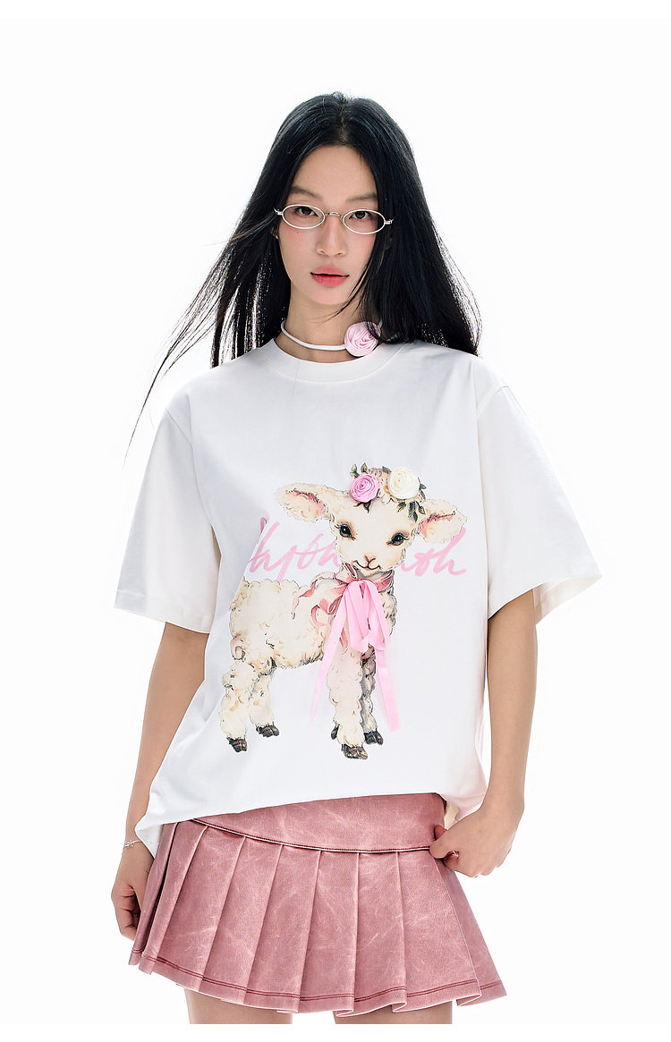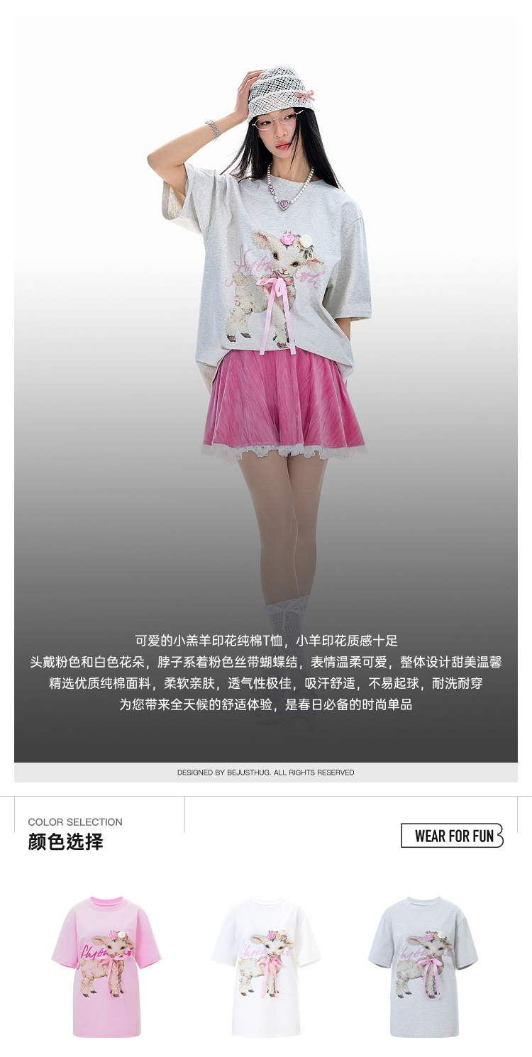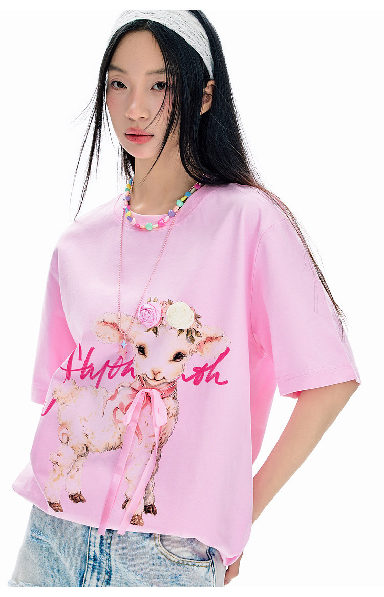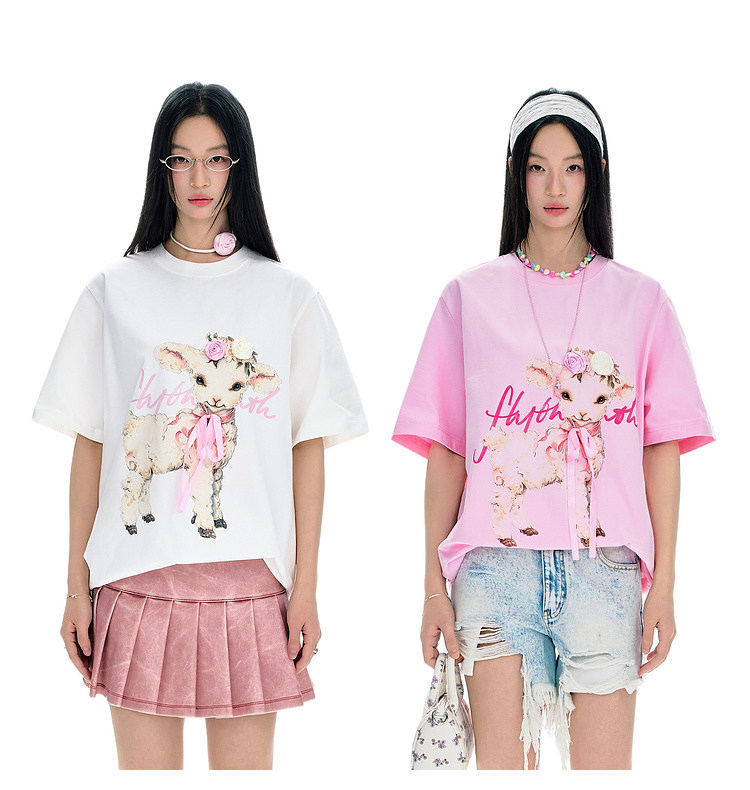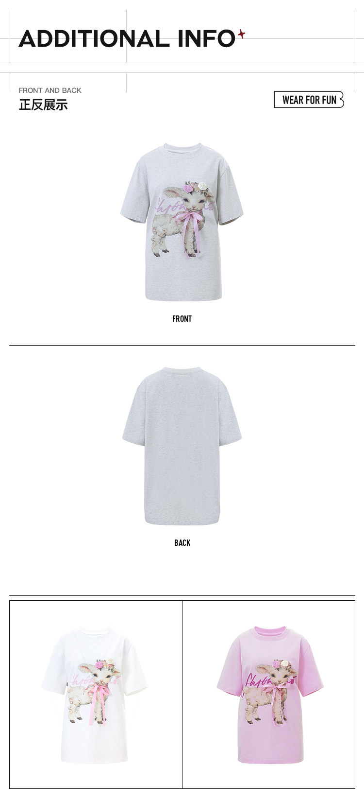 FTT FlyTheTruth 小羊印花短袖T恤女夏季宽松慵懒设计感纯棉上衣