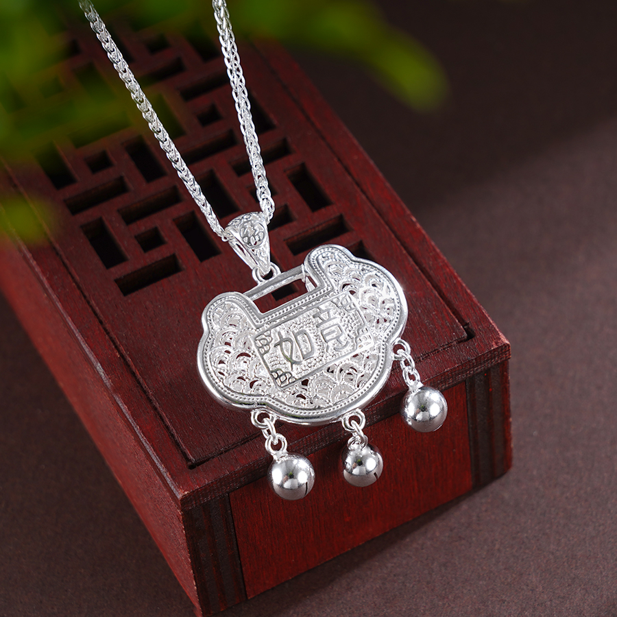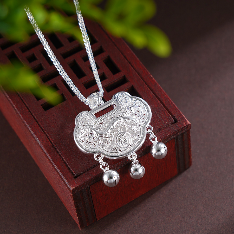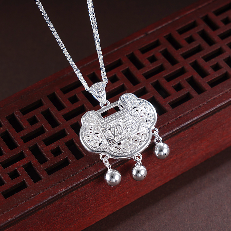 【寓意】:一款独特长命锁吊坠,正面点缀“如意“二字,背面饰以龙腾图案,古朴而典雅。寓意祥瑞常伴,如意深锁。