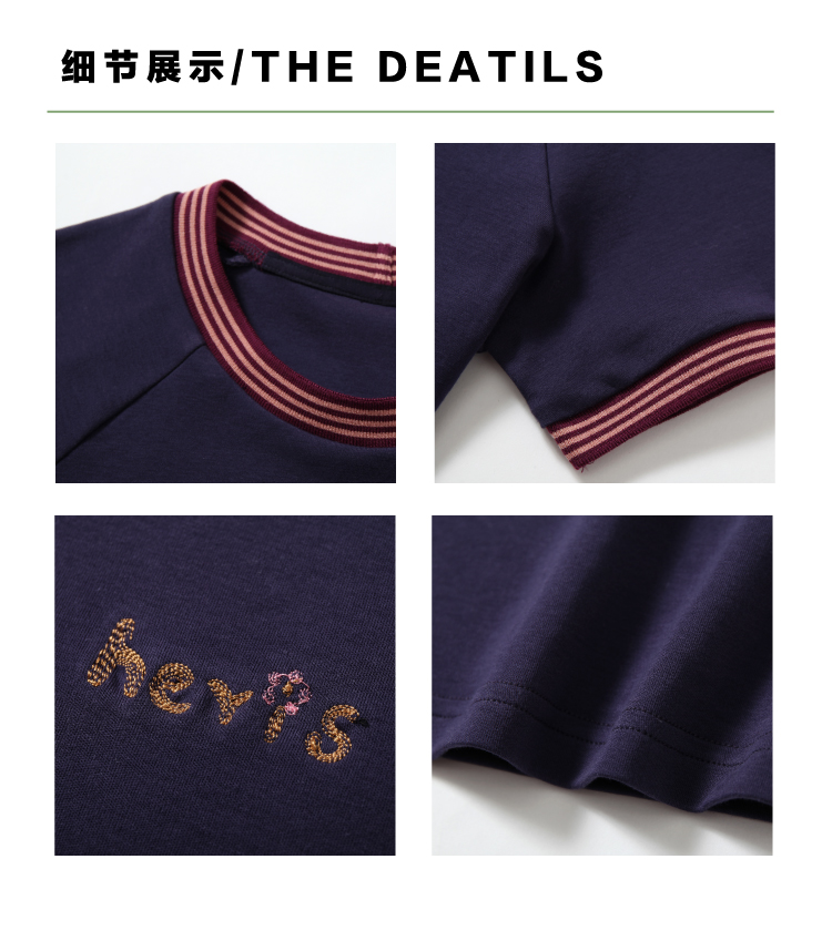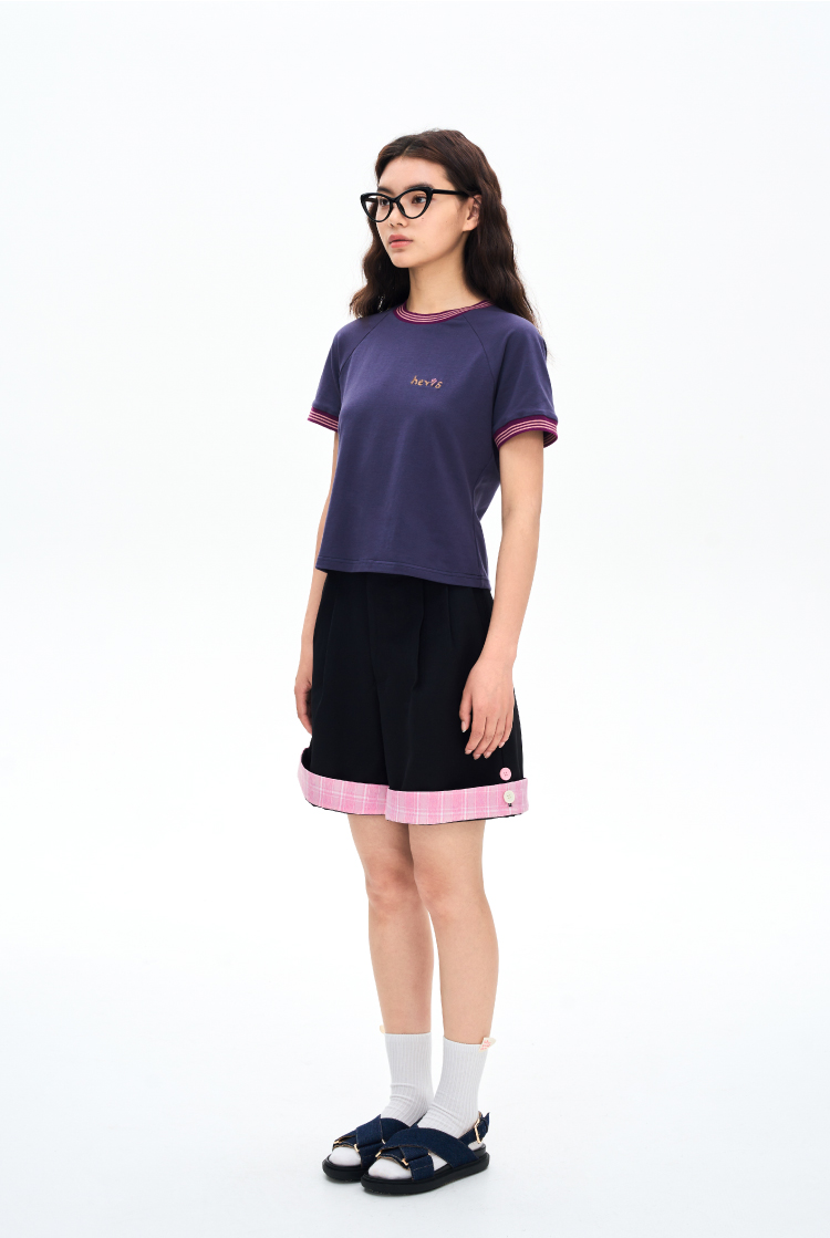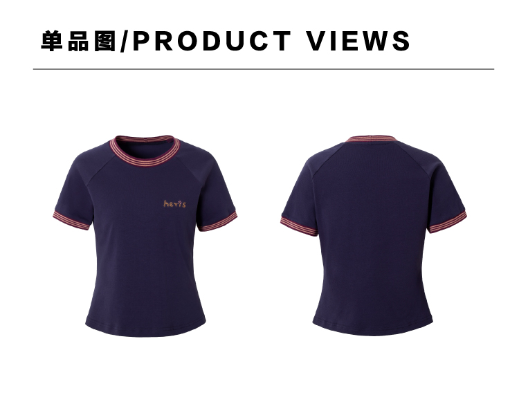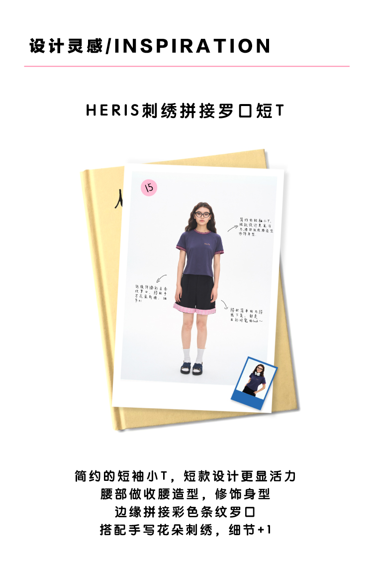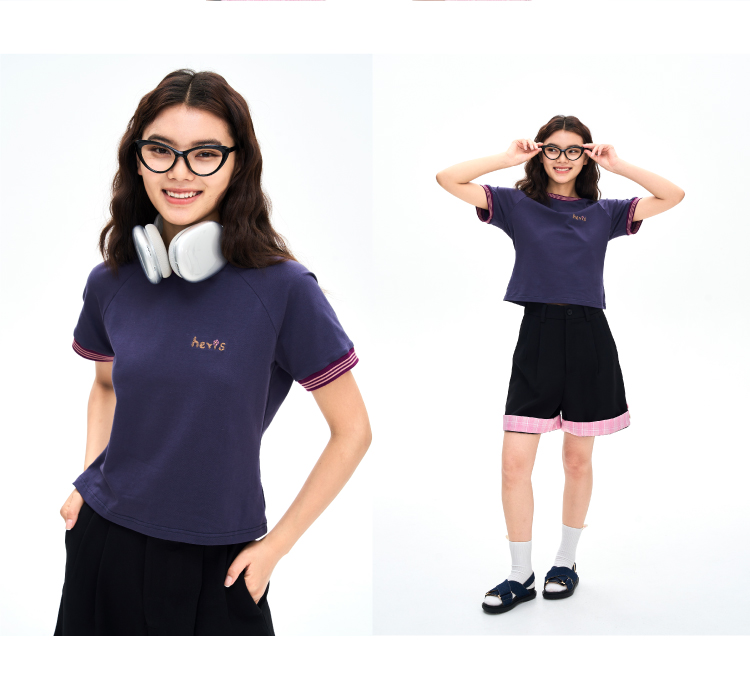 heris/H42116/撞色手写刺绣 彩色罗口拼接 收腰显瘦插肩短袖短T