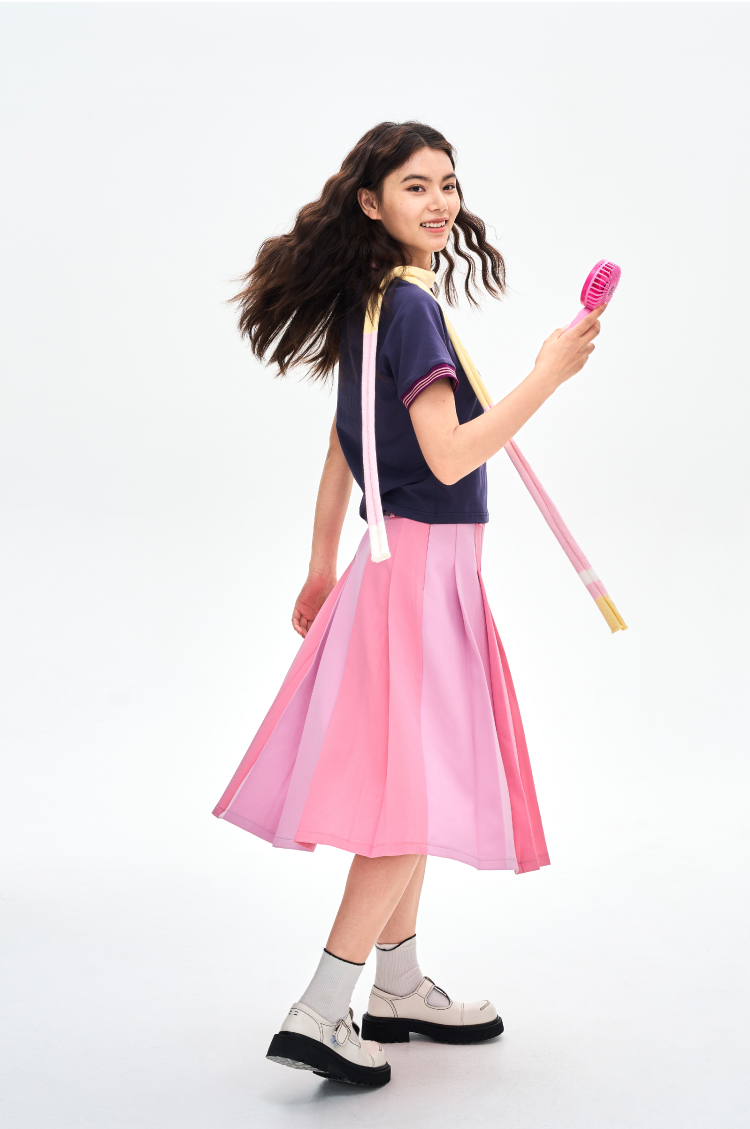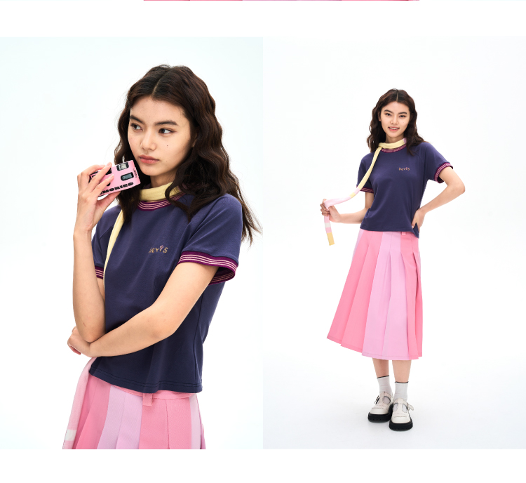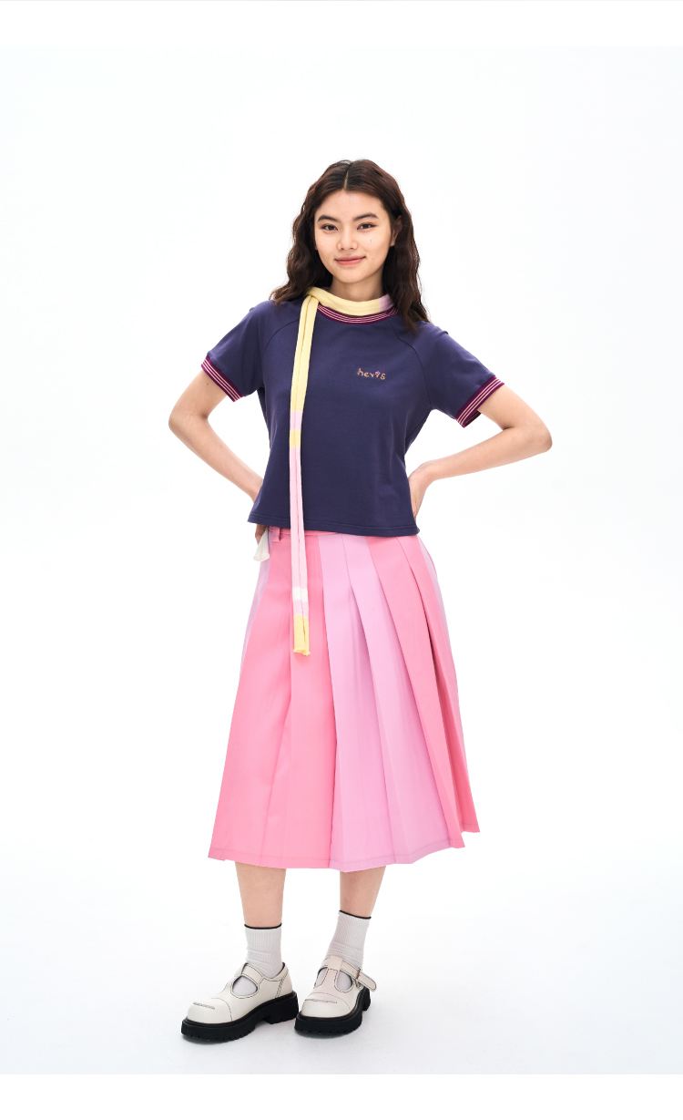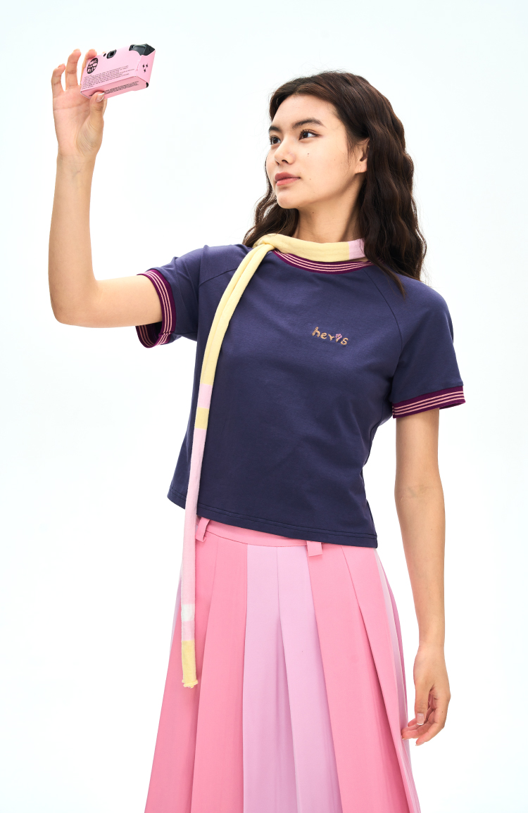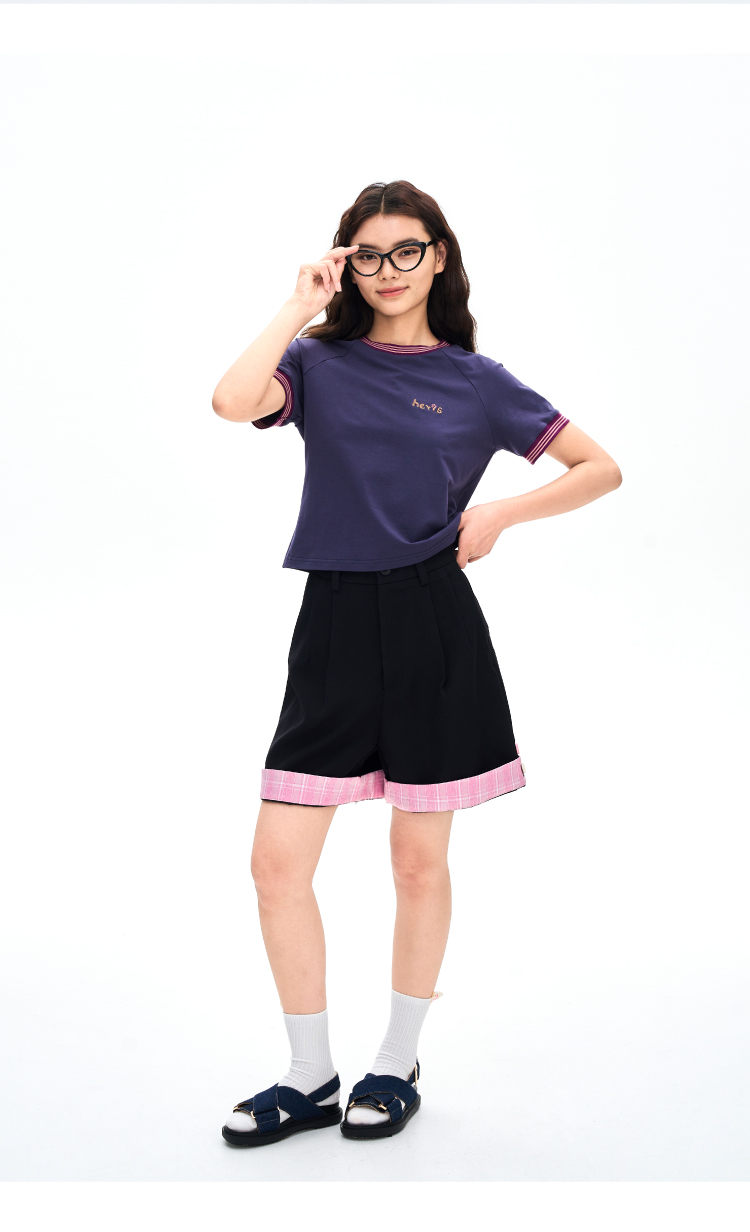heris/H42116/撞色手写刺绣 彩色罗口拼接 收腰显瘦插肩短袖短T