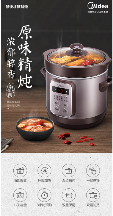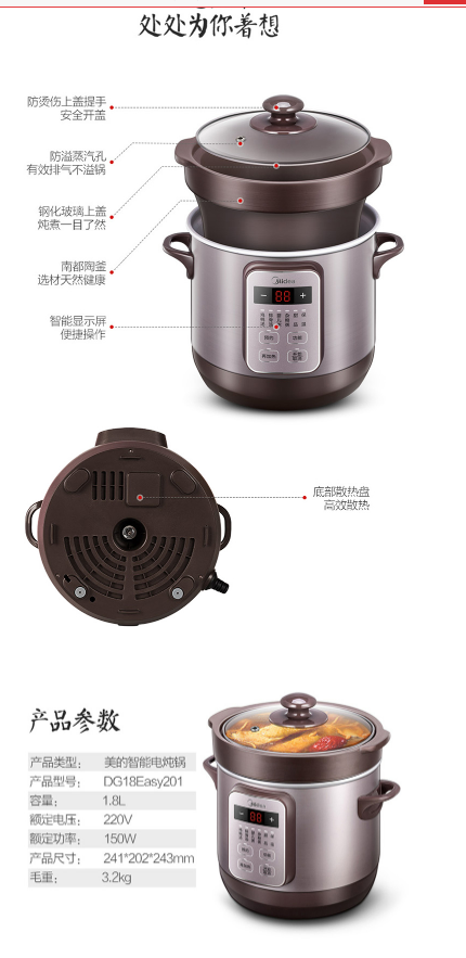 美的(Midea)电炖锅 电炖盅 煲汤锅炖汤锅 煮粥锅 陶釜内胆 1.8L 智能预约定时 DG18Easy201