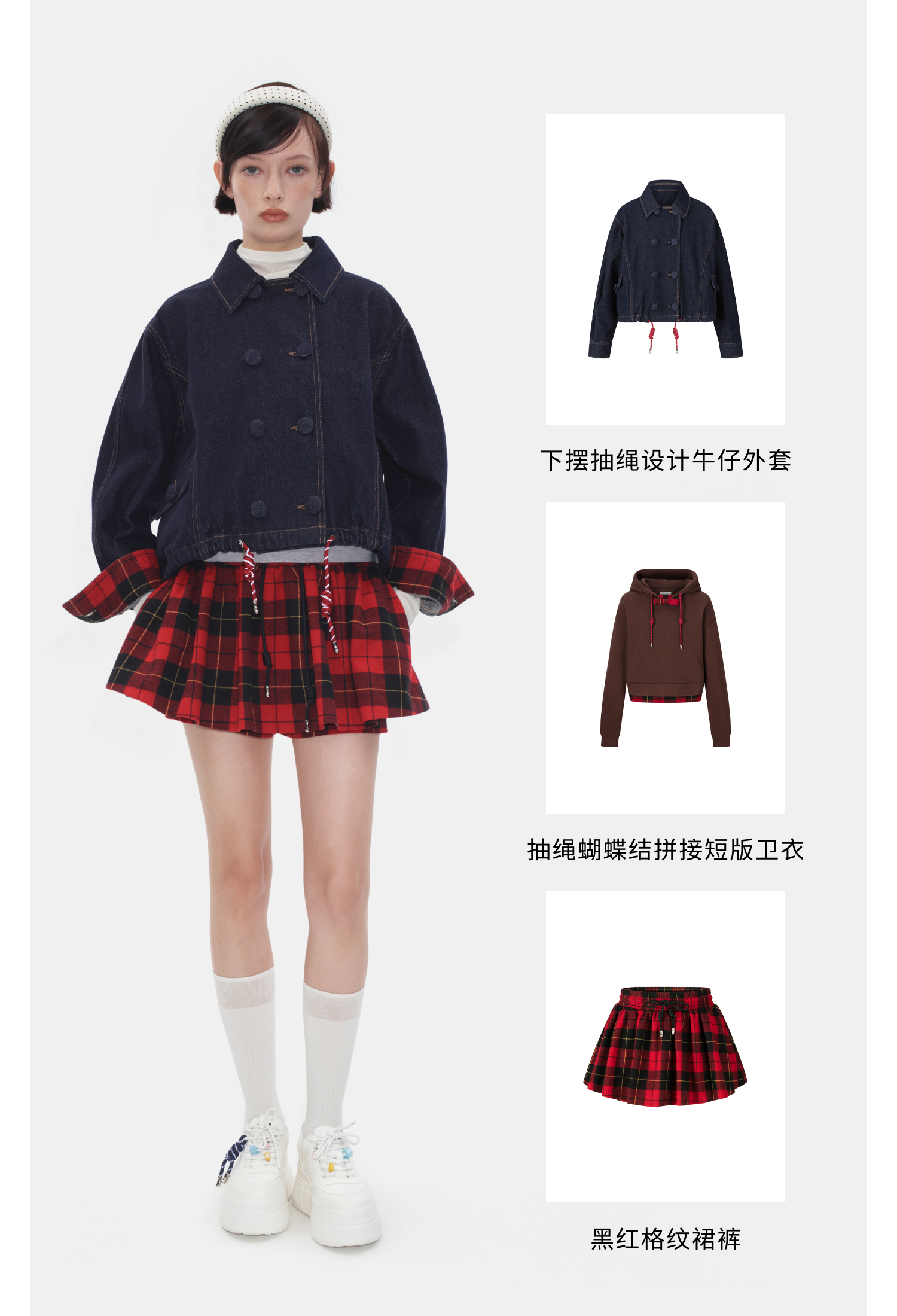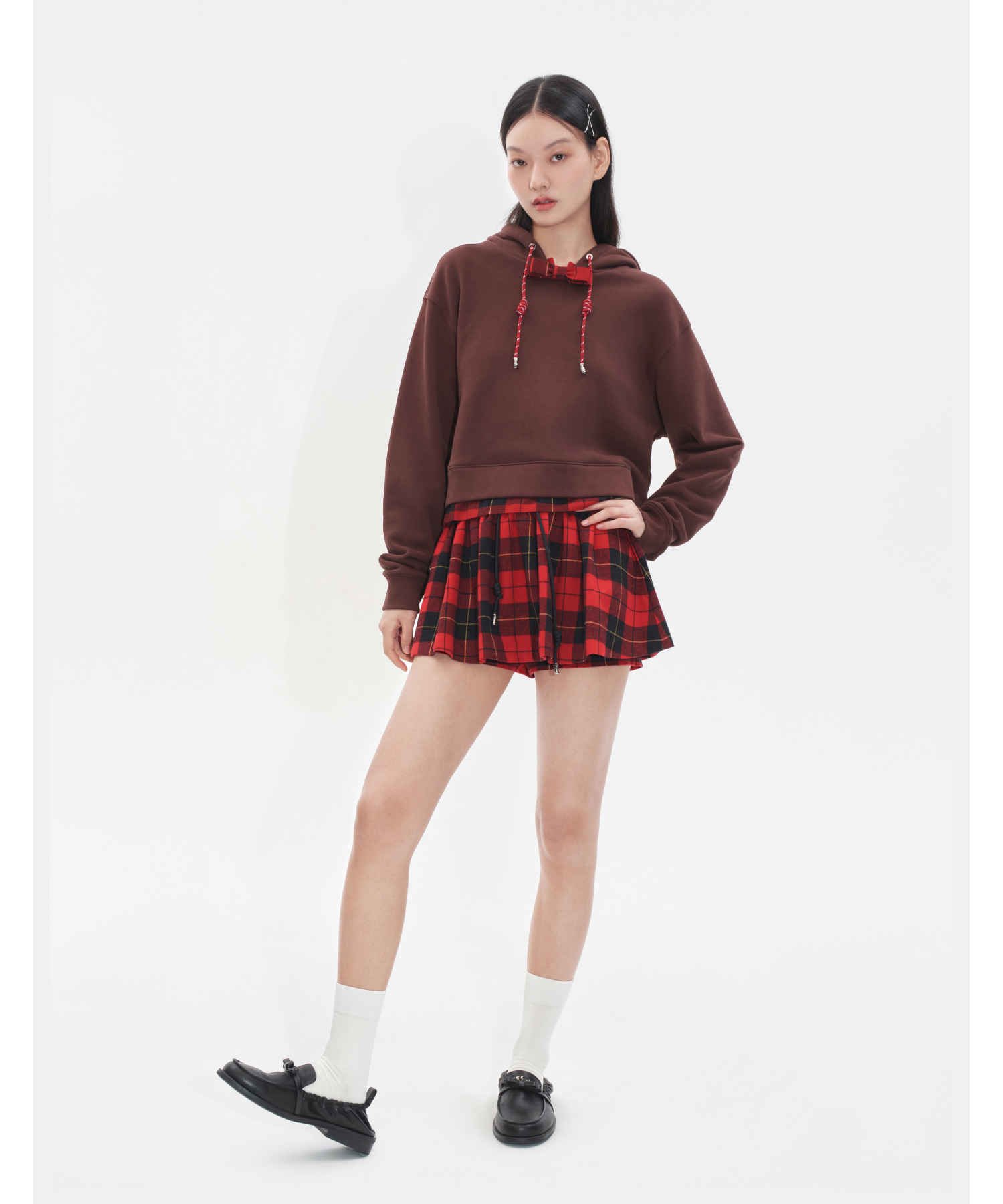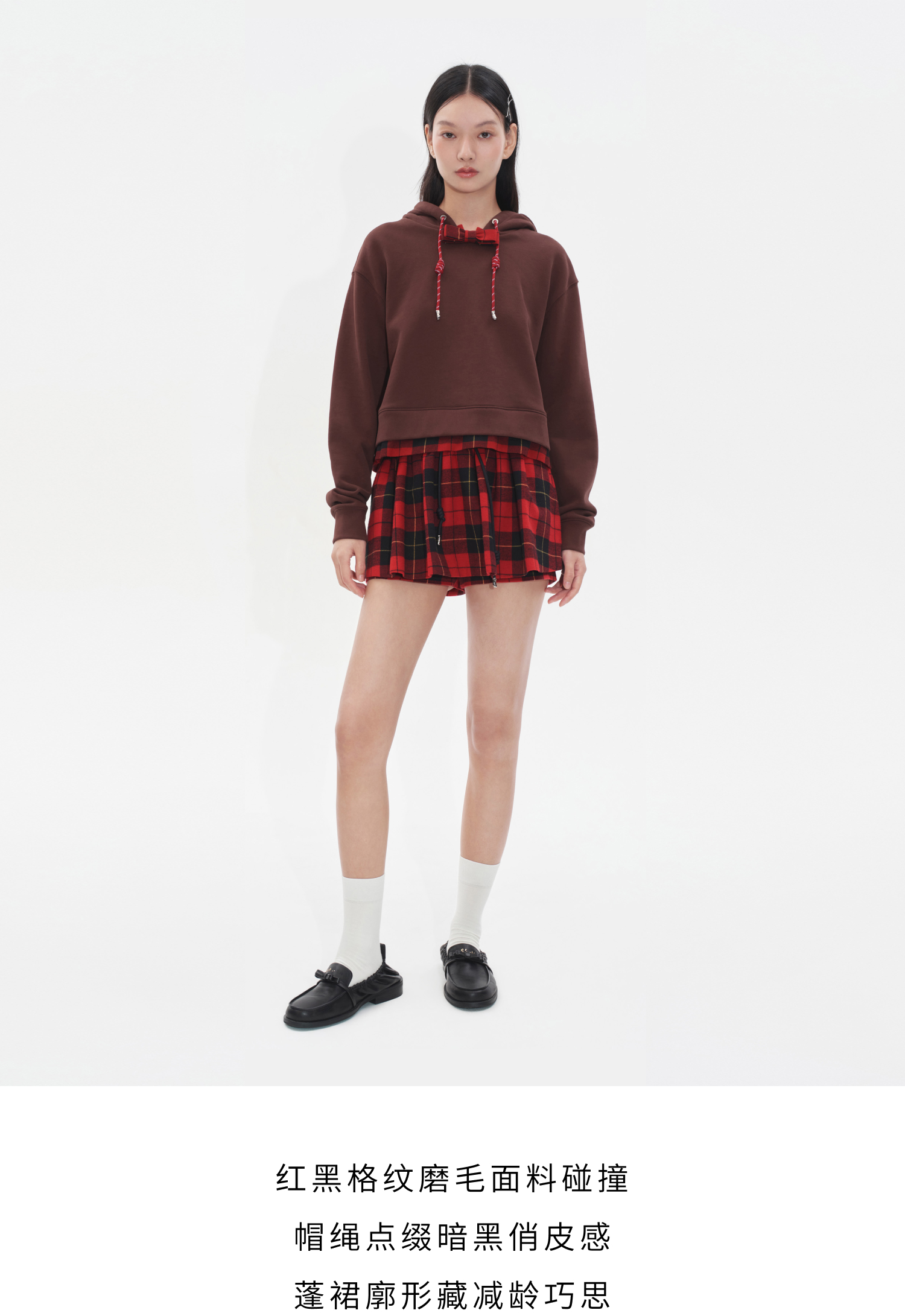 HERLIAN2025年秋季新品女士腰部抽绳设计黑红格纹裙裤