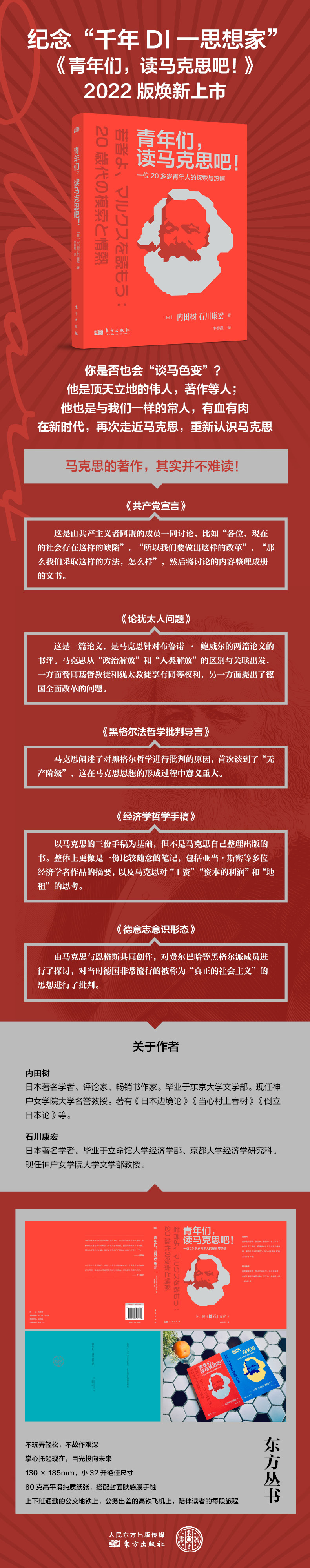 在世界各国出版物中,阐释和解读马克思著作的各种读物可谓浩如烟海,但大多晦涩难懂,以至于很多年轻读者往往“谈马色变”,敬而远之。日本著名学者内田树与石川康宏以书信对话的形式,从不同的角度对马克思的经典著作及有名理论阐述了各自的理解和看法。两位学者文风不同,对同一问题具有不同的态度及视角,书信对话这一创新形式,拉近了读者与马克思的距离,增强了本书的可读性和趣味性。两位作者通过八封书信,分别就《共产党宣言》《论犹太人问题》《黑格尔法哲学批判导言》《经济学哲学手稿》《德意志意识形态》这些马克思经典著作中的经典问题进行了讨论。