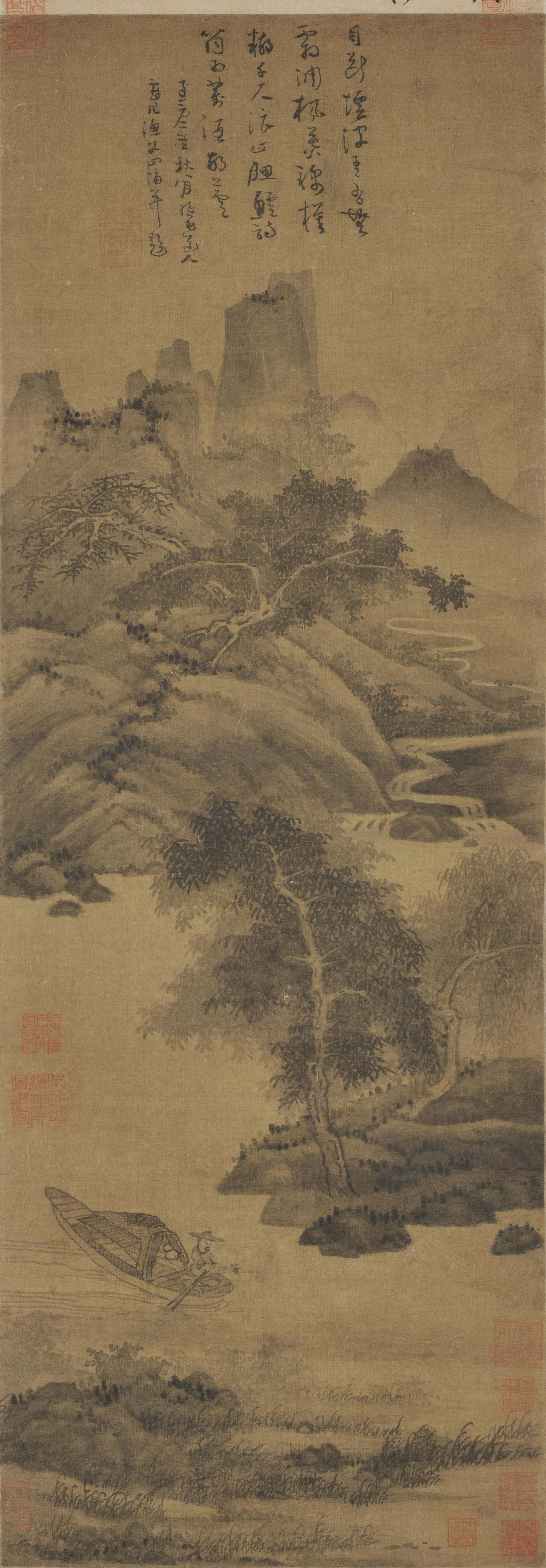 在中国古代,渔、樵、耕、读,常常被文人士大夫视为理想化的生活方式,并常被用作文艺作品的主题,以表达作者避世遁隐的愿望,其中尤以“渔隐”的素材最为普遍。时至元代,汉族文人仕进无门,社会地位骤降,江南士人遭遇尤甚。于是,“渔隐”就更频繁地出现在绘画作品中,其中以吴镇的《渔父图》最为典型。吴镇善作“渔隐”题材的山水画,传世《渔父图》即有多幅,此图是其中较有代表性的一幅。图中描绘江南水乡景色,平冈丛树,一渔父驾小舟逍遥于湖弯水色之间。全图墨色苍润,山石、树木、枝叶都注意到了墨色浓淡的交替运用,借以表现层次关系并突出主要物象。笔法多变,皴擦点染,均可看出作者高超的控笔能力。湖山间幽僻清寂的意境跃然纸上,给人以远离尘俗之感。吴镇的《渔父图》大都以秀劲潇洒的草书《渔父群》相配,诗、书、画相得益彰。即如此图中所书:“目断烟波青有无,霜凋枫叶锦模糊,千尺浪,四腮鲈,诗筒相对酒葫芦。”诗为画图点睛,真切地表达出 “一叶随风万里身”的隐逸情思。撰稿人:娄玮(故宫博物院官网)