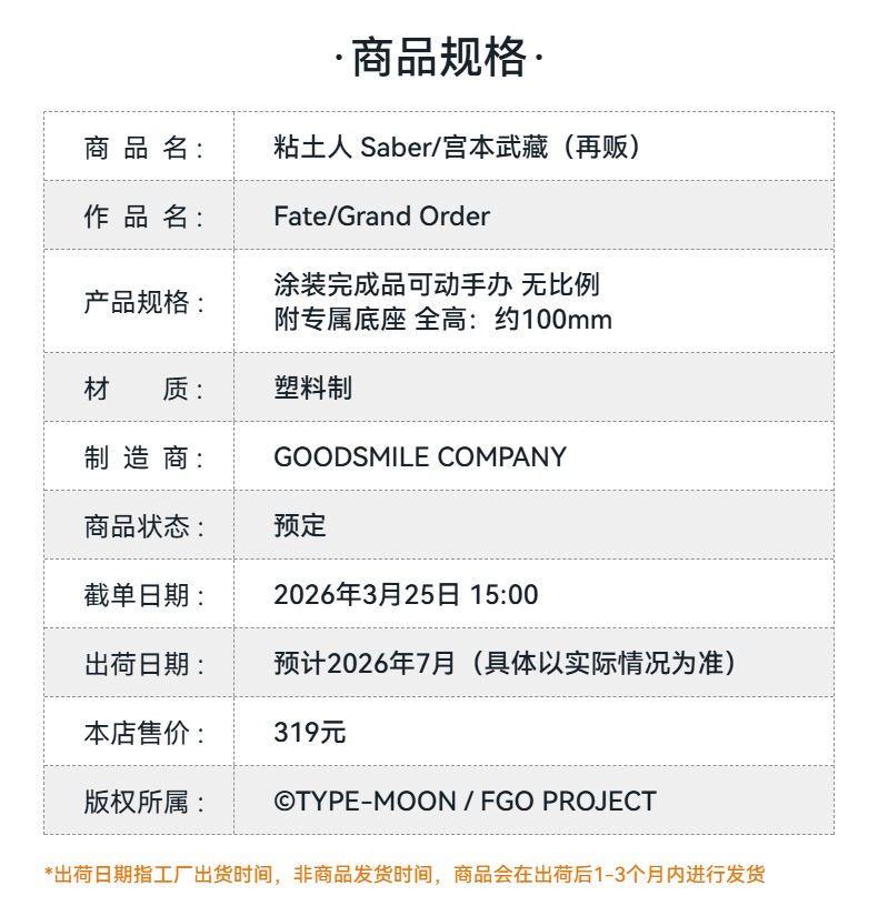 【GSC预售定金】粘土人 Saber/宫本武藏 Fate/Grand Order