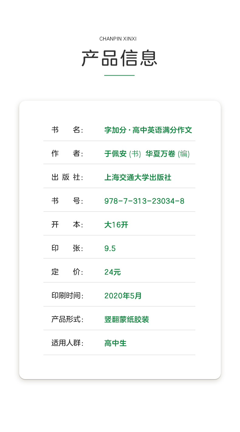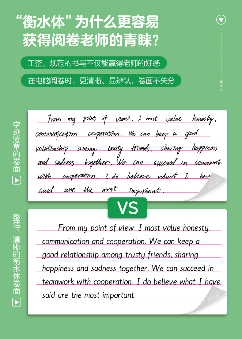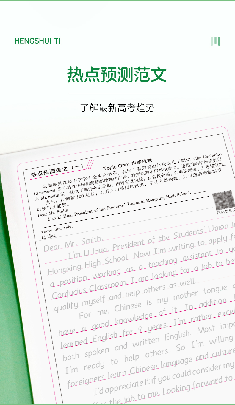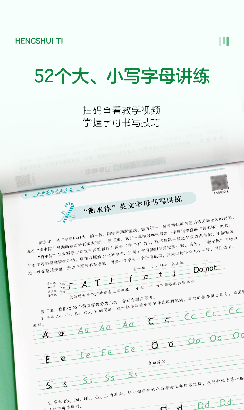 本字帖由于佩安老师书写范字,从新高考和新课标入手,引进课标要求的重要体裁和话题元素,其内容紧扣高中生应试作文要求,提供近期新权威真题素材、满分作文展示和写作策略精讲,供学生临摹和学习。本字帖力求从书写的规范性与写作的实用性两大方面来提高学生的英语写作能力与得分。