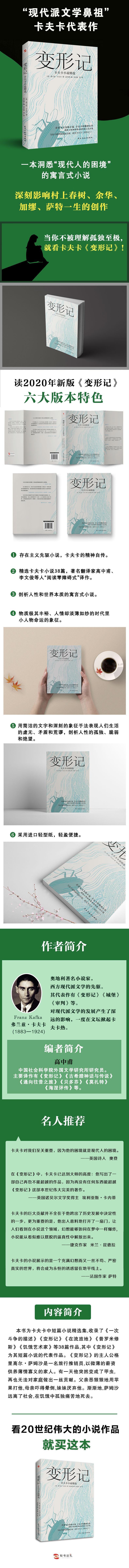 本书为卡夫卡中短篇小说精选集,收录了《一次斗争的描述》《变形记》《在流放地》《普罗米修斯》《饥饿艺术家》等38篇作品,其中《变形记》为其短篇小说的代表作品。《变形记》的主人公格里高尔·萨姆沙是一名旅行推销员,以微薄的薪资供养薄情寡义的家人。有一天他突然变成了甲虫,再也无法对家庭做出一丝贡献。父亲恶狠狠地用苹果打他,母亲吓得晕倒,妹妺厌弃他。渐渐地,萨姆沙远离了社会,在饥饿中孤独痛苦地死去。
