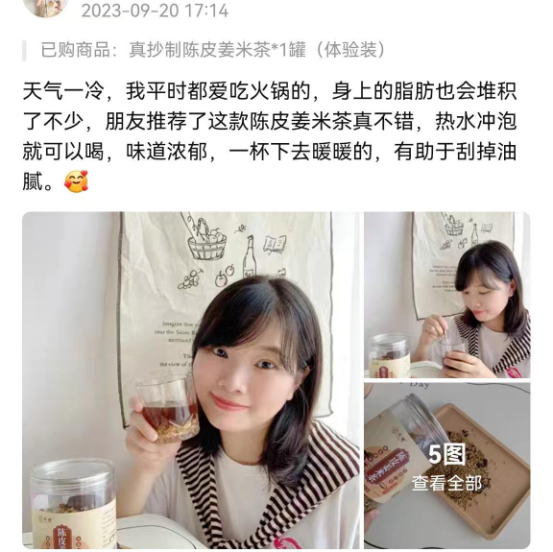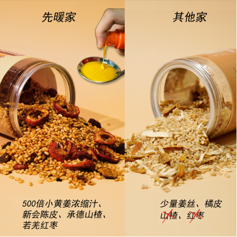 先暖家的产品姜米茶更为出色,主要是严格的选料,和严格遵循了古法制成工艺 ✅严选5味道地原料,品质自然没得说! 🔺先暖家自产500倍浓缩小黄姜汁: 来自云贵高地小黄姜,排寒祛湿、去肠积,化脂肪 🔺新会陈皮:化淤生津、理气健脾 🔺承德山楂:健胃消食、化浊降脂 🔺稻花大米:理气解郁、健脾养胃 🔺若羌红枣:补血生津、行气活血 配料很干净,没有任何添加 可以放心喝🌹 用料选料,是不是真材实料,对比一下就知道了