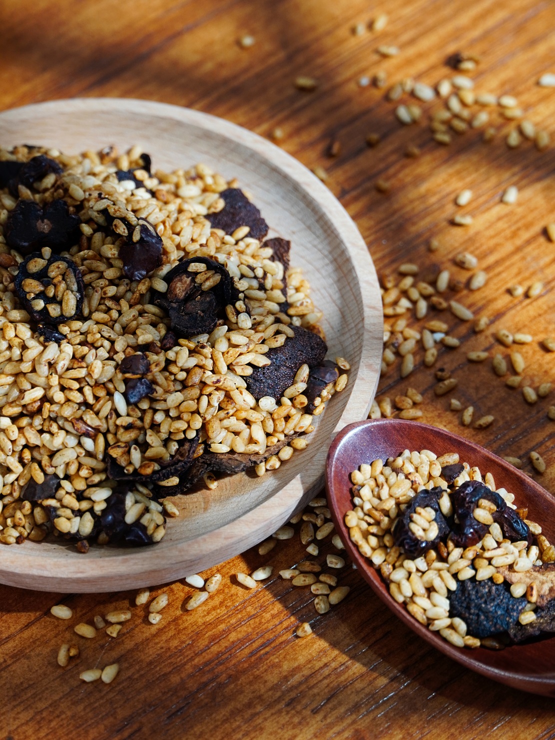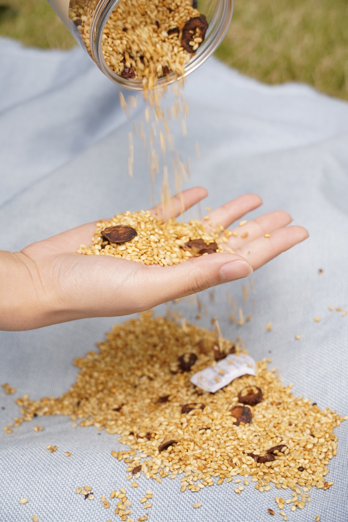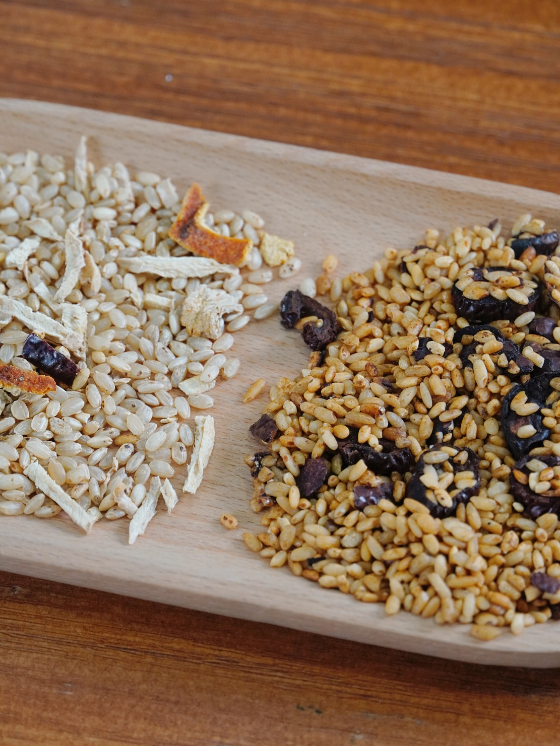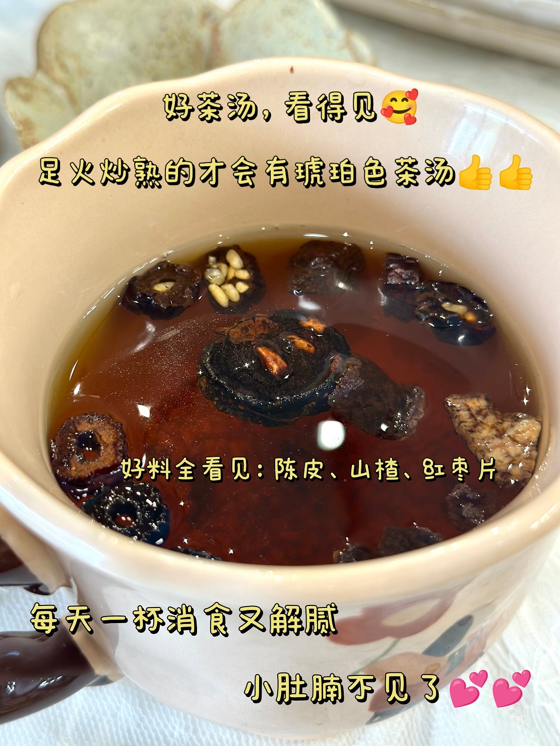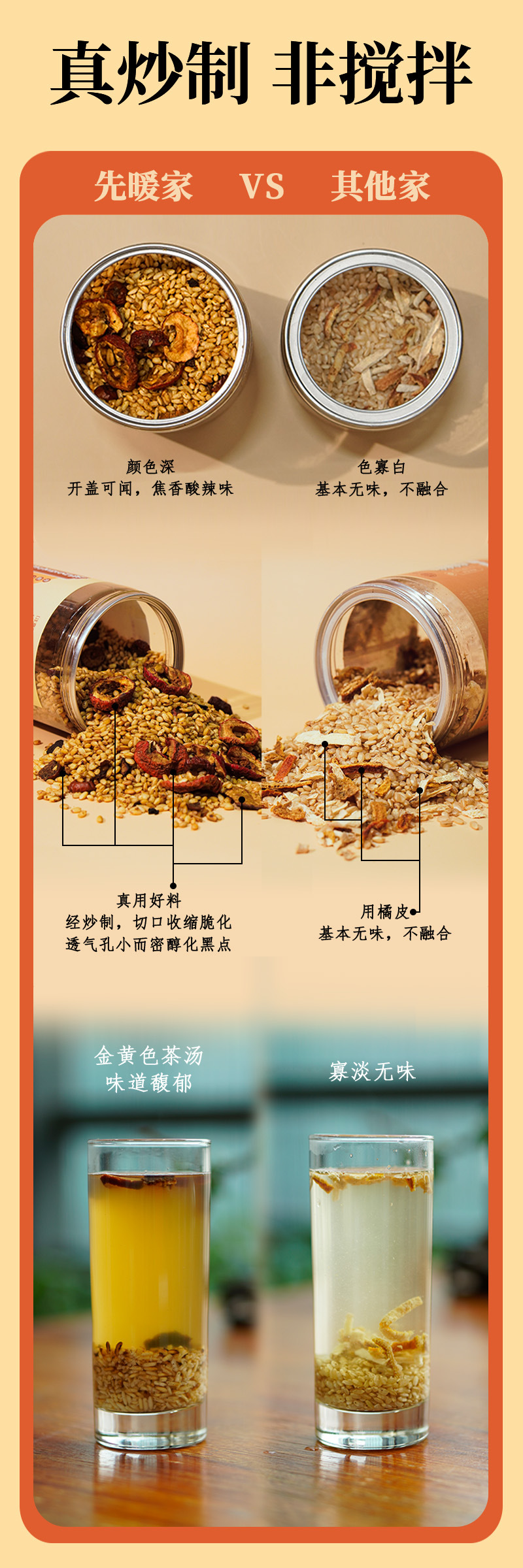 简单两招:看颜色、闻味道‼️ 👉未经炒制的 我们可以看到物料颜色寡白 切口平整,基本没有物料的味道 泡出来的水颜色寡淡,寡淡无味! 👉先暖家的, 🫚开盖就有浓郁的焦香微辣味 🫚物料颜色,大米金黄灿烂,陈皮山楂呈焦褐色 🫚切口有受热收缩的痕迹,有醇化的黑点,糙米还有小而密的透气孔 🫚琥珀色茶汤,通透有底蕴,味道馥郁,焦香持久回甘 🫚炒焦的米黄,冲泡后会开米花 这颜色,这颜值 每一颗都有真态度🌹