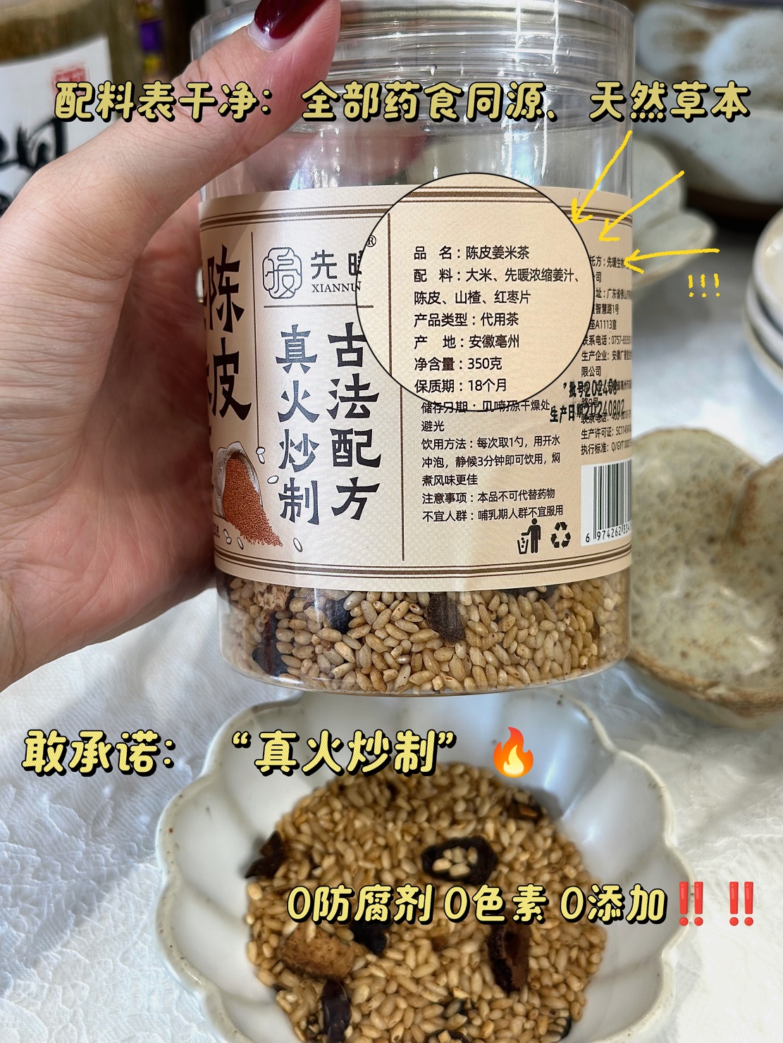 现在市场上已经基本买不到真炒制的姜米茶了 大部分仅仅是把物料采购回来 简单搅拌一下就包装上市了 这样的姜米茶实在没啥用😮💨 真正好的姜米茶 必须要用足火炒制,才得古法精髓❗❗ 姜、陈皮、山楂、红枣等的有效成分 只有经过足够的🔥火候,用小火慢慢炒制 进行充分融合和醇化 才能把祛湿化痰、驱寒养胃的效能直接提升数十倍以上,也更好吸收转化👍 是不是真炒制的姜米茶,直接货比货 简单两招就知道了✌🏻