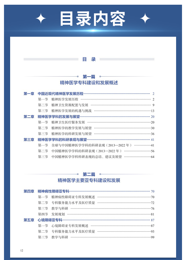 本书系统梳理和盘点目前我国精神医学临床专科建设情况、发展思路与发展趋势,呈现**领域专家研究成果和优秀医院实践经验,在当前我国精神疾病患病人数持续增加的背景下,可以为全国精神临床专科建设提供指导和借鉴,助力提升我国精神医学临床专业的发展水平。本书拟编写21章,可划分为四部分:精神医学发展概述、精神医学亚专科建设和发展、精神医学专科技术发展和优势特色专科案例分析,其中精神医学亚专科建设和发展包括精神病性障碍专科、心境障碍专科、成瘾医学专科、心身医学专科、老年精神专科、儿童青少年精神专科、精神科急重症专科、神经调控专科、心理健康管理专科、中医神志病专科、精神障碍康复专科、司法精神病学专科等,全面总结我国精神医学亚专科的发展现状;精神医学专科技术发展包括医学检验技术、医学影像技术、神经调控技术、康复与心理技术、护理技术、中医神志病技术及精神医学专科新兴技术研发与转化。