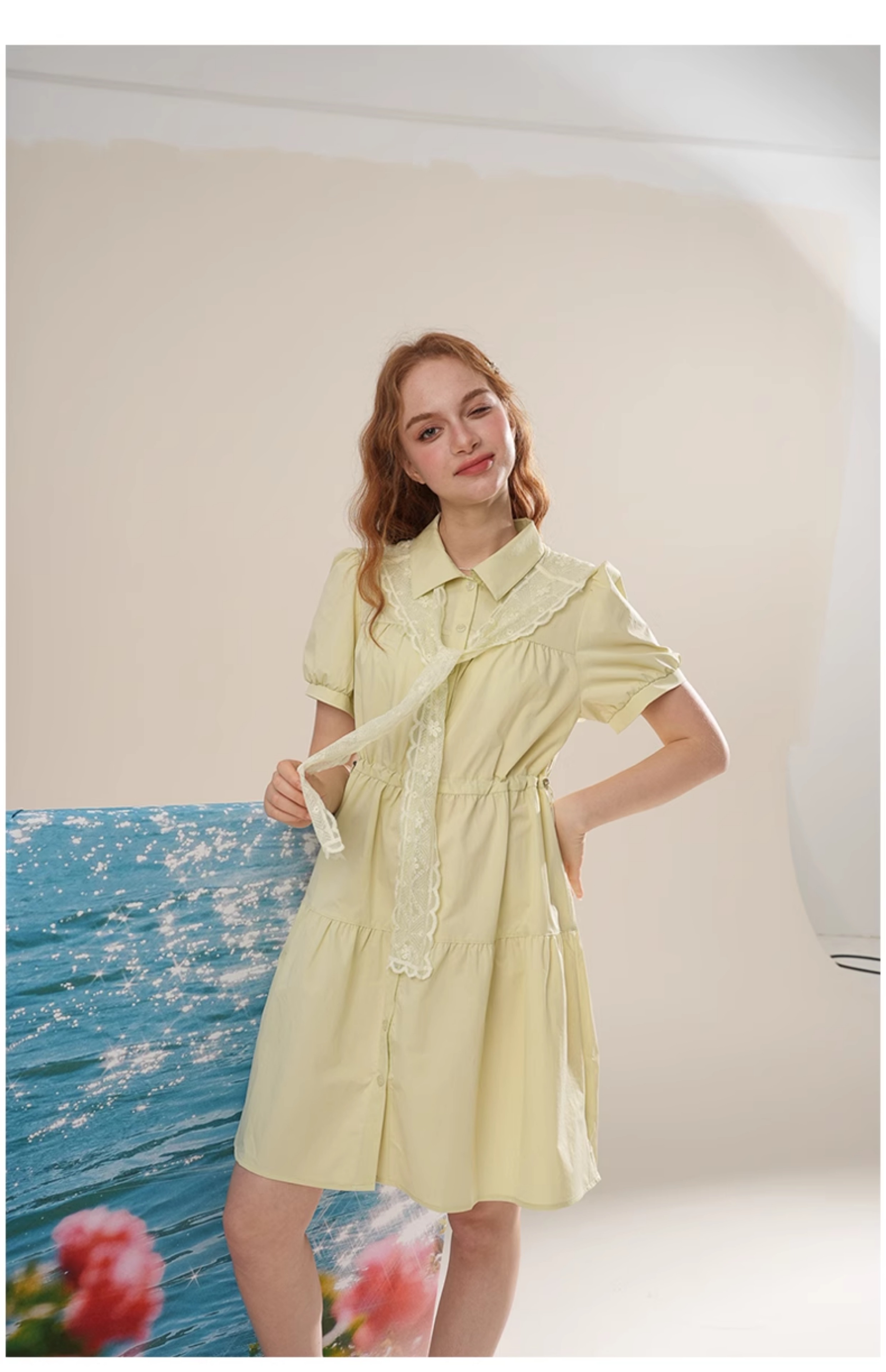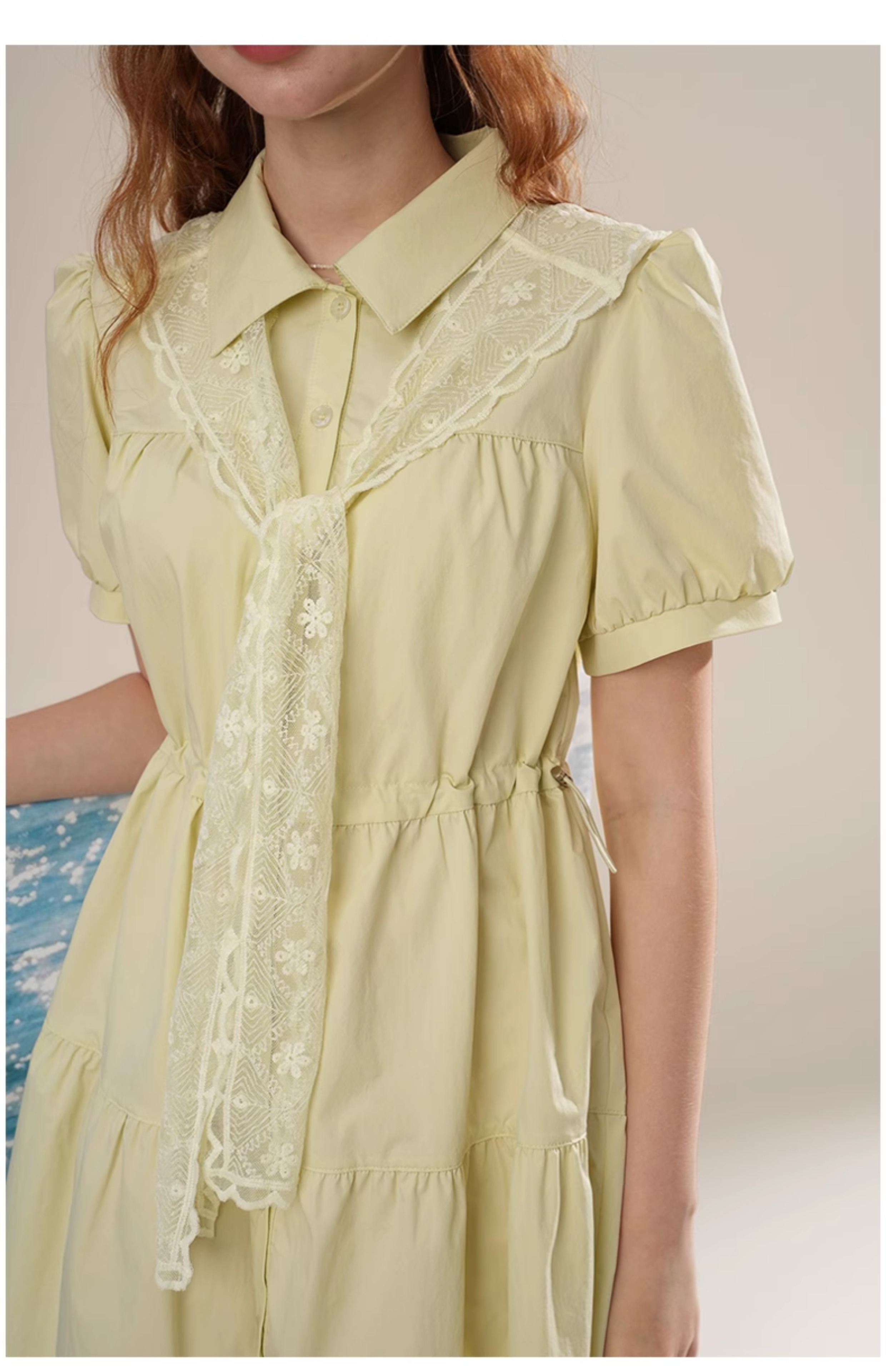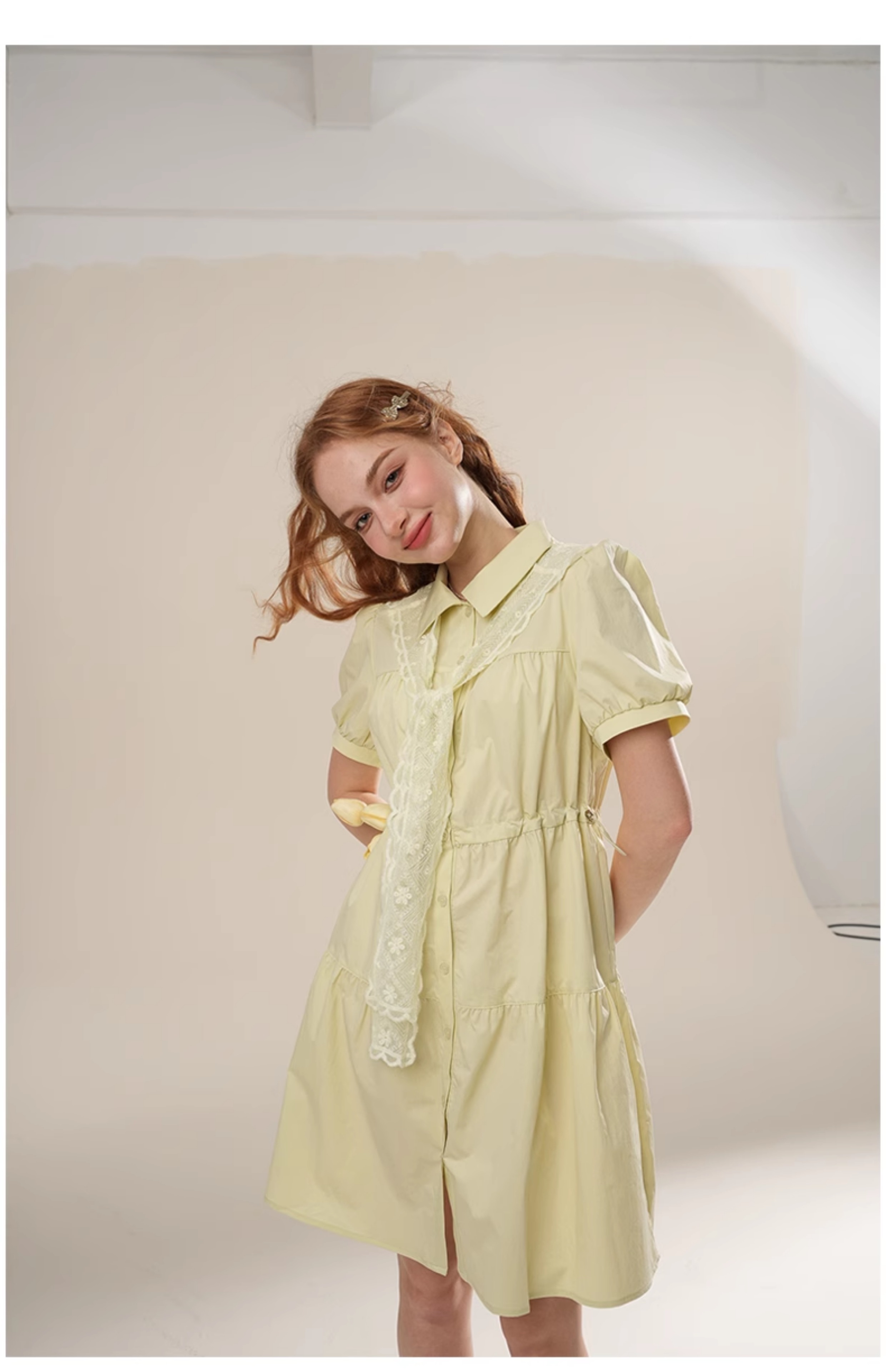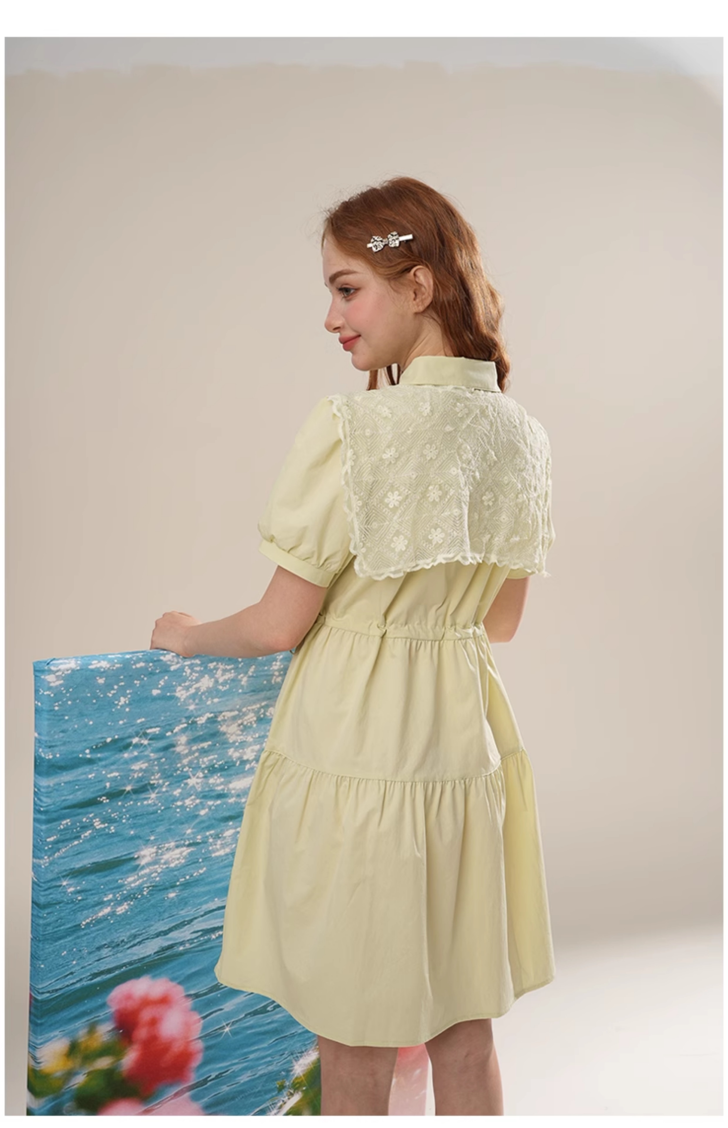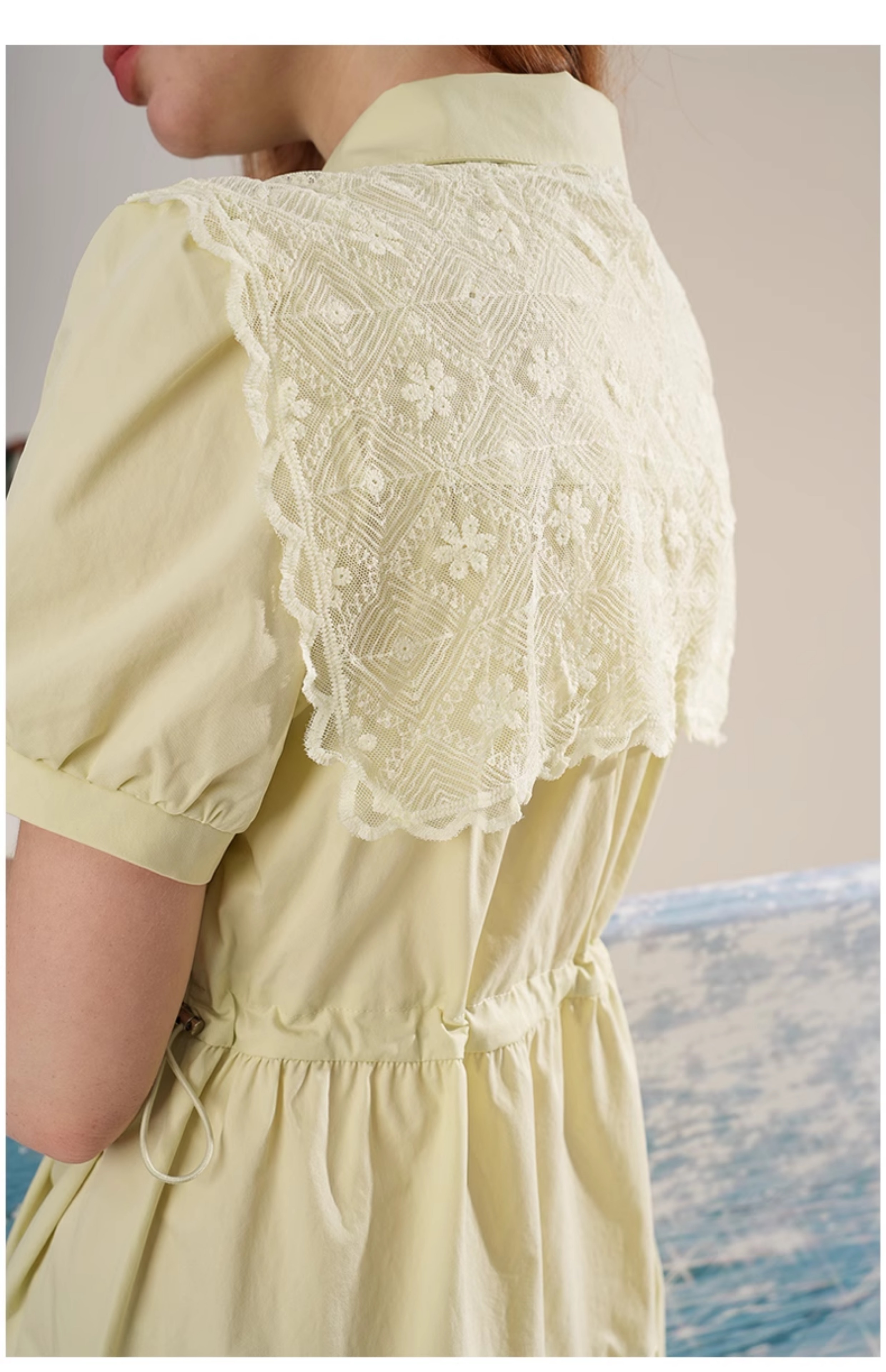 女装翻领配蕾丝披肩a型抽皱连衣裙-087Q5221007