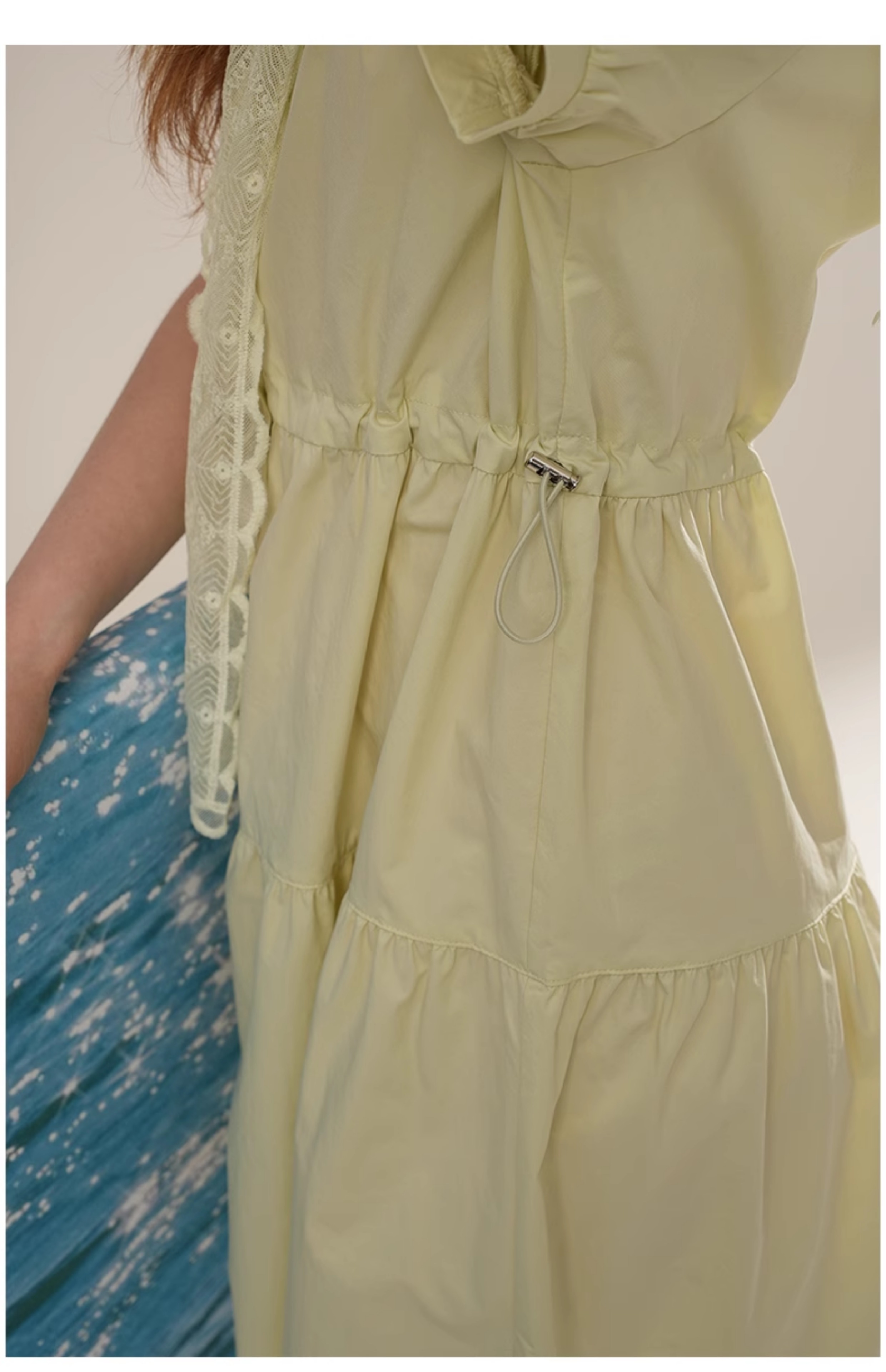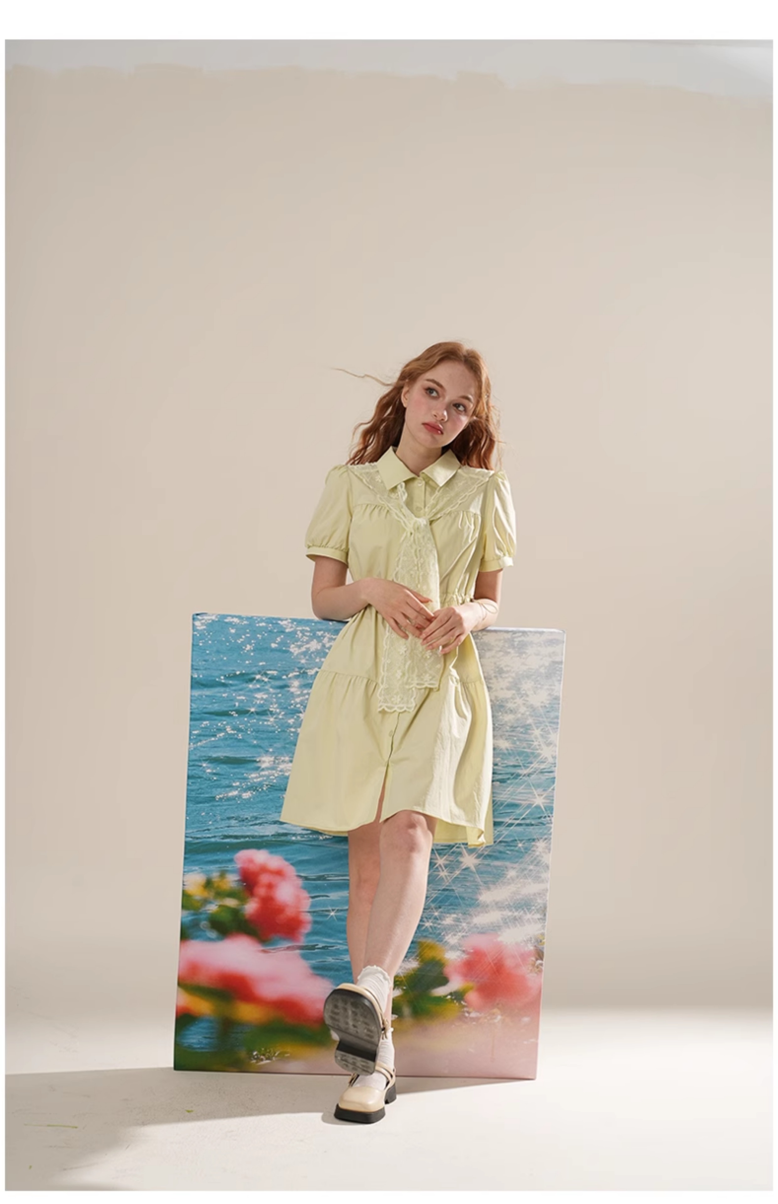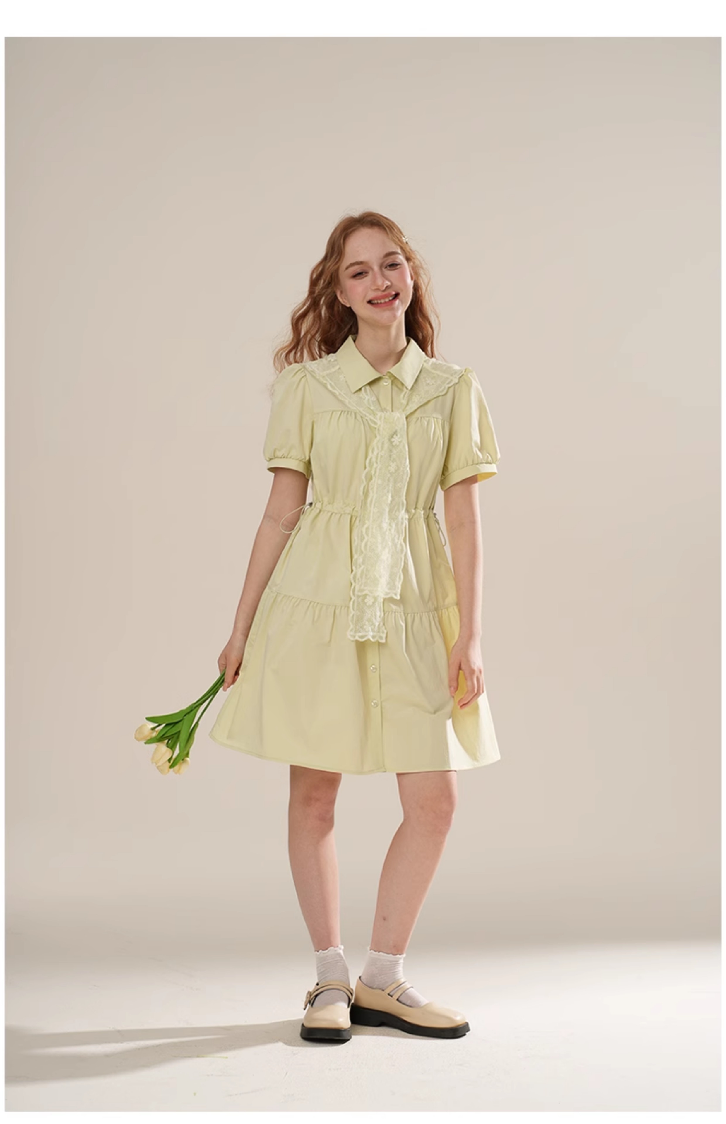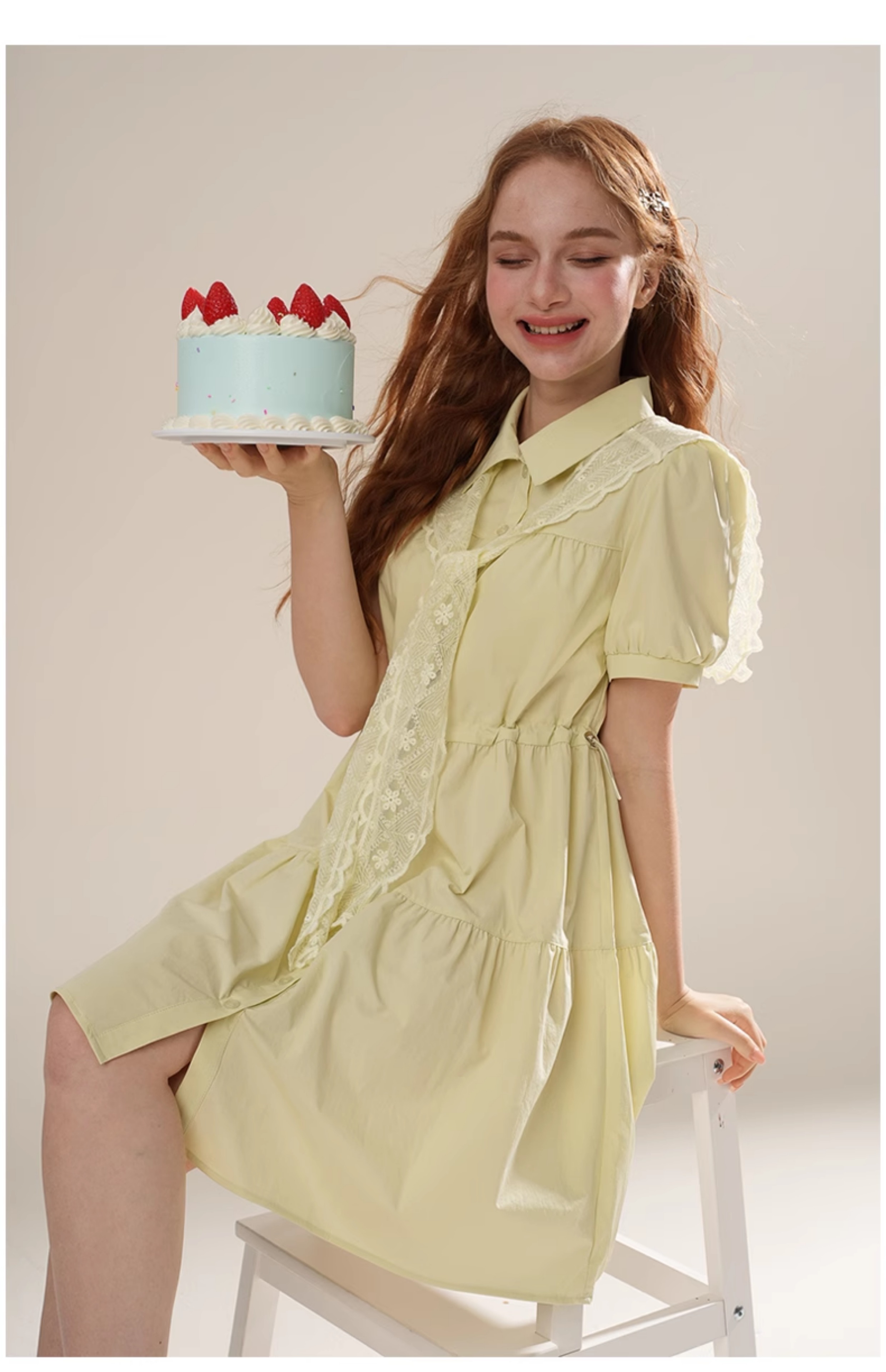 女装翻领配蕾丝披肩a型抽皱连衣裙-087Q5221007