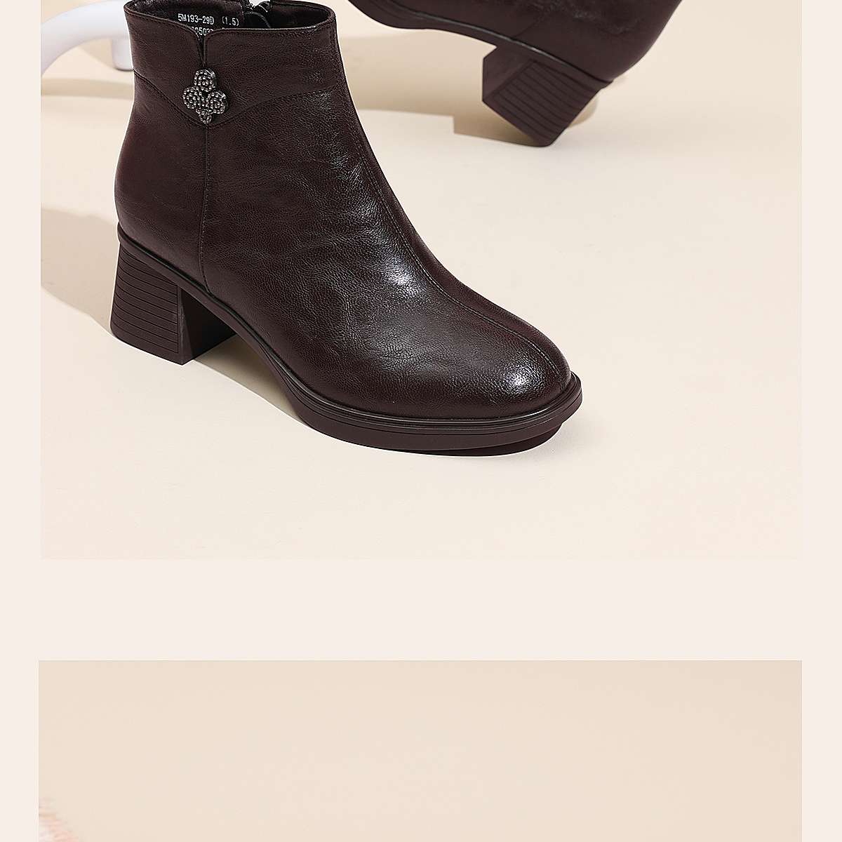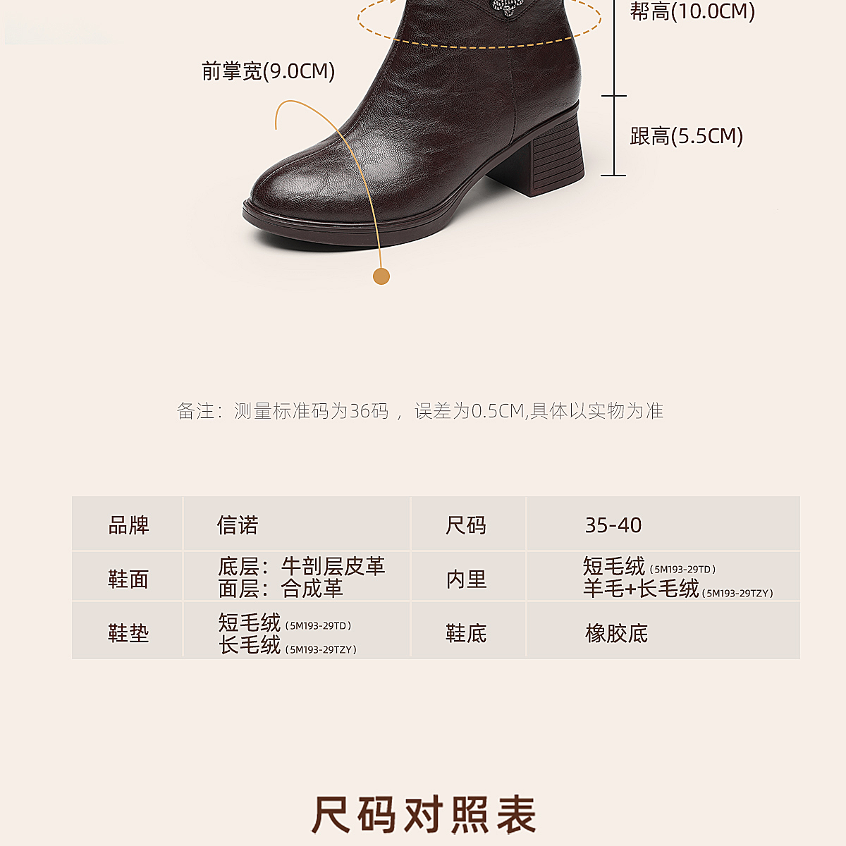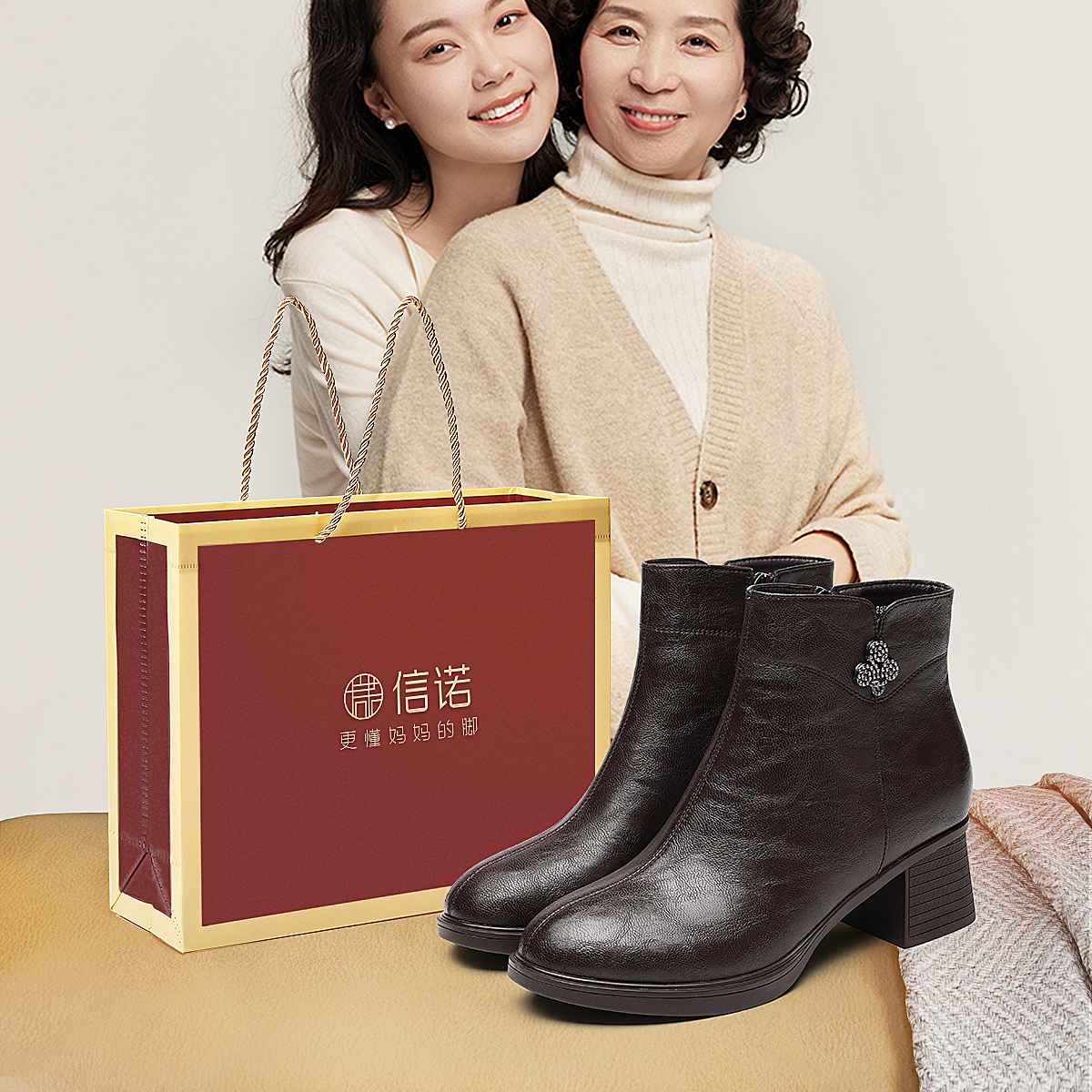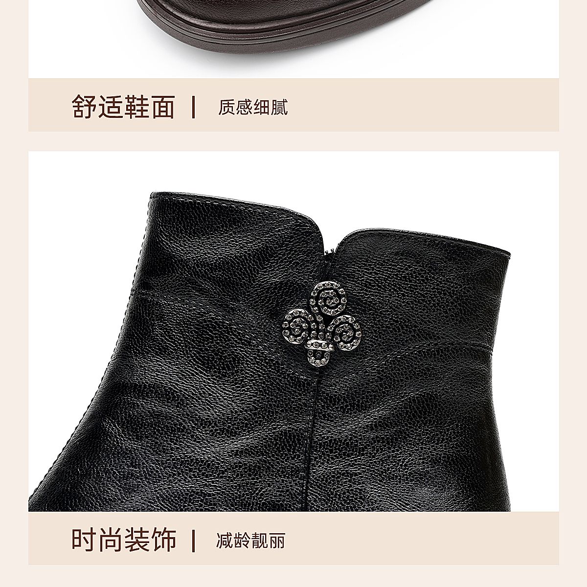 信诺羊毛妈妈棉鞋女百搭粗跟短靴中老年加绒保暖皮鞋2025冬季新款5M193-29TZY