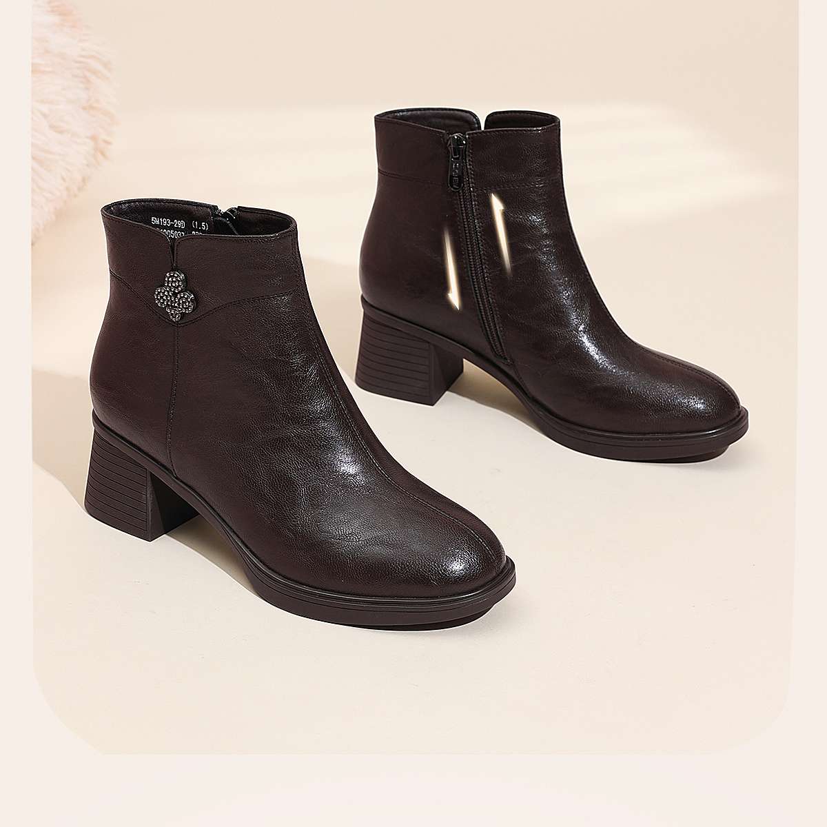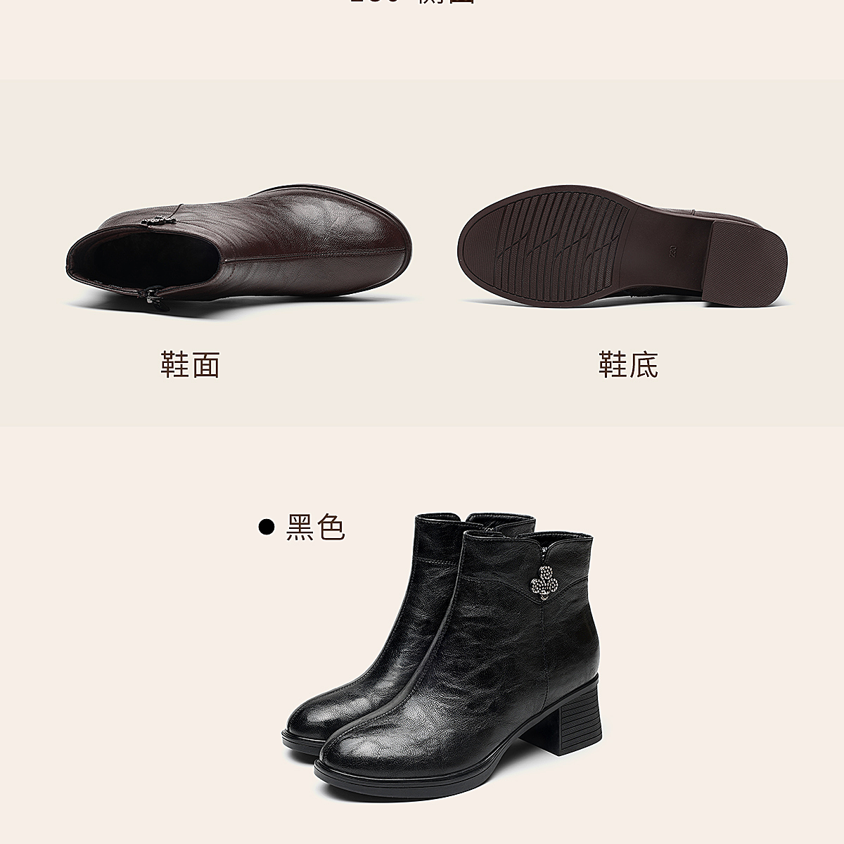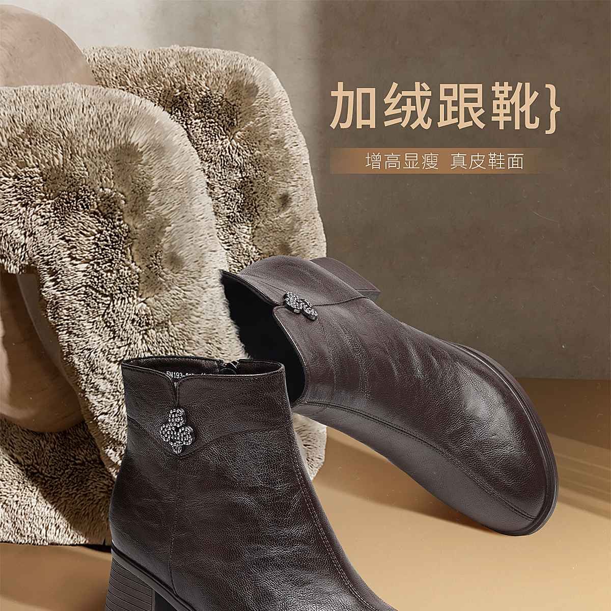 信诺羊毛妈妈棉鞋女百搭粗跟短靴中老年加绒保暖皮鞋2025冬季新款5M193-29TZY
