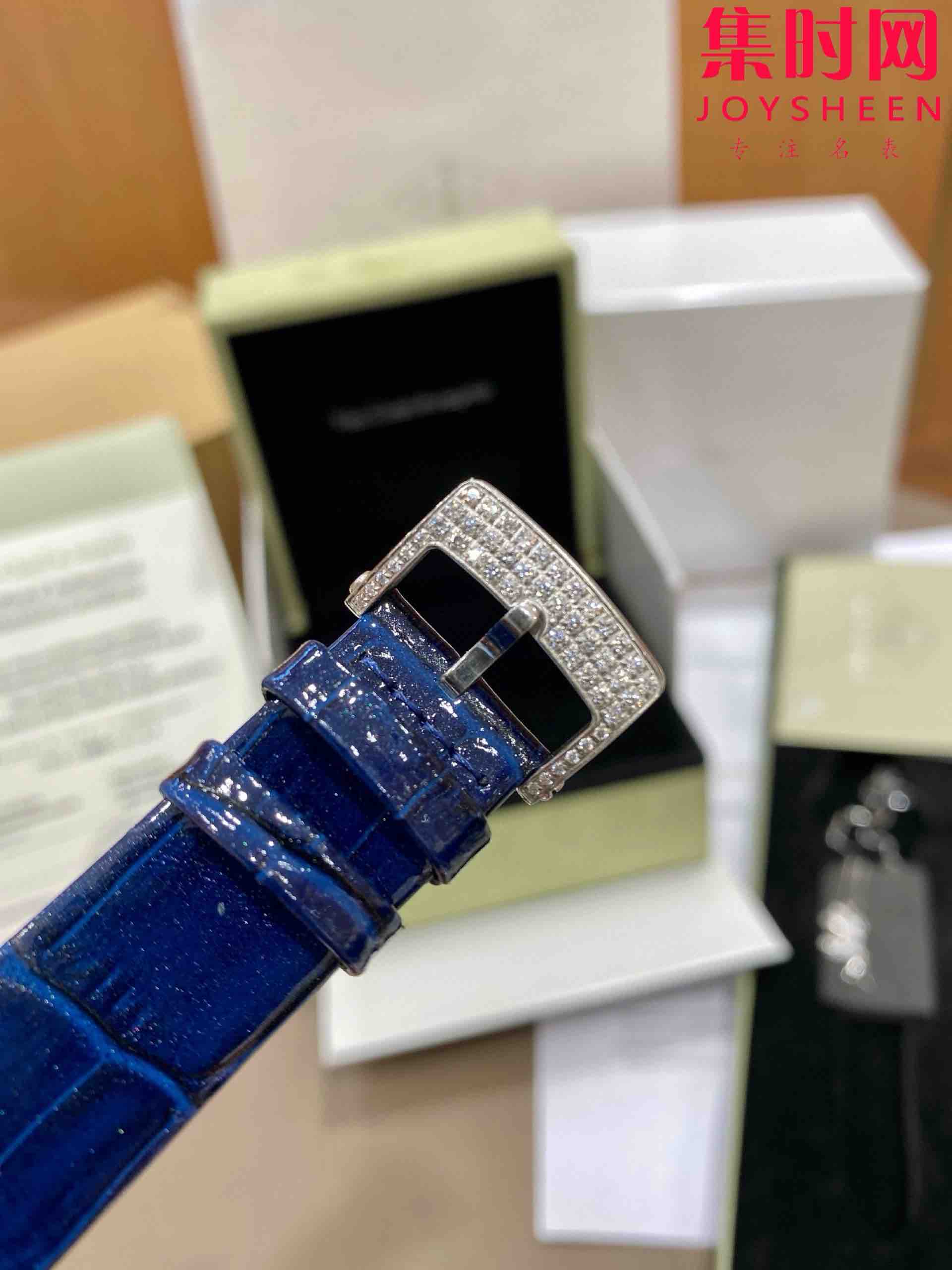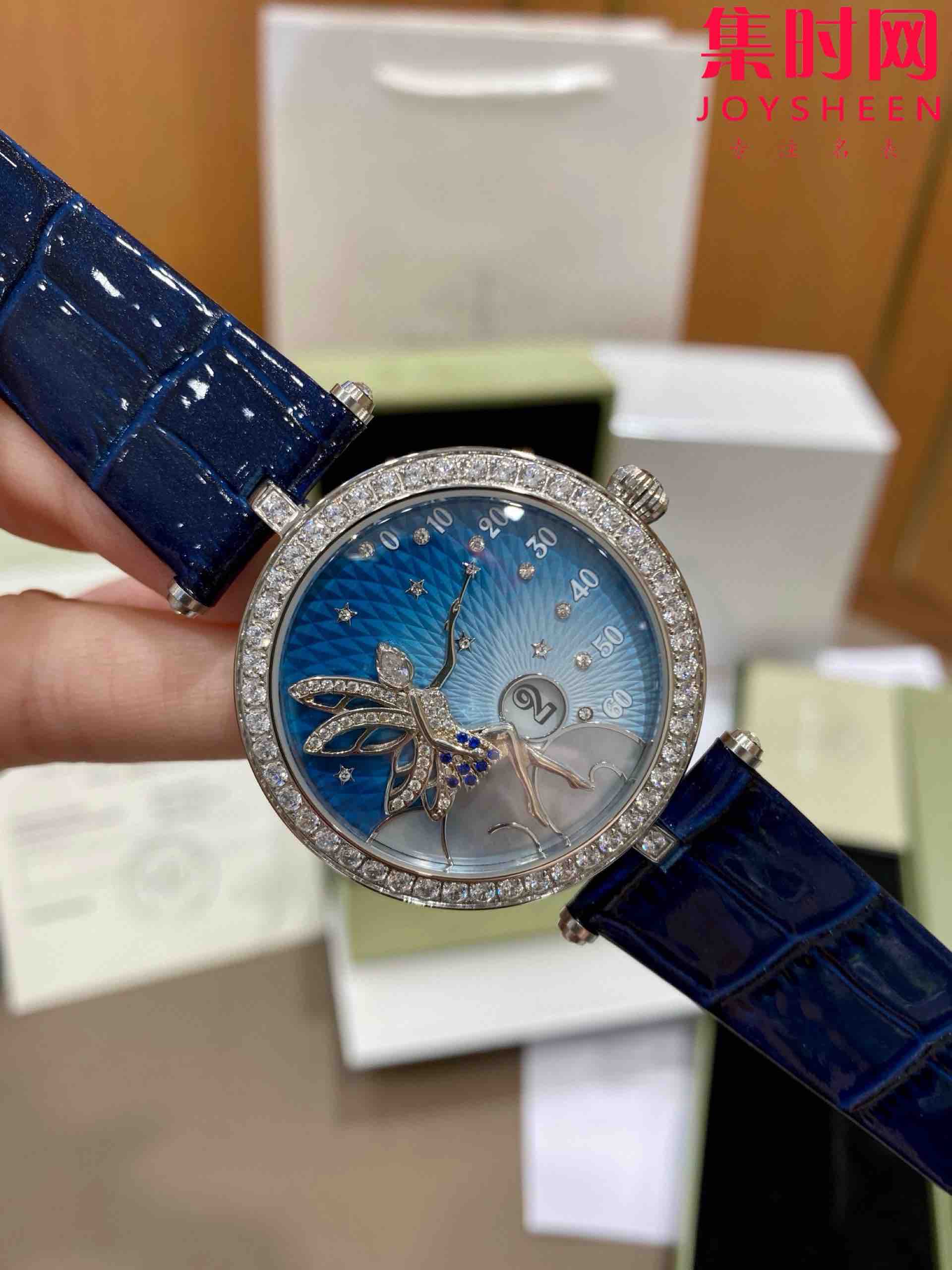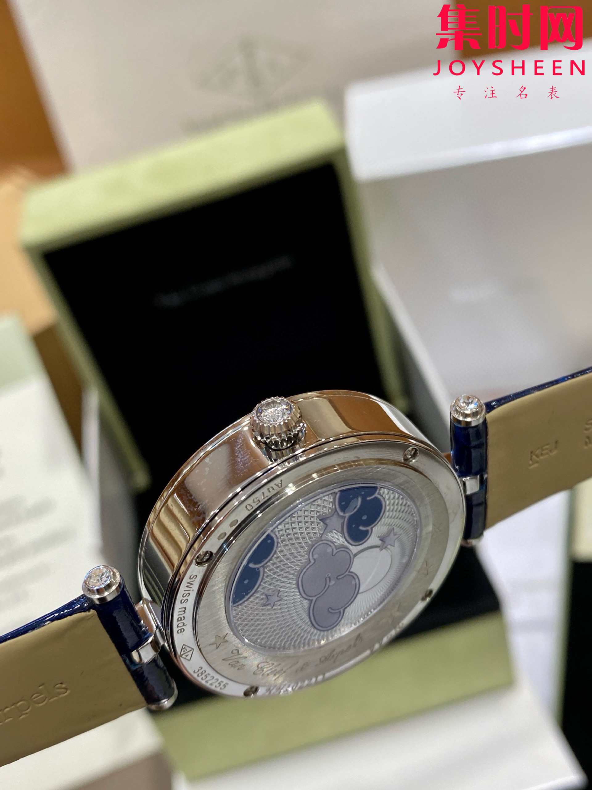 作为守护缪斯与柔美的象征,仙子身穿蓝宝石和钻石连衣裙,见证Poetry of Time时间的诗篇。仙子的翅膀采用绿松石彩绘玻璃珐琅打造而成,与玑镂雕花珍珠母贝及镶嵌钻石演绎的璀璨星空相互辉映。 仙子优雅地静坐于云朵之上,在逆跳机芯的配合下挥舞魔法棒指示分钟。月亮指示珍珠母贝视窗中的小时,散发柔和宁静的光晕。