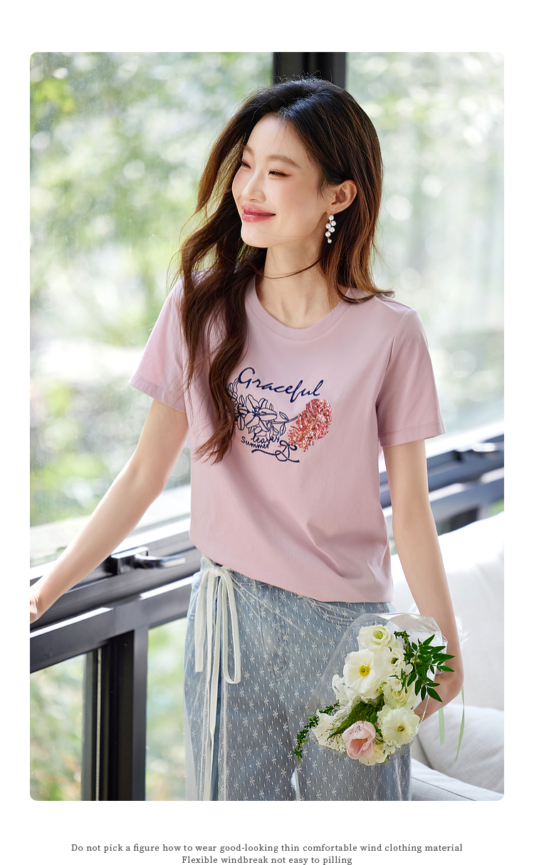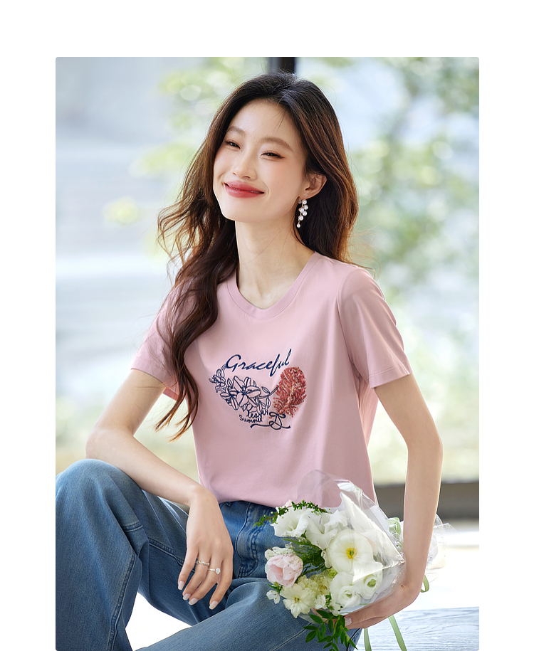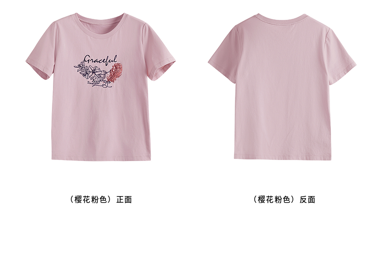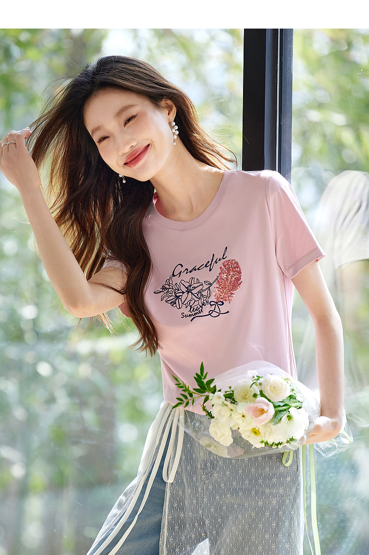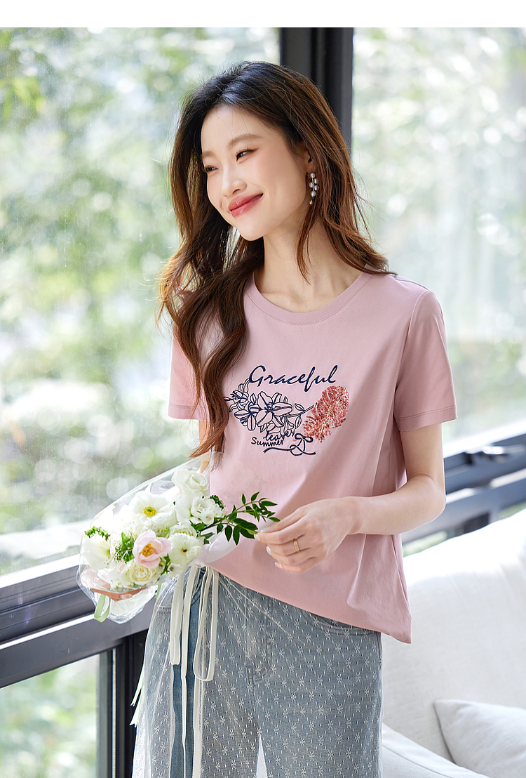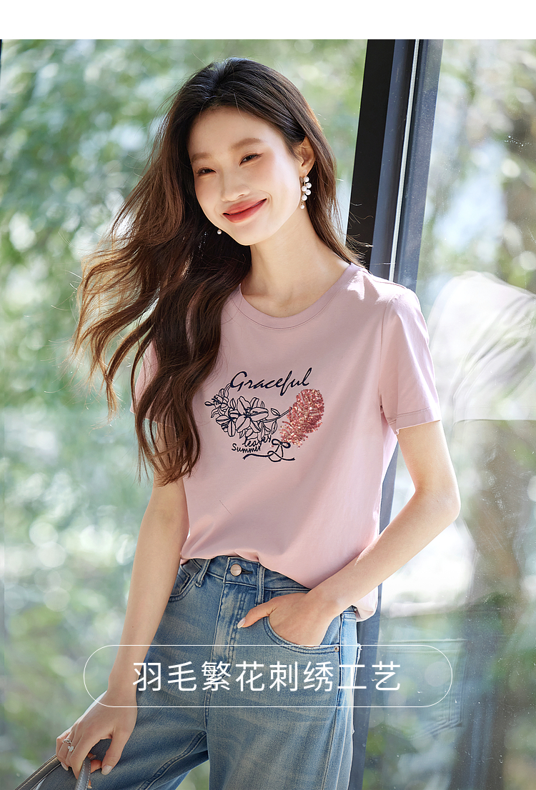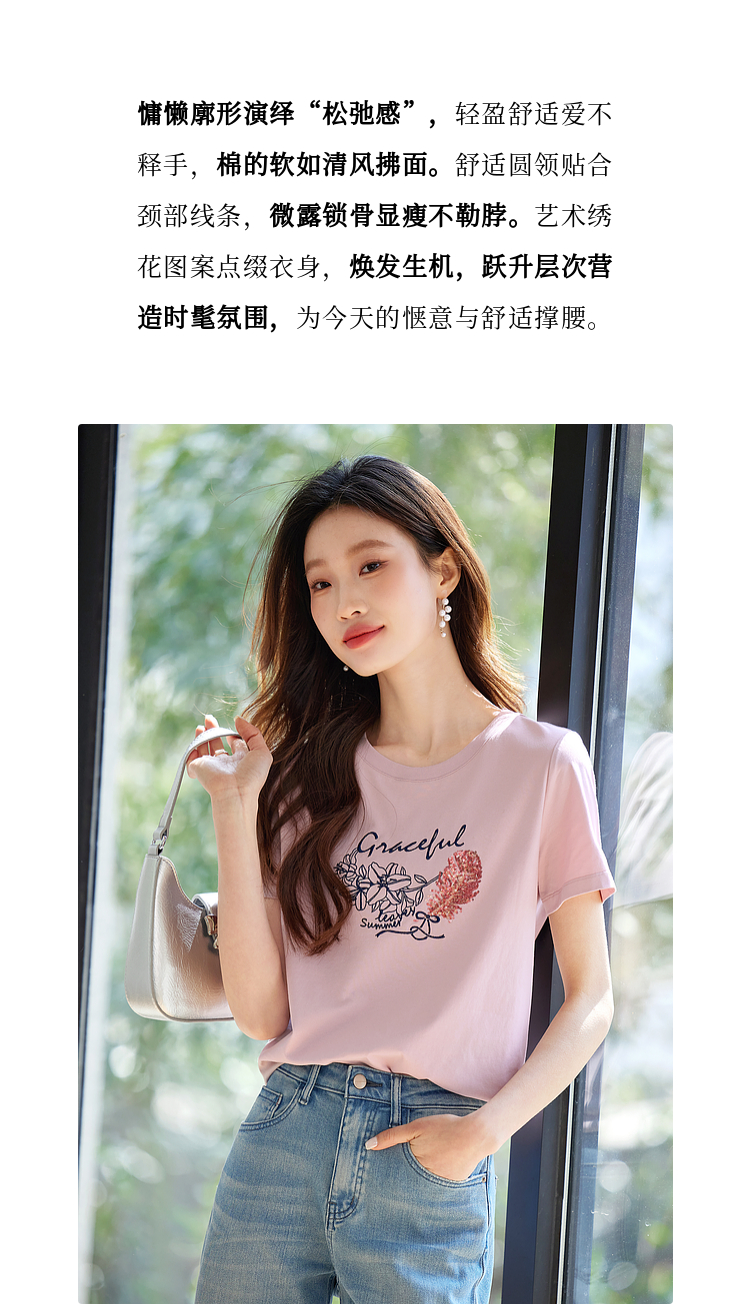 【初夏新品】熙世界优雅百搭透气70%棉25夏季新款圆领T恤女休闲印花女士上衣t