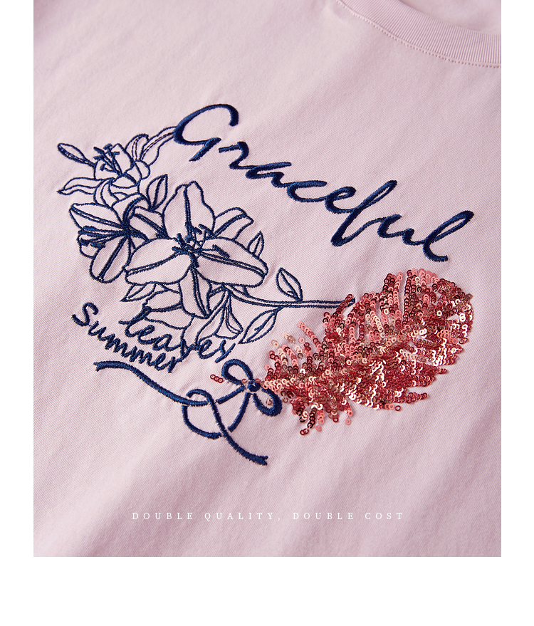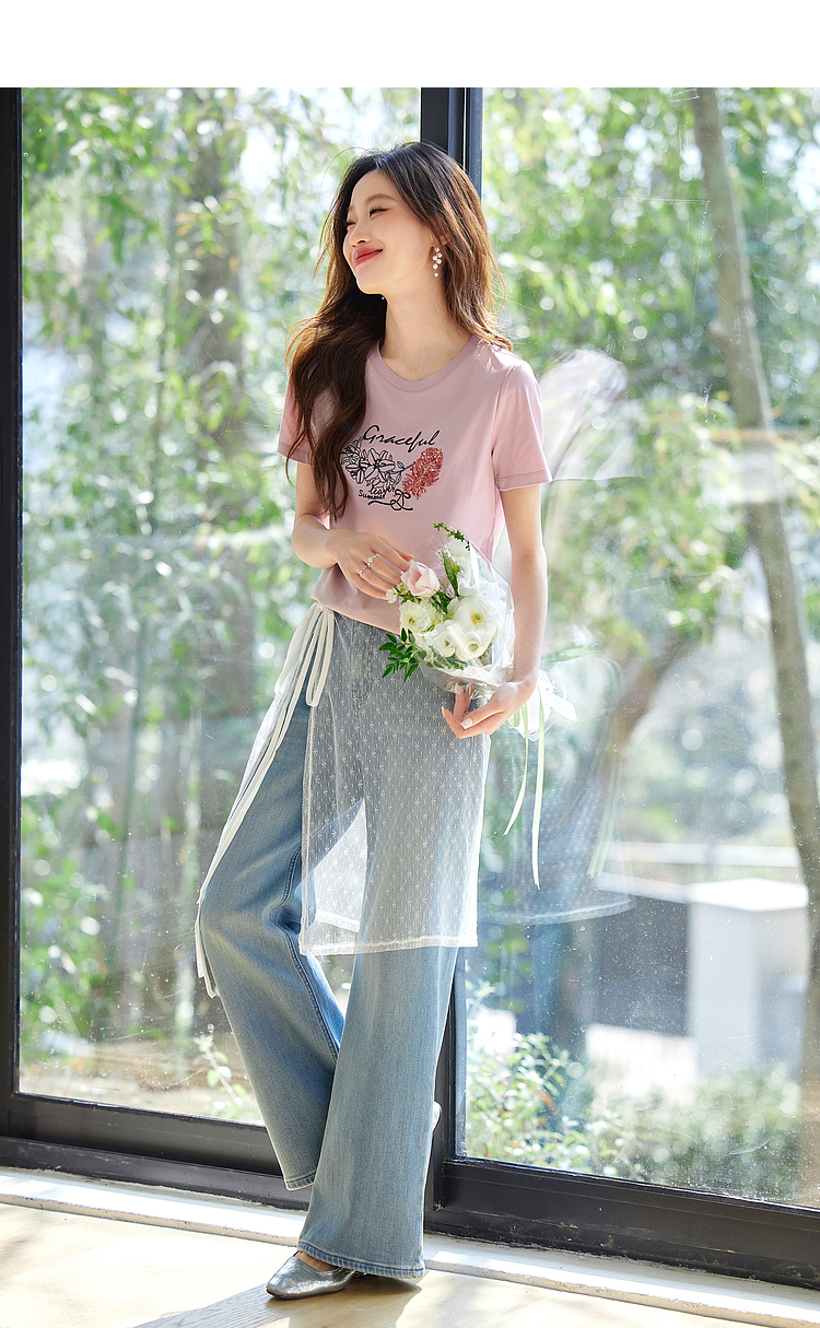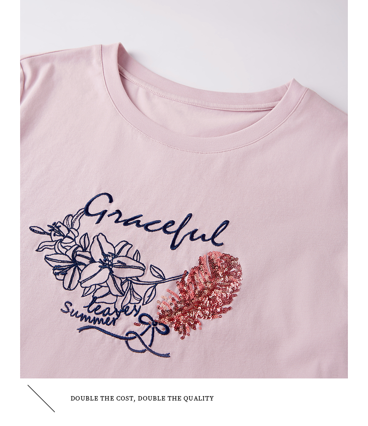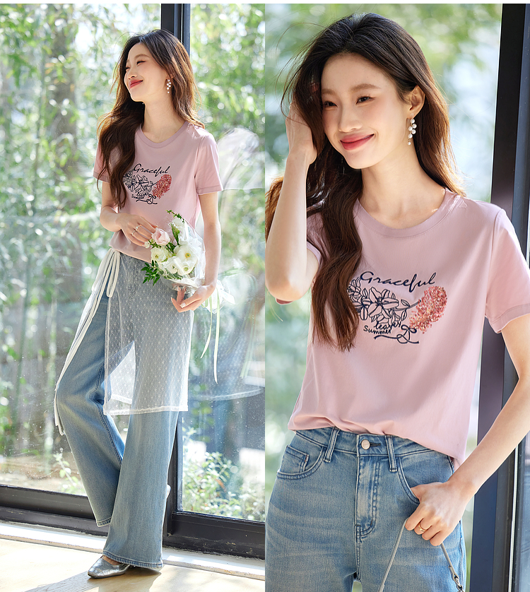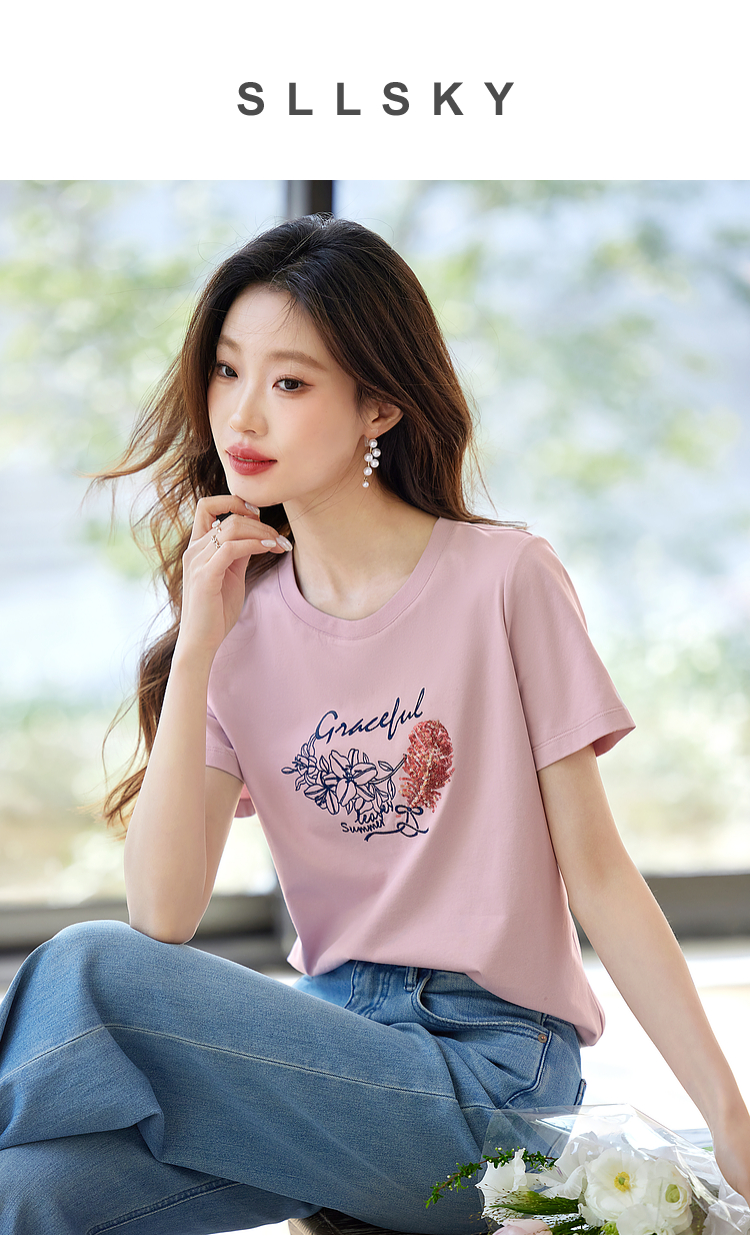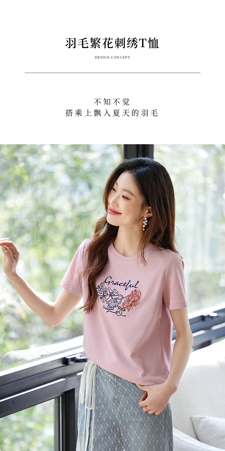 【初夏新品】熙世界优雅百搭透气70%棉25夏季新款圆领T恤女休闲印花女士上衣t