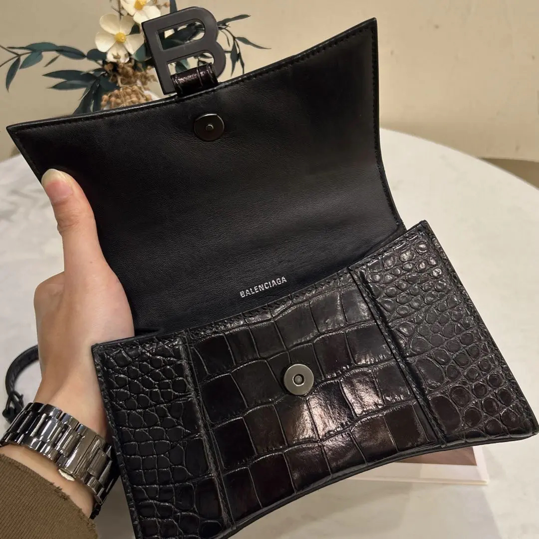 【商品详情】正品二手 巴黎世家 xs号 soblack 鳄鱼压纹 牛皮 沙漏包🪢97新 18x13 。配件:肩带。拍照绝美