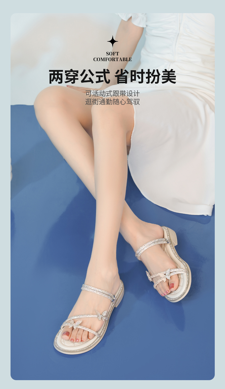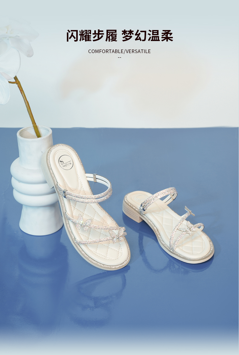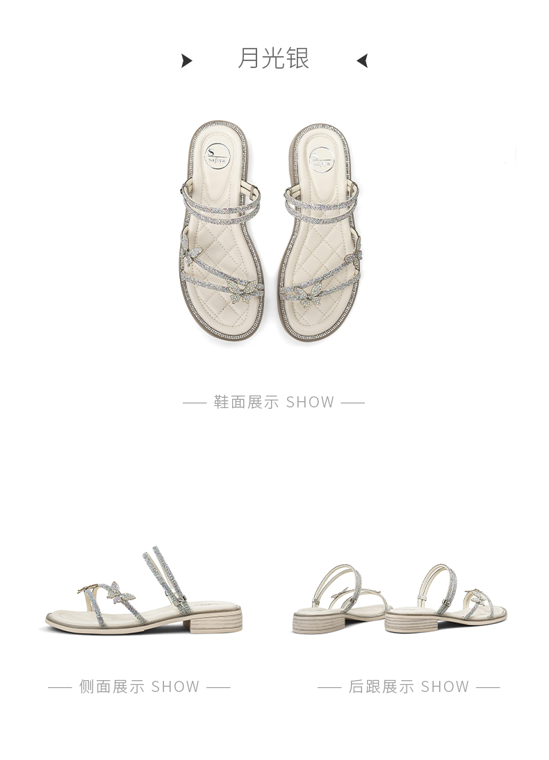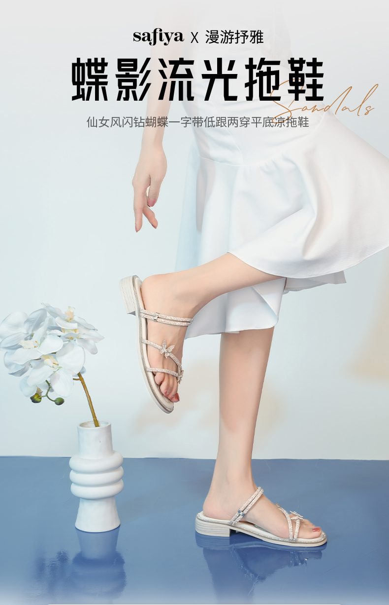 预售7天|Safiya/索菲娅2025仙女风闪钻蝴蝶一字带低跟两穿平底凉拖鞋 SFD2110410