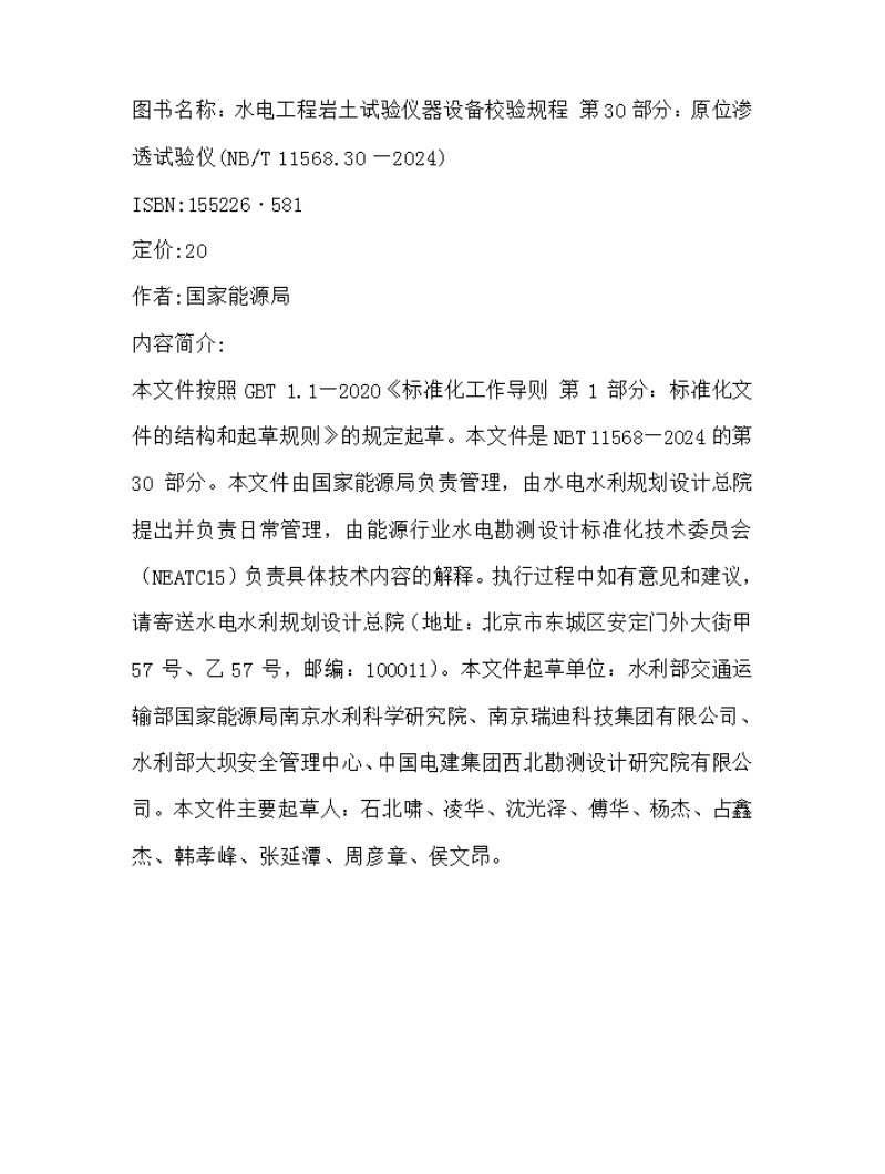 水电工程岩土试验仪器设备校验规程 第30部分:原位渗透试验仪(NB/T 11568.30 —2024)