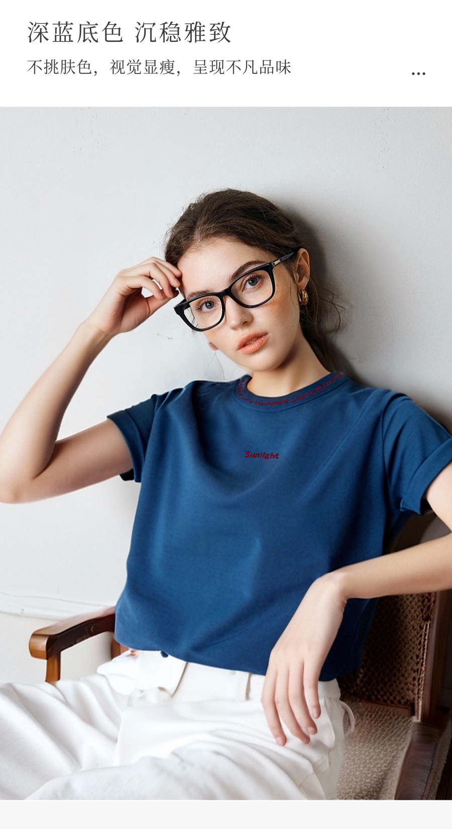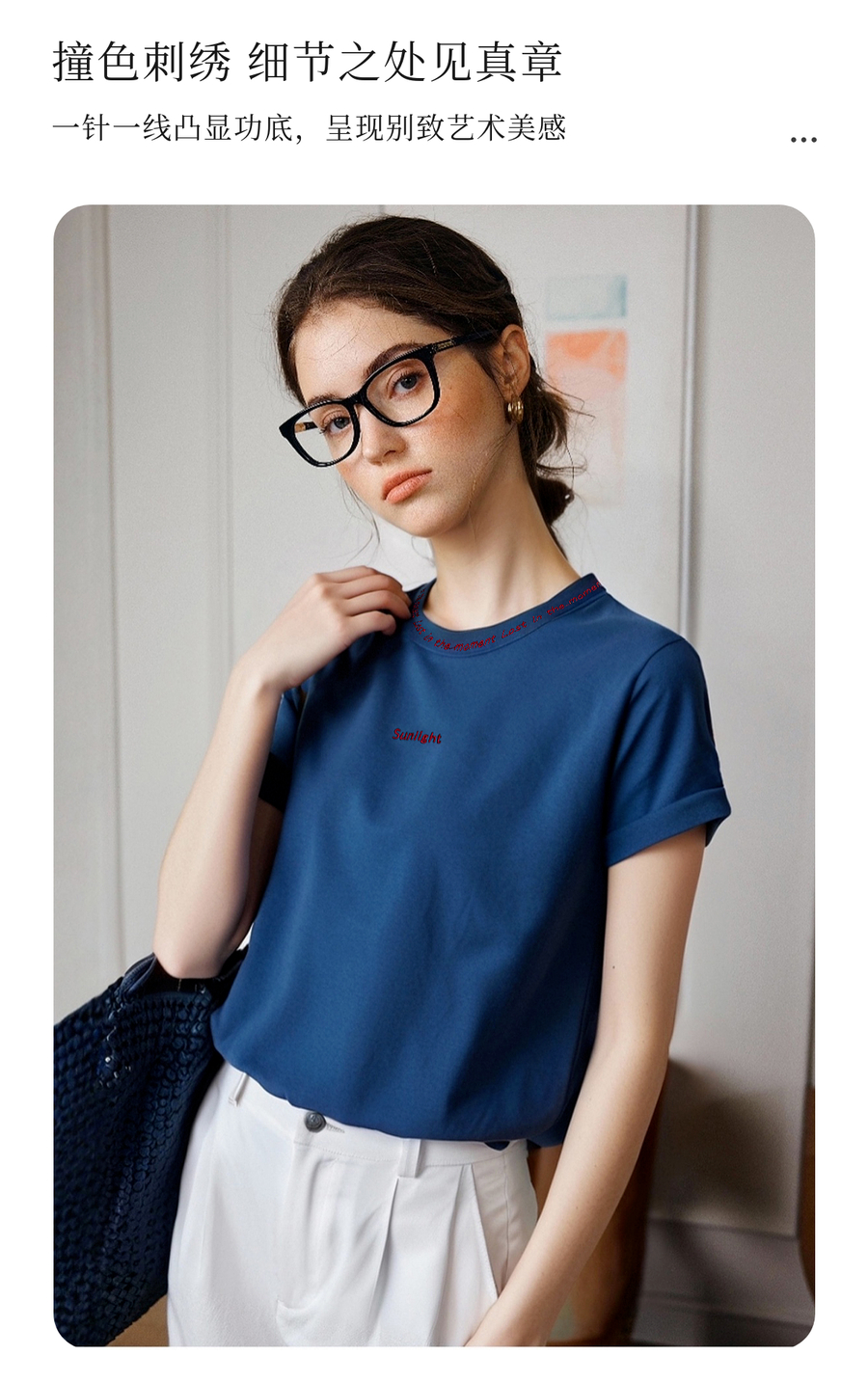 OLrain欧芮儿圆领撞色刺绣短袖百搭T恤女夏 季2025新款深蓝色上衣