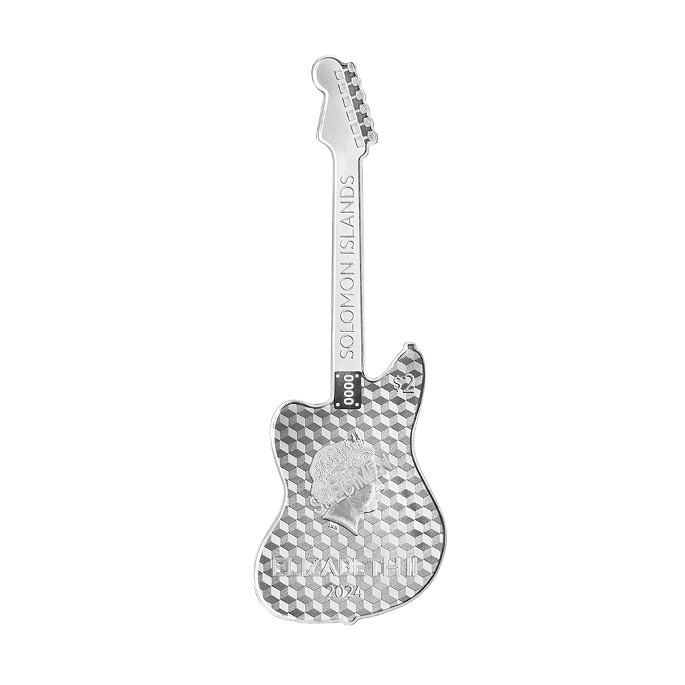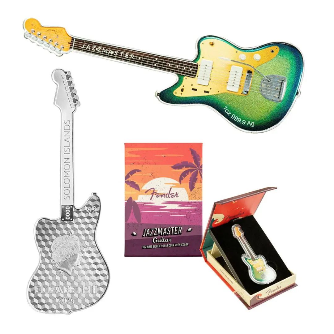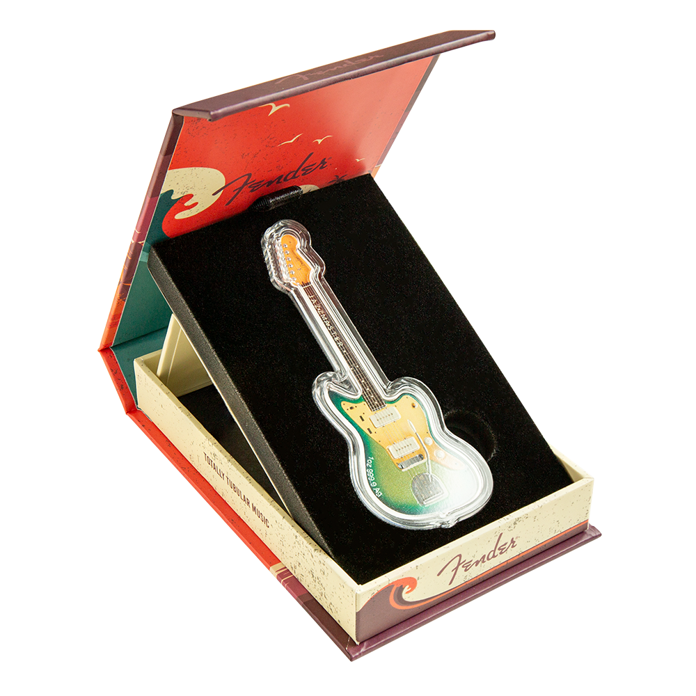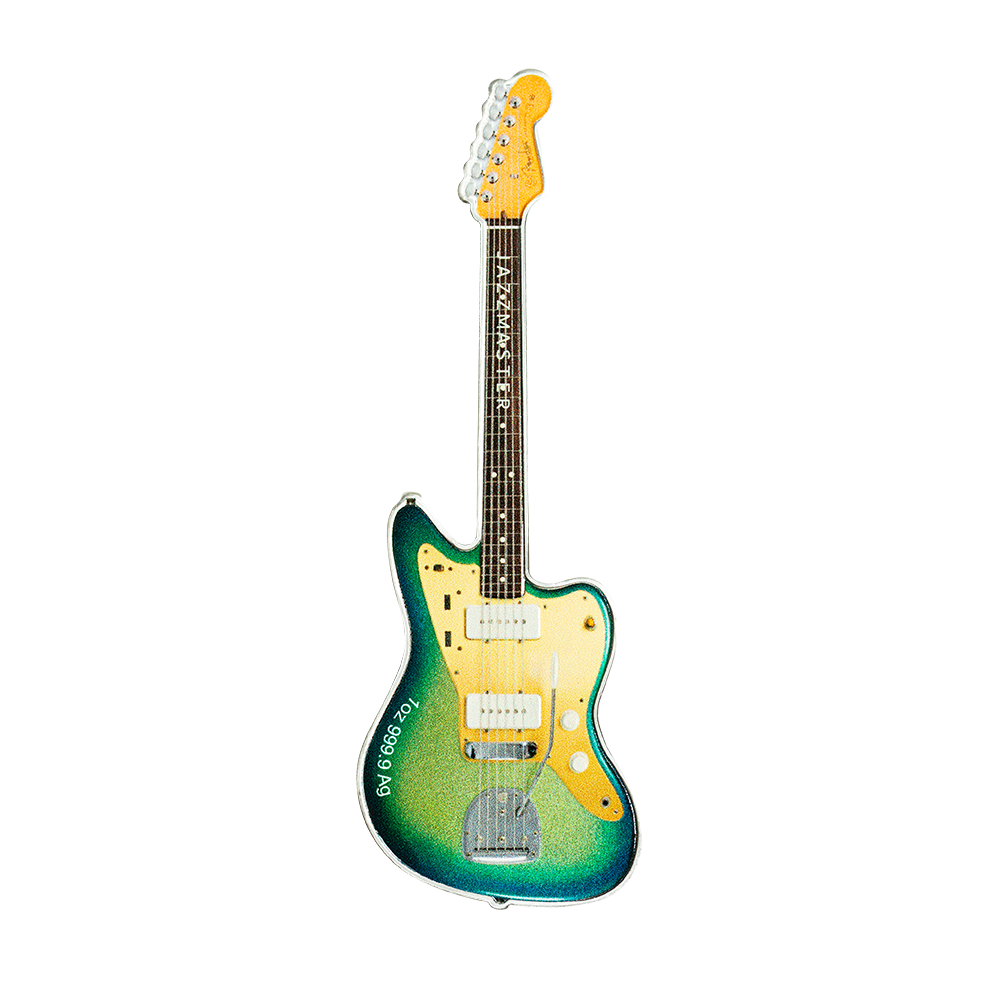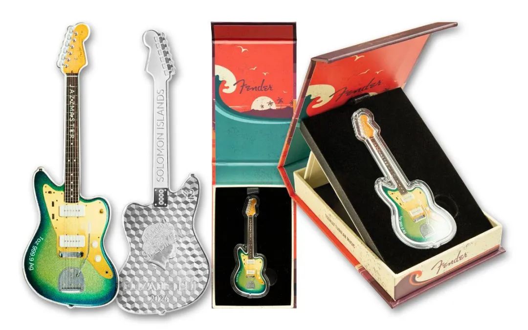 背面完整复刻Fender出产的Jazzmaster吉他,造型逼真,具有冲击力的配色极富美感,并且标有纯银1盎司含量。