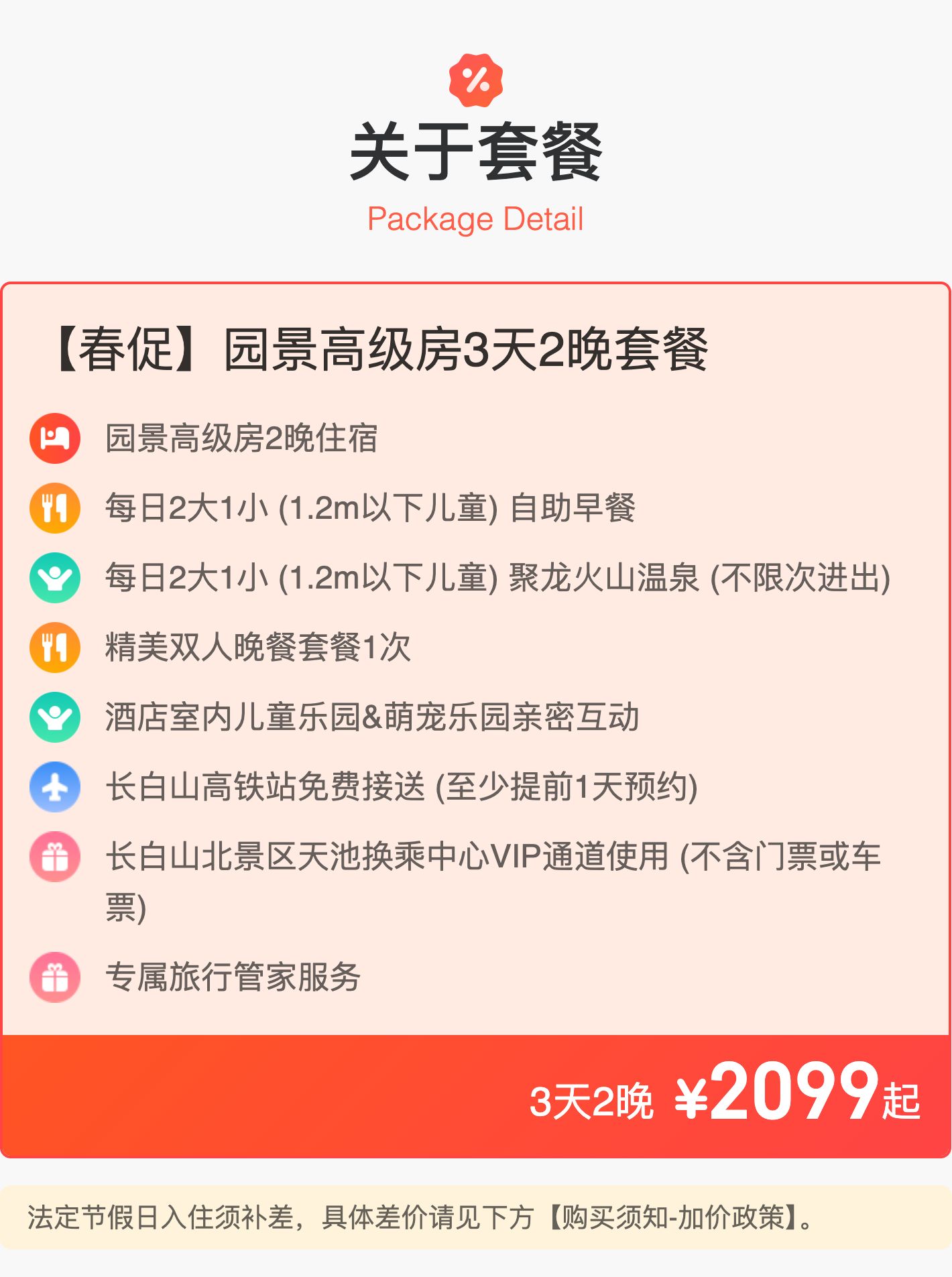 3天2晚【长白山温泉皇冠假日酒店】入住园景高级房,享每日温泉畅泡、双人晚餐、萌宠乐园互动及儿童乐园,还有高铁站免费接驳服务~