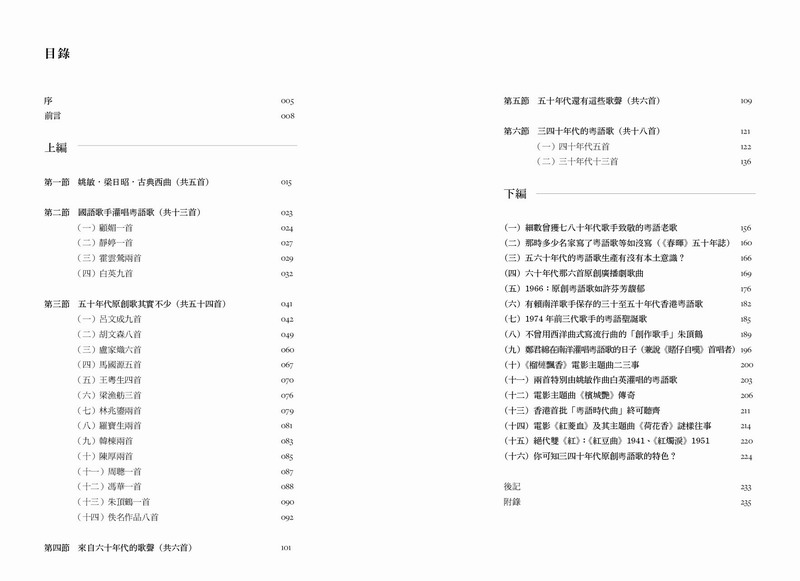 本書分上、下編兩個部份。上編為黃志華上傳到網上平台的粵語老歌所附的短片文字介紹,短片數量共有九十二個。讀者可掃描短片二維碼,即時觀賞及聆聽相關粵語老歌;下編收錄黃志華近年在網上發表的有關粵語老歌的論述文章,共有十六篇。當中更附有珍貴的圖片,包括當年刊於舊報章的歌譜歌詞、電影歌曲宣傳稿,以及複印自隨唱片附贈的歌紙等。