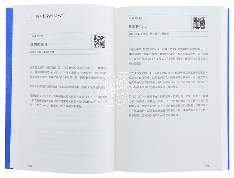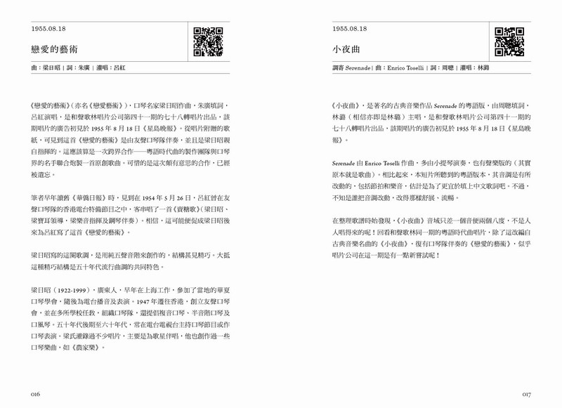 從前,大家很少有機會聆聽半世紀以至八九十年前的歌曲,一來缺乏傳播媒介,二來粵語歌樂壇總是帶着「荒漠」的標籤,根本無人問津。本書作者、資深中文歌曲評論人黃志華,三十年來致力研究香港早期粵語流行曲,自2011年開始於影片和音樂平台上傳粵語老歌,至今上傳逾九十首,皆是珍貴的歷史錄音資料。今天,大家有機會親耳聽聽這些具體聲響,感受舊日音樂界人士在粵語歌製作及創作上的努力。