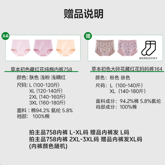 【赠品说明】 拍主品758内裤【 L-XL码】 赠品164内裤发【L码】 拍主品758内裤 【2XL-3XL码】 赠品164内裤发【XL码】