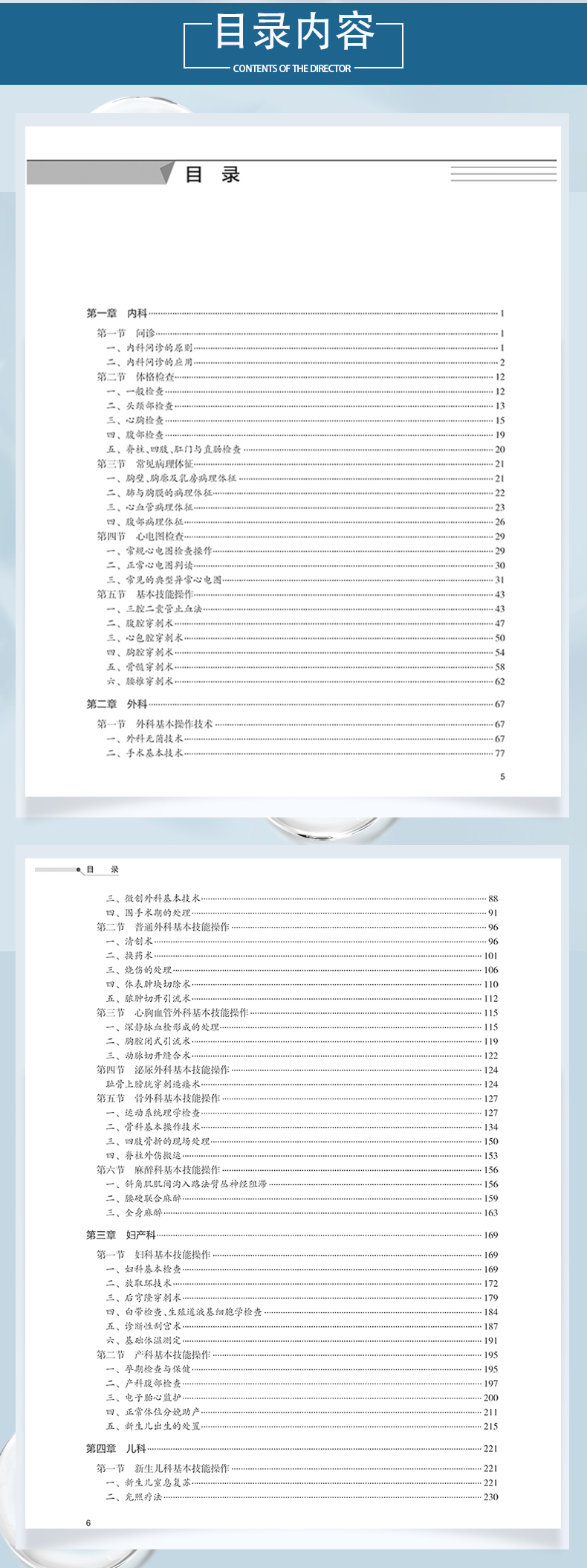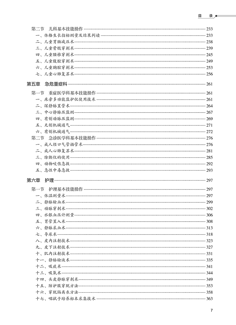 第一章内科/1 第一节问诊/1 一、内科问诊的原则/1 二、内科问诊的应用/2 第二节体格检查/12 一、一般检查/12 二、头颈部检查/13 三、心胸检查/15 四、腹部检查/19 五、脊柱、四肢、肛门与直肠检查/20 第三节常见病理体征/21 一、胸壁、胸廓及乳房病理体征/21 二、肺与胸膜的病理体征/22 三、心血管病理体征/23 四、腹部病理体征/26 第四节心电图检查/29 一、常规心电图检查操作/29 二、正常心电图判读/30 三、常见的典型异常心电图/31 第五节基本技能操作/43 一、三腔二囊管止血法/43 二、腹腔穿刺术/47 三、心包腔穿刺术/50 四、胸腔穿刺术/54 五、骨髓穿刺术/58 六、腰椎穿刺术/62 第二章外科/67 第一节外科基本操作技术/67 一、外科无菌技术/67 二、手术基本技术/77 三、微创外科基本技术/88 四、围手术期的处理/91 第二节普通外科基本技能操作/96 一、清创术/96 二、换药术/101 三、烧伤的处理/106 四、体表肿块切除术/110 五、脓肿切开引流术/112 第三节心胸血管外科基本技能操作/115 一、深静脉血栓形成的处理/115 二、胸腔闭式引流术/119 三、动脉切开缝合术/122 第四节泌尿外科基本技能操作/124 耻骨上膀胱穿刺造瘘术/124 第五节骨外科基本技能操作/127 一、运动系统理学检查/127 二、骨科基本操作技术/134 三、四肢骨折的现场处理/150 四、脊柱外伤搬运/153 第六节麻醉科基本技能操作/156 一、斜角肌肌间沟入路法臂丛神经阻滞/156 二、腰硬联合麻醉/159 三、全身麻醉/163 第三章妇产科/169 第一节妇科基本技能操作/169 一、妇科基本检查/169 二、放取环技术/172 三、后穹隆穿刺术/179 四、白带检查、生殖道液基细胞学检查/184 五、诊断性刮宫术/187 六、基础体温测定/191 第二节产科基本技能操作/195 一、孕期检查与保健/195 二、产科腹部检查/197 三、电子胎心监护/200 四、正常体位分娩助产/211 五、新生儿出生的处置/215 第四章儿科/221 第一节新生儿科基本技能操作/221 一、新生儿窒息复苏/221 二、光照疗法/230 第二节儿科基本技能操作/233 一、体格生长指标测量及结果判读/233 二、儿童胃肠减压术/238 三、儿童骨髓穿刺术/239 四、儿童腰椎穿刺术/245 五、儿童腹腔穿刺术/249 六、儿童胸腔穿刺术/253 七、儿童心肺复苏术/256 第五章急危重症科/261 第一节重症医学科基本技能操作/261 一、床旁多功能监护仪使用技术/261 二、深静脉置管术/264 三、中心静脉压监测/267 四、有创动脉压监测/269 五、无创机械通气/271 六、有创机械通气/272 第二节急诊医学科基本技能操作/276 一、成人经口气管插管术/276 二、成人心肺复苏术/281 三、除颤仪的使用/285 四、动物咬伤急救/292 五、急性中毒急救/293 第六章护理/297 第一节护理基本技能操作/297 一、体温测量术/297 二、静脉输血术/299 三、动脉穿刺术/302 四、水银血压计测量/306 五、胃管置入术/308 六、静脉采血术/313 七、导尿术/318 八、皮内注射技术/323 九、皮下注射技术/327 十、肌内注射技术/331 十一、静脉输液术/335 十二、吸痰术/341 十三、吸氧术/344 十四、头皮静脉穿刺术/349 十五、防护服穿脱方法/353 十六、穿脱隔离衣方法/358 十七、咽拭子培养标本采集技术/363 十八、血源性病原体职业暴露后处理方法/365 第二节护理其他技能操作/367 一、自动洗胃机洗胃术/367 二、小儿鼻胃插管术/372 三、小儿灌肠术/376 四、经外周静脉穿刺的中心静脉导管(PICC)置管术/380 第七章其他专科/385 第一节神经科专科检查与处理技术/385 一、神经系统体格检查/385 二、常见颅脑损伤的处理技术/393 第二节耳鼻咽喉科专科检查与处理技术/398 一、耳部检查/398 二、鼻腔、鼻窦检查/403 三、咽喉检查/411 四、鼻出血的处理技术/415 五、喉阻塞的处理技术/418 第三节皮肤科专科检查与处理技术/422 一、真菌直接涂片镜检技术/422 二、变应原检测/424 三、淋球菌镜检技术/426 第四节眼科专科检查与处理技术/427 一、视力检查/427 二、眼压测量/430 三、裂隙灯显微镜检查/434 四、直接检眼镜检查/435 五、眼化学伤的处理技术/437 六、开放性眼外伤的处理技术/438