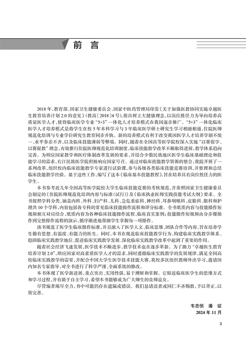 教材内容高度结合少数民族地区实际,紧密结合五年制临床医学专业培养目标,对临床基本技能进行整合,优化教学内容,改革教学方法。主要由理论+技能两部分组成,按照学科分类,有内科、外科、妇科、儿科、急救重症、耳鼻咽喉科、皮肤科、眼科、护理等;包括各专科的理论知识、各种临床技能操作规程、评分标准。教材为纸数融合教材,每章配有教学操作视频和彩图,使读者能够提升学习效果,方便进行学习效果检测、临床熟练运用所学知识。