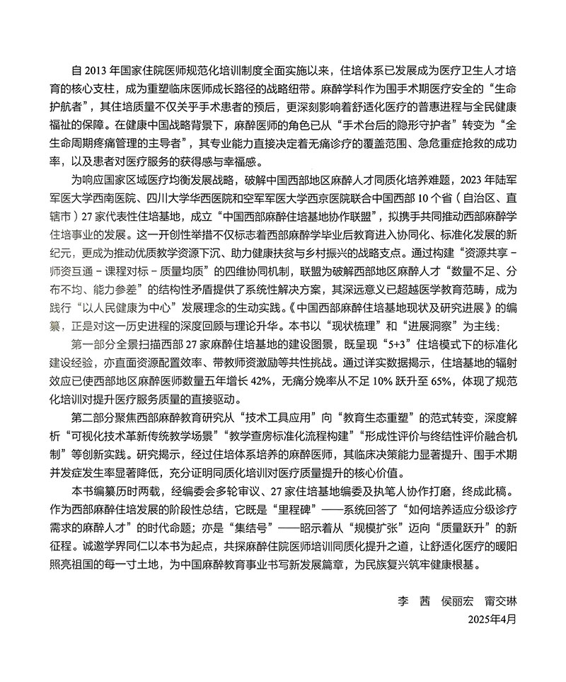 中国西部麻醉住培基地现状及研究进展 甯交琳 李茜 侯丽宏 主编 麻醉住院医师规范化培训的现状及研究进展等 北京大学医学出版社