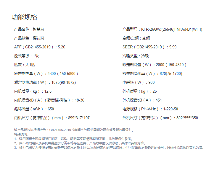 格力·智慧鸟大1匹变频冷暖1级能效挂式空调 KFR-26GW/(26546)FNhAd-B1(WIFI)(含管)(樱花粉)