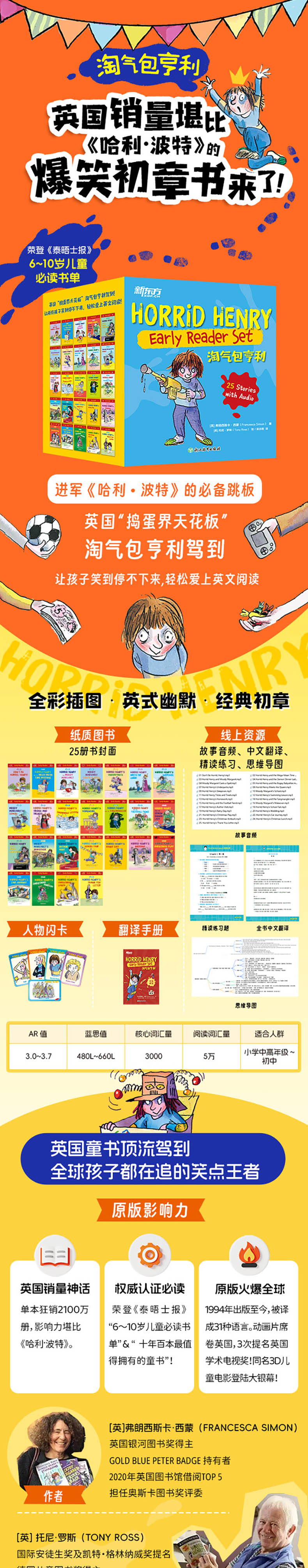弗朗西斯卡·西蒙(Francesca Simon),儿童文学领域的杰出创作者,她的作品深受读者喜爱,收获诸多荣誉,荣获英国银河图书奖、Gold Blue Peter Badge等。2020年,其作品(含《淘气包亨利》系列)在英国图书馆借阅量排名第5位,足见受欢迎程度。同时,她还担任奥斯卡图书奖评委,在童书行业具备一定影响力,以生动有趣的文字为孩子们打造精彩阅读世界。