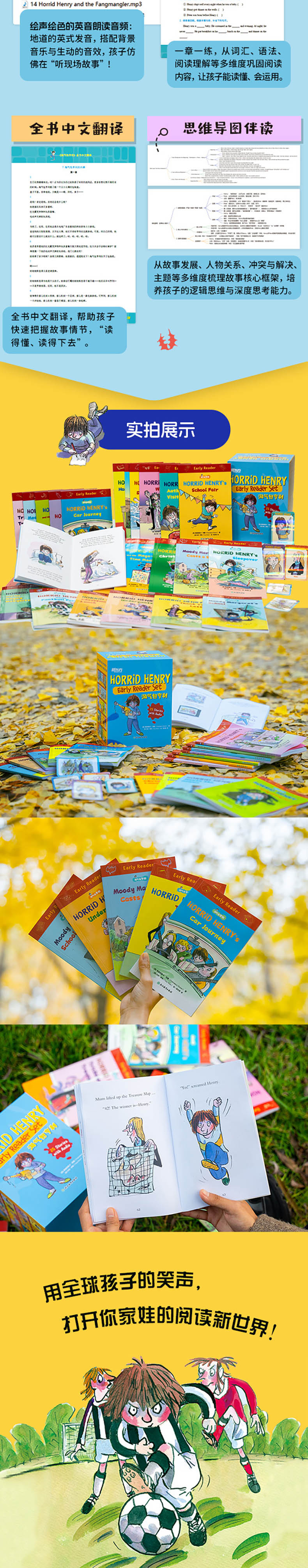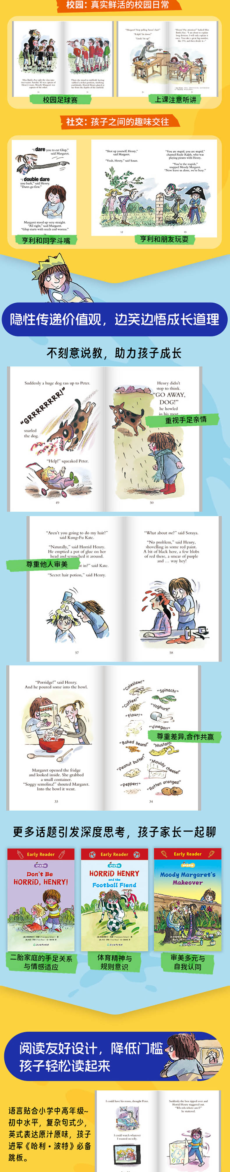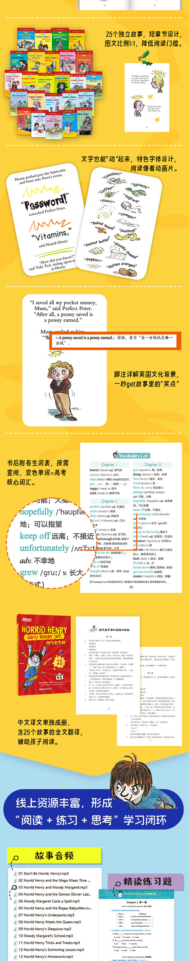 全书为四色全彩插画,图文比例1:1,搭配特色字体设计,阅读体验如同看动画片。每册书后附有生词表,高考核心词汇用变色标记,方便孩子查阅记忆;书中还设有脚注,详解英国文化背景,帮助孩子精准get故事“笑点”。