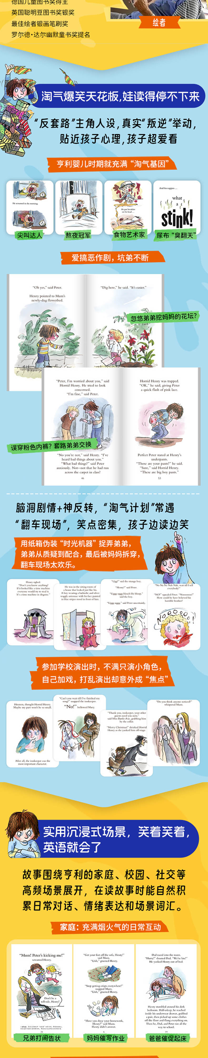 《淘气包亨利》共25册,每册64~88页,以幽默夸张的笔调讲述“捣蛋界天花板”亨利的日常故事。主人公亨利是个满脑袋奇思妙想的小淘气包,他爱搞恶作剧、捉弄弟弟,却也在关键时刻展现出勇敢与担当。故事围绕家庭、校园、社交三大高频场景展开,如兄弟打闹告状、妈妈催写作业、校园足球赛、同学间的趣味斗嘴等,让孩子在爆笑情节中感受真实的成长日常。