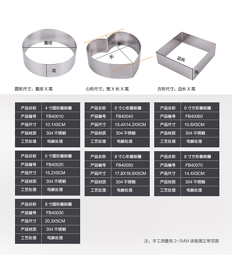 法焙客 8寸圆形慕斯圈 304食品级不锈钢 圆型慕斯蛋糕模具