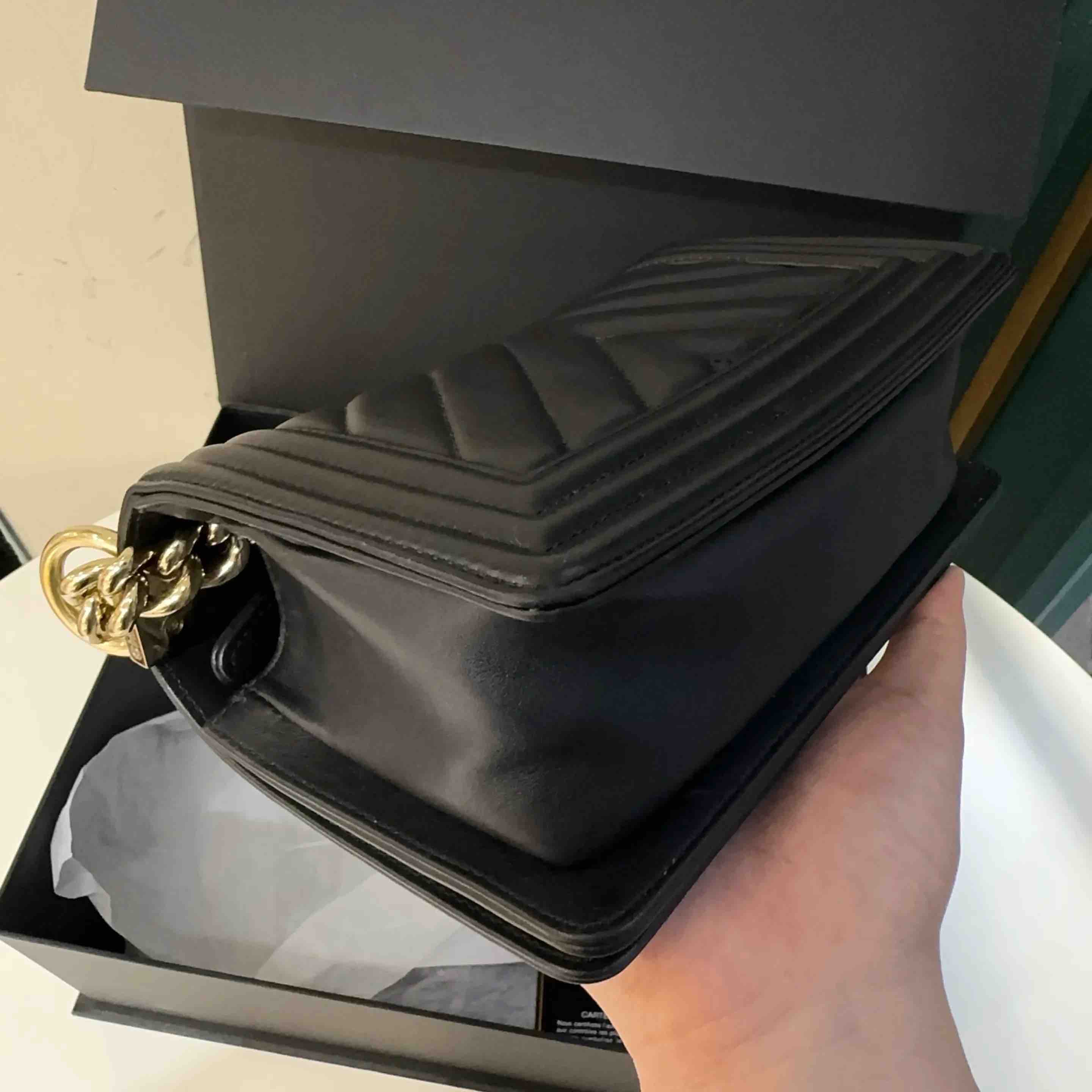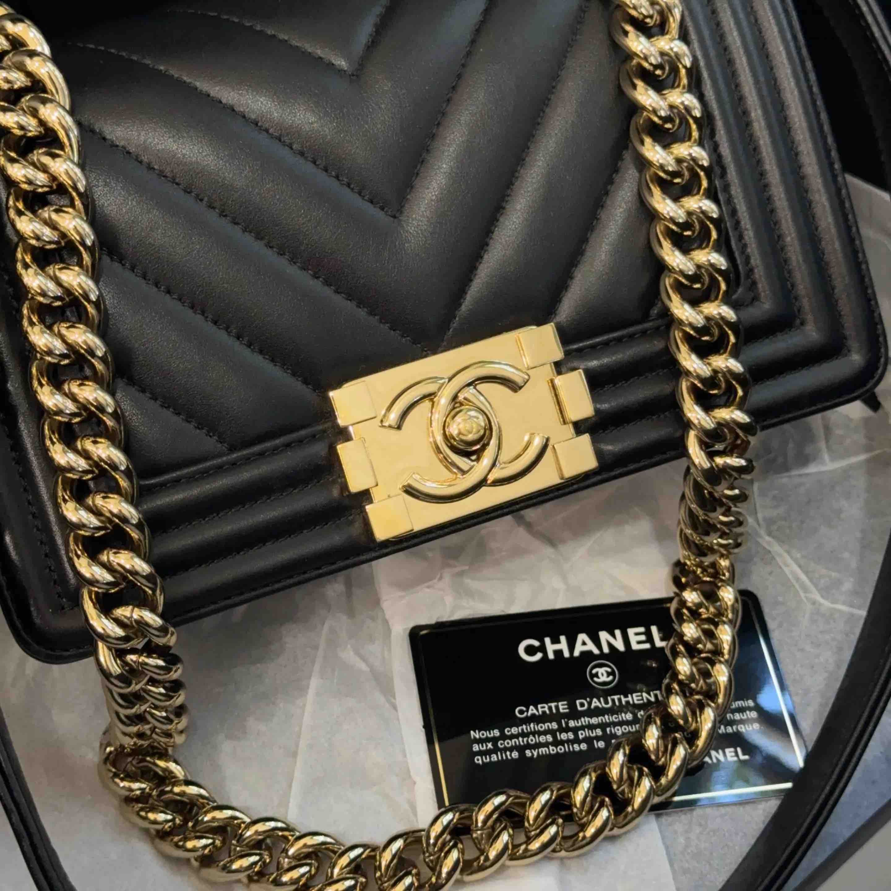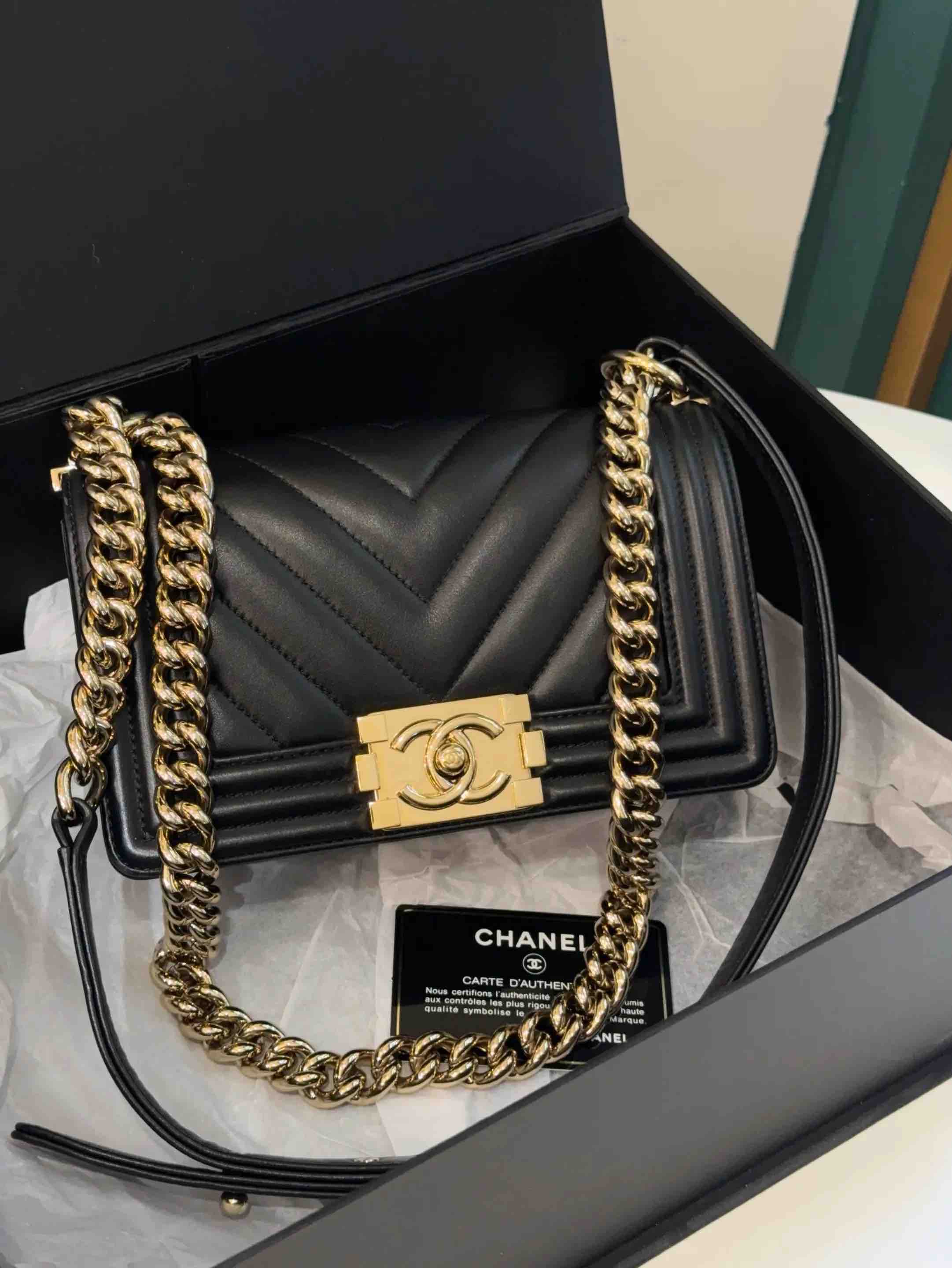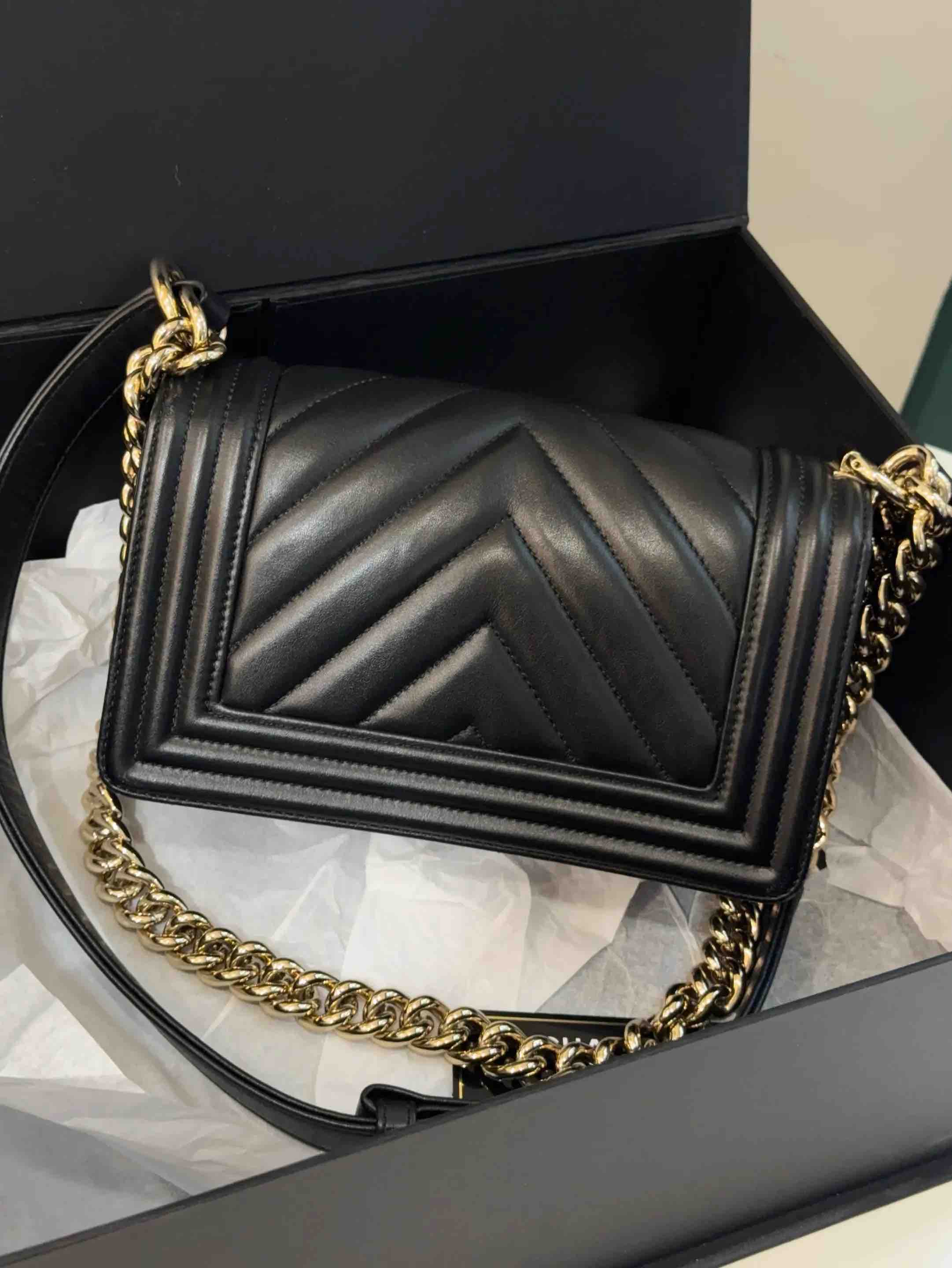 【商品详情】正品二手 CHANEL leboy 小号 V纹 黑金 牛皮 链条包🥳 97新 20*13 镭射27开 配件:卡 盒子。率真个性